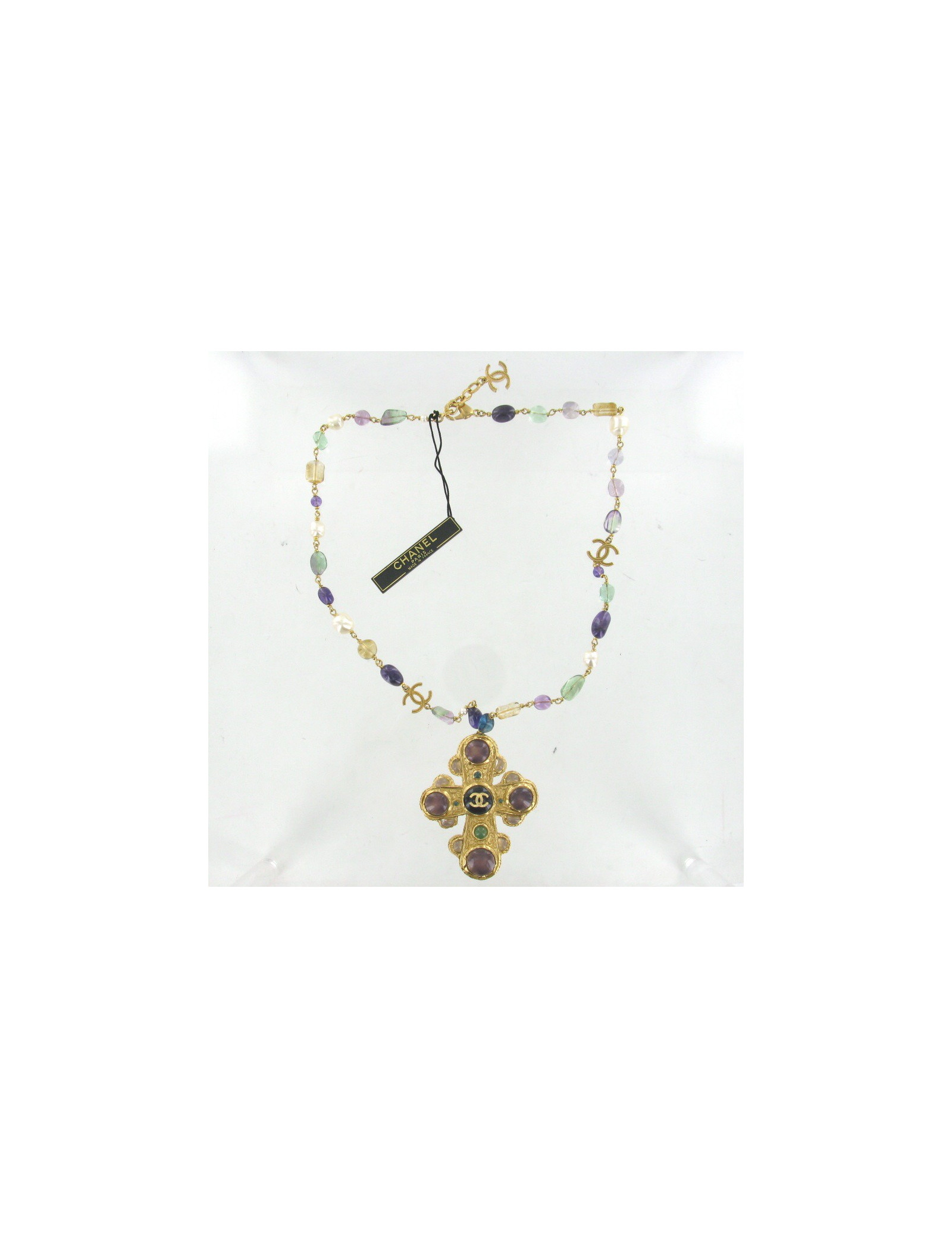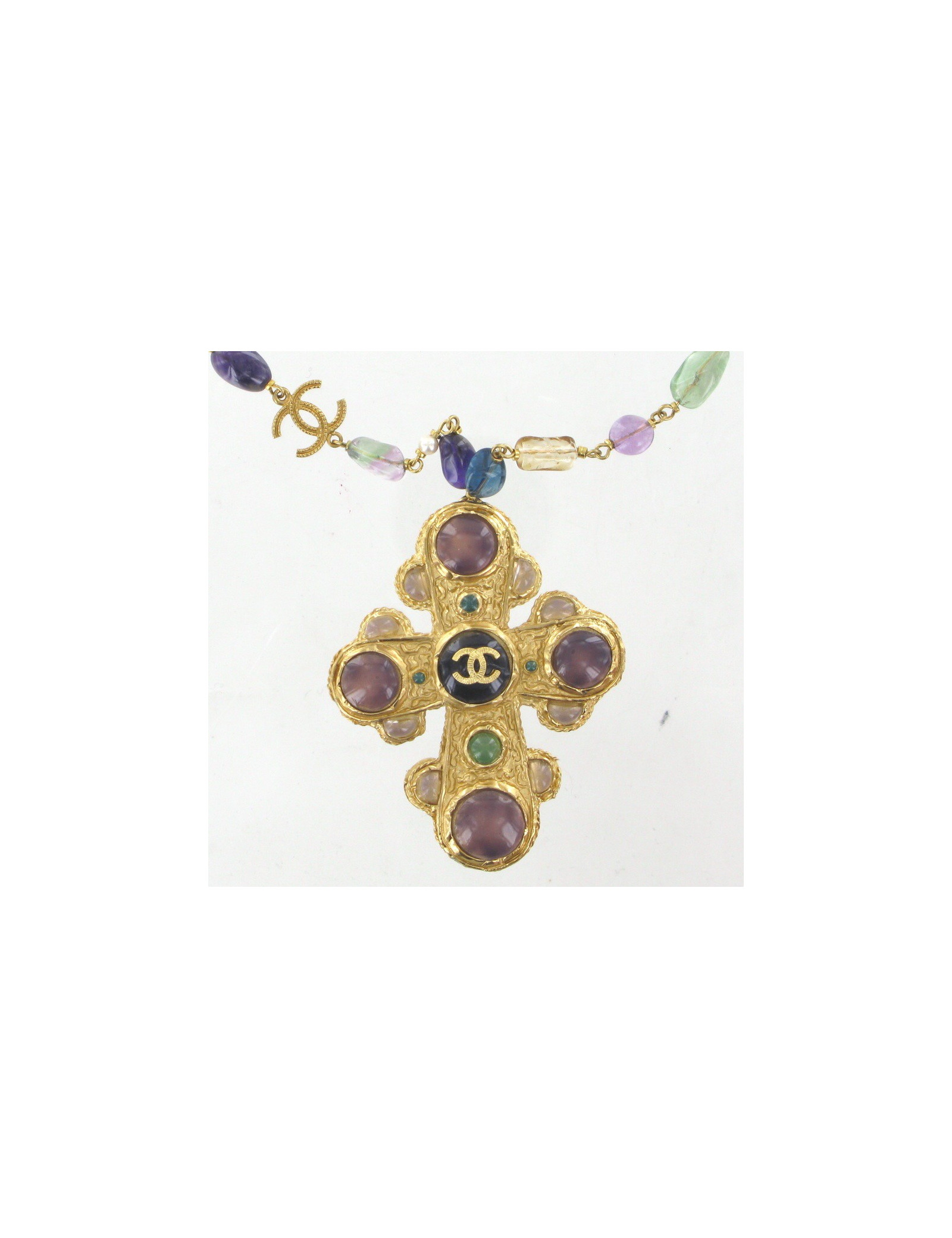 Beautiful cross CHANEL necklace set with multicolored beads. Metal chain pale gold set with white pearls, pearly, green, purple, yellow and CC pale gold. The pendant is a metal cross set with purple, green and transparent cabochons pale gold. the cabochon in the middle is set with a CC pale gold.