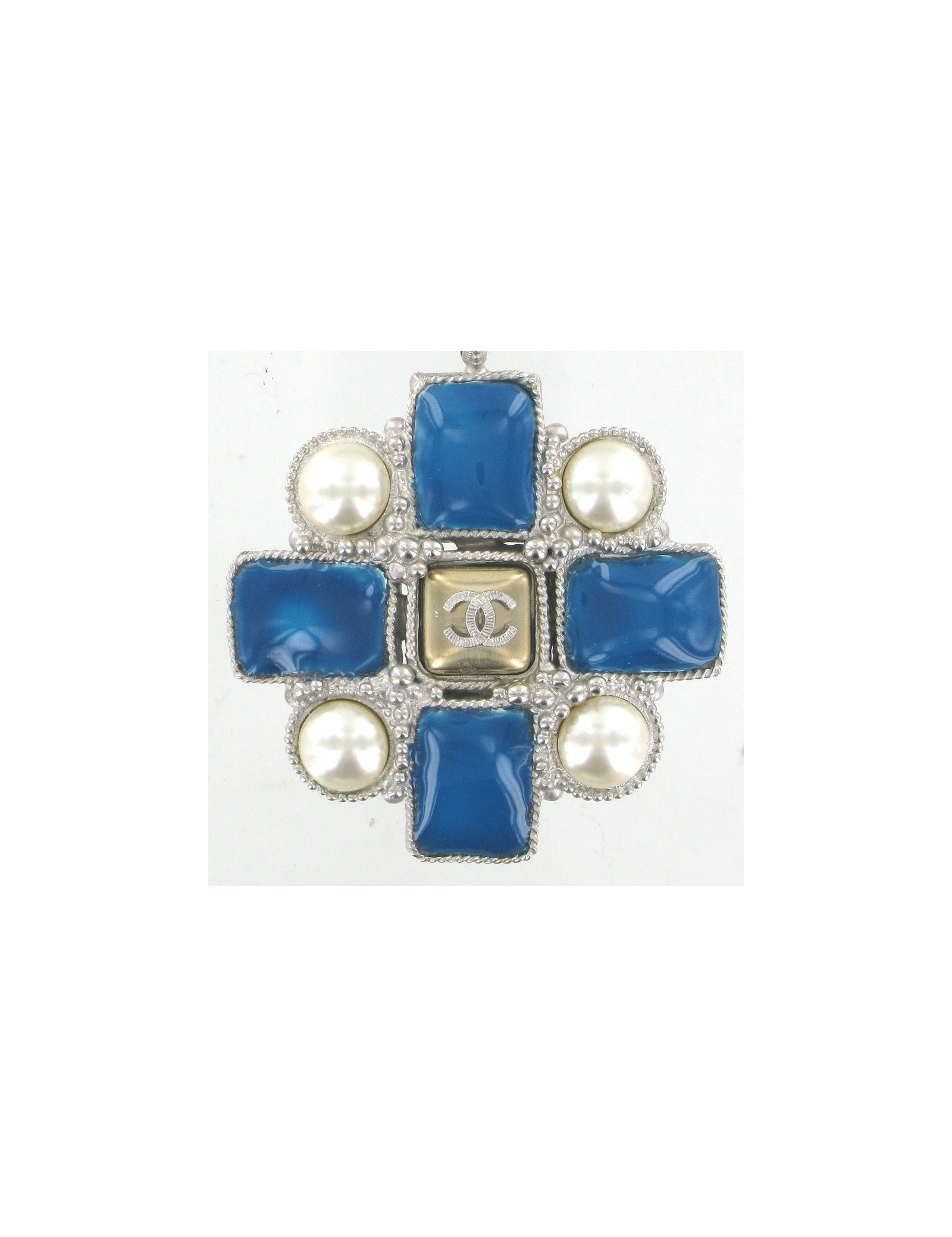 Sublime CHANEL pearls and paste glass cross necklace. The chiseled links chain is Matt silver metal. The pendant is a Matt silver metal cross, set of pearly beads and blue glass paste overseas. Beautiful jewel Couture.