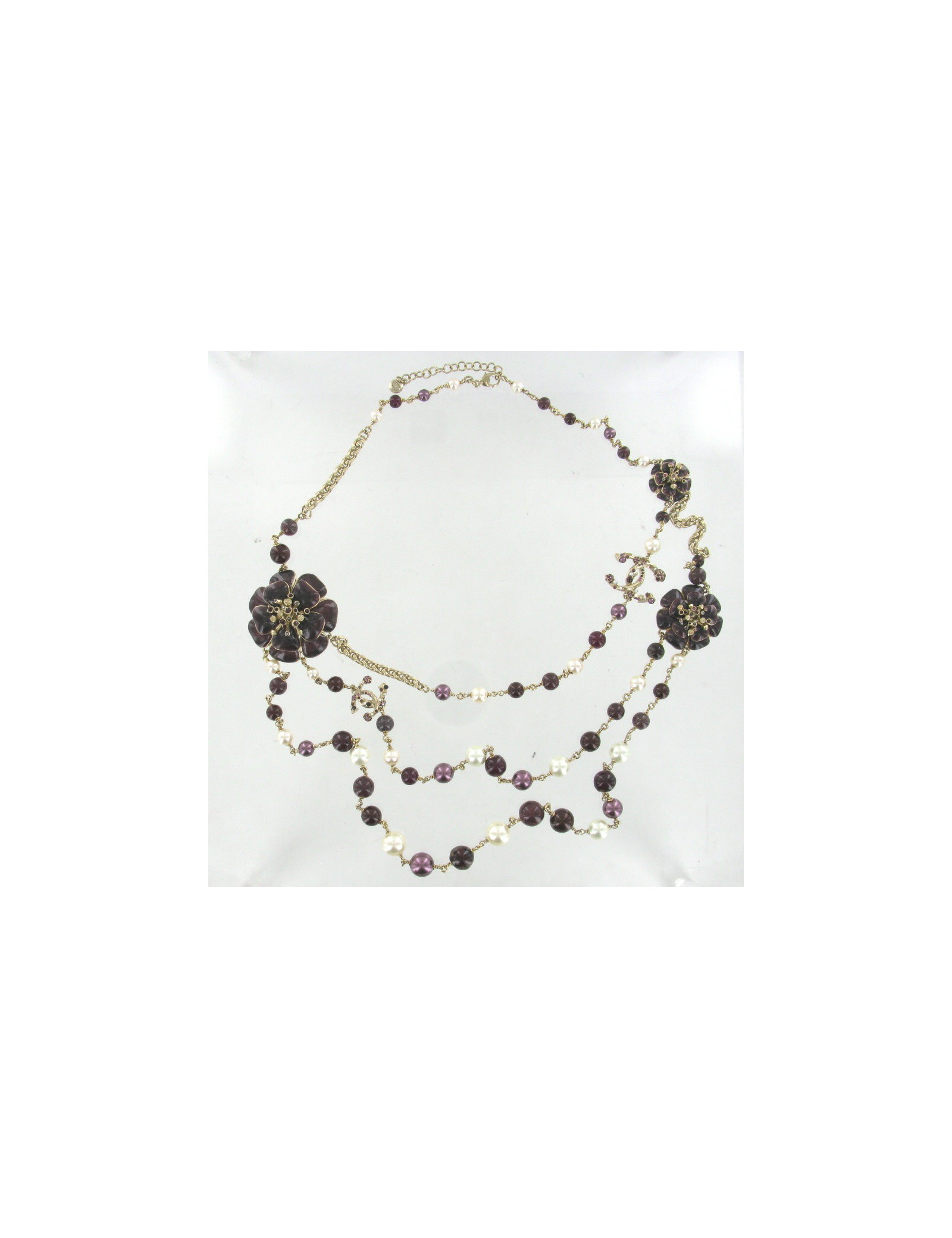 Sublime necklace triple ranks CHANEL. He composed of beads purple, purple and pearly, 3 camellias in different purple sizes set Rhinestones, and 2 CC metal pale gold set with Rhinestones.