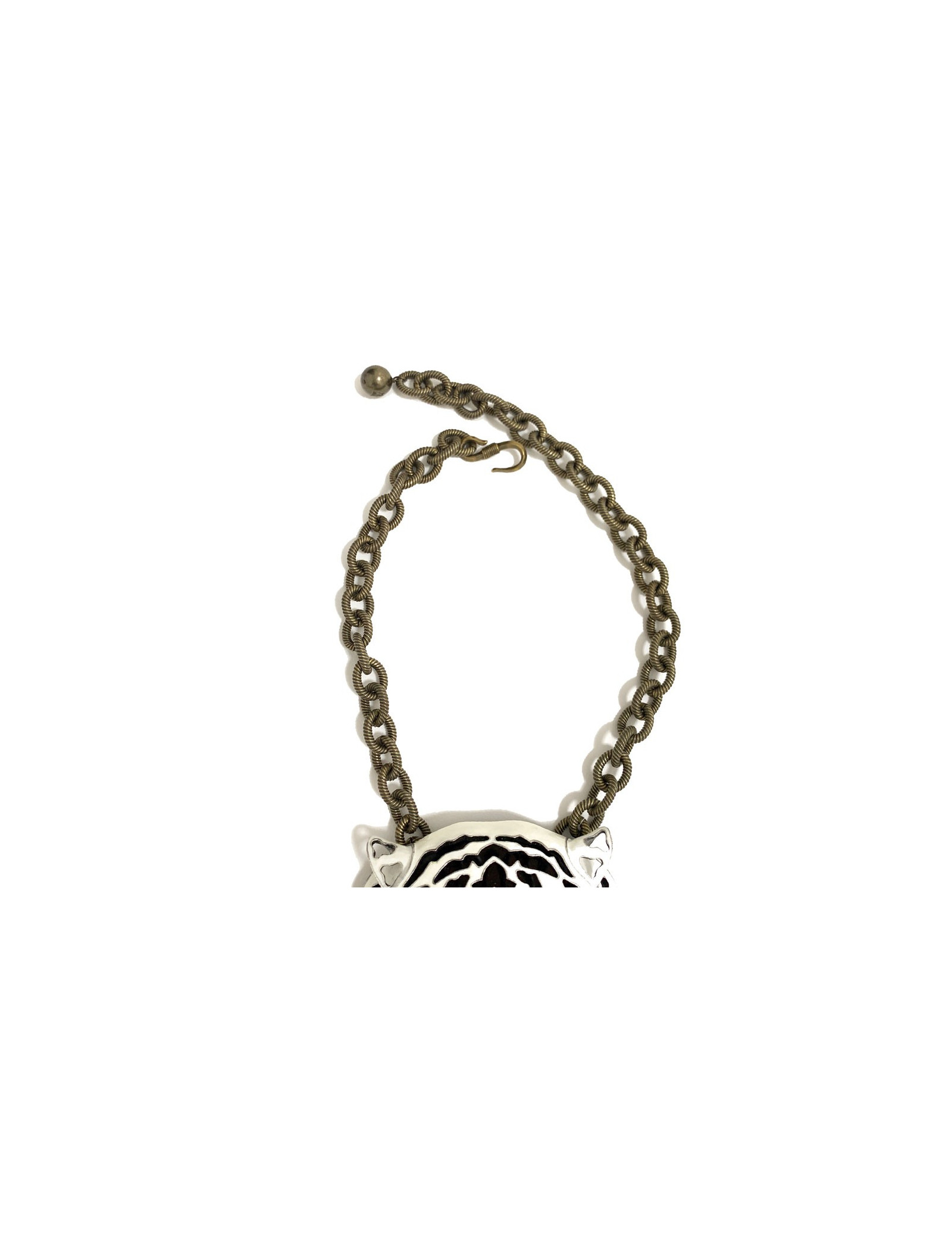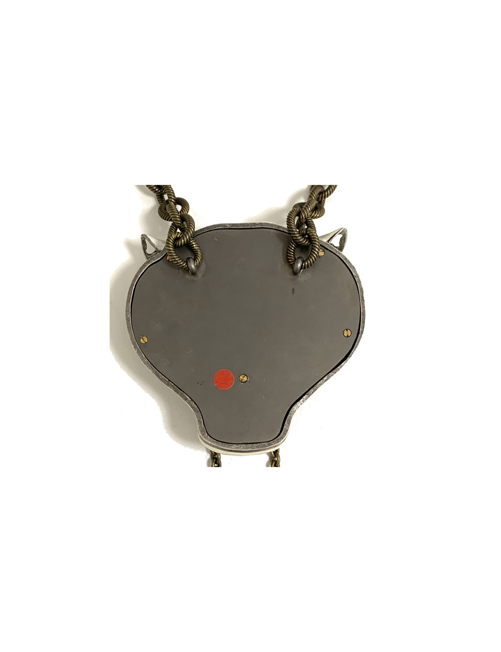 Last items in stock NECKLACES MARNI black and silver chainmail bib necklace MARNI 16287 200.00 € MARNI black and silver chainmail bib necklace Condition: very goodMaterials: metal, fabric, stones, beadsColors: black, silver, topazeMeasurements: height: 9cm, width: 24cm, ribbon (x2): 71cmDetails: Marni bib necklace. The necklace is composed of several tiers. The first part is composed of black, transparent, topaz cabochons; the second part of silver... Add to cart
