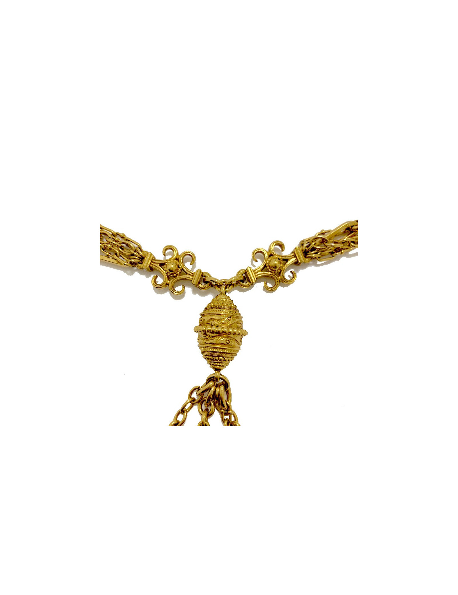 Last items in stock NECKLACES LOULOU DE LA FALAISE choker necklace in gilded metal and dove pendant in molten glass LOULOU DE LA FALAISE 21897 390.00 € Vintage. Loulou de La Falaise choker necklace in golden metal and brilliant Swarovski. It was manufactured at the time by the House Gripoix. The pendant represents a dove made of white molten glass. In very good condition. Size: short neck 35 cm, longer 41 cm, size of the jewel 4x3.5 cm. Will be delivered in a Valois Vintage Paris dustbag. Add to cart