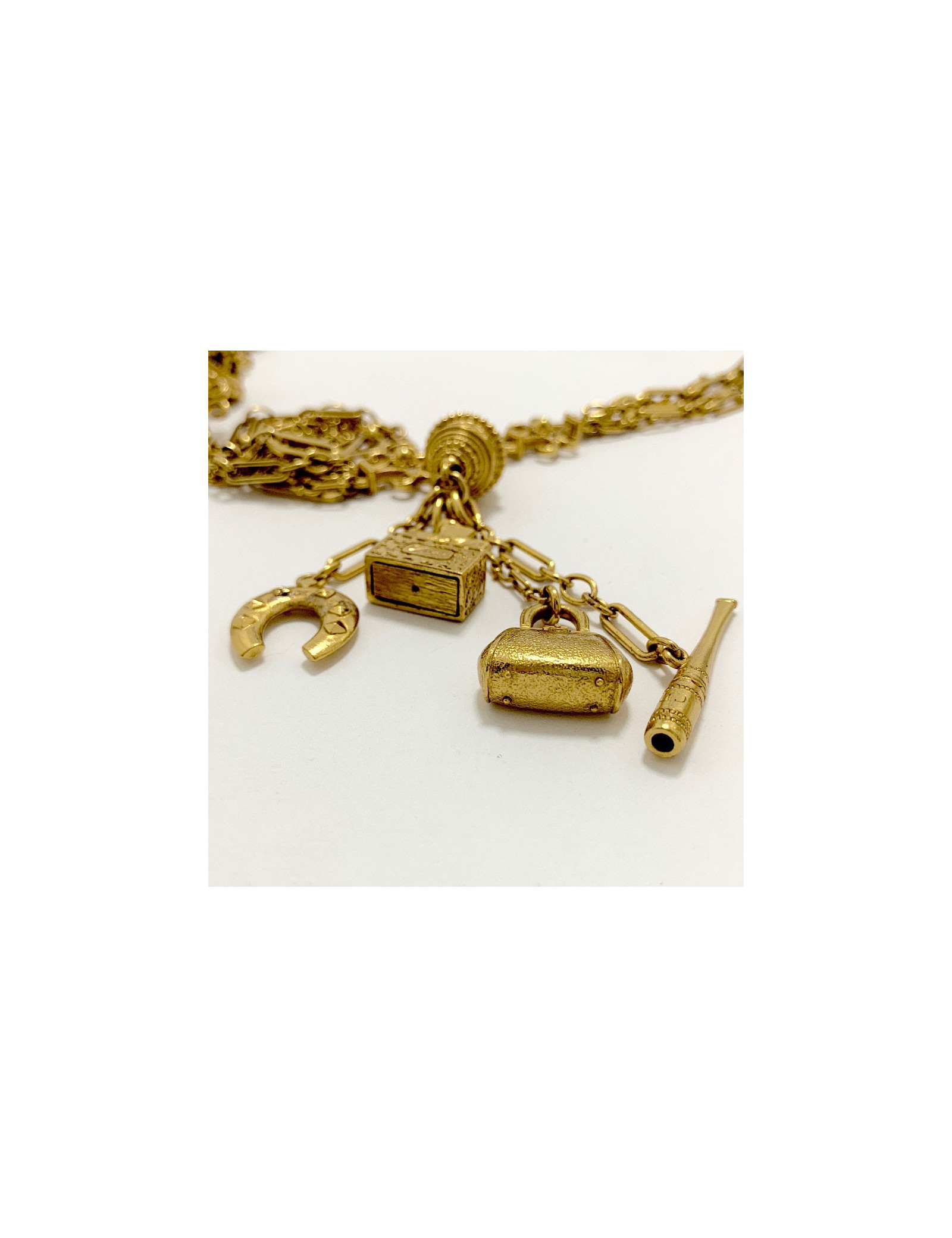 Last items in stock NECKLACES JEAN PAUL GAULTIER vintage checkered necklace JEAN-PAUL GAULTIER 35064 220.00 € JEAN PAUL GAULTIER vintage checkered mosaic necklace Condition : goodMaterials : metal, enamelColors : silver, blue, yellowMeasurements : total necklace's length 43 cm, width 2 cmStamp : noHardware: silver finish metalDetails : vintage jewel, metal chain with a succession of 4 mosaic panels Add to cart