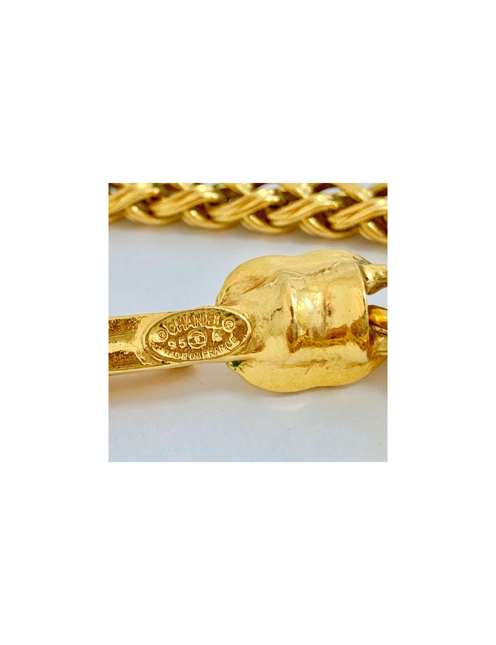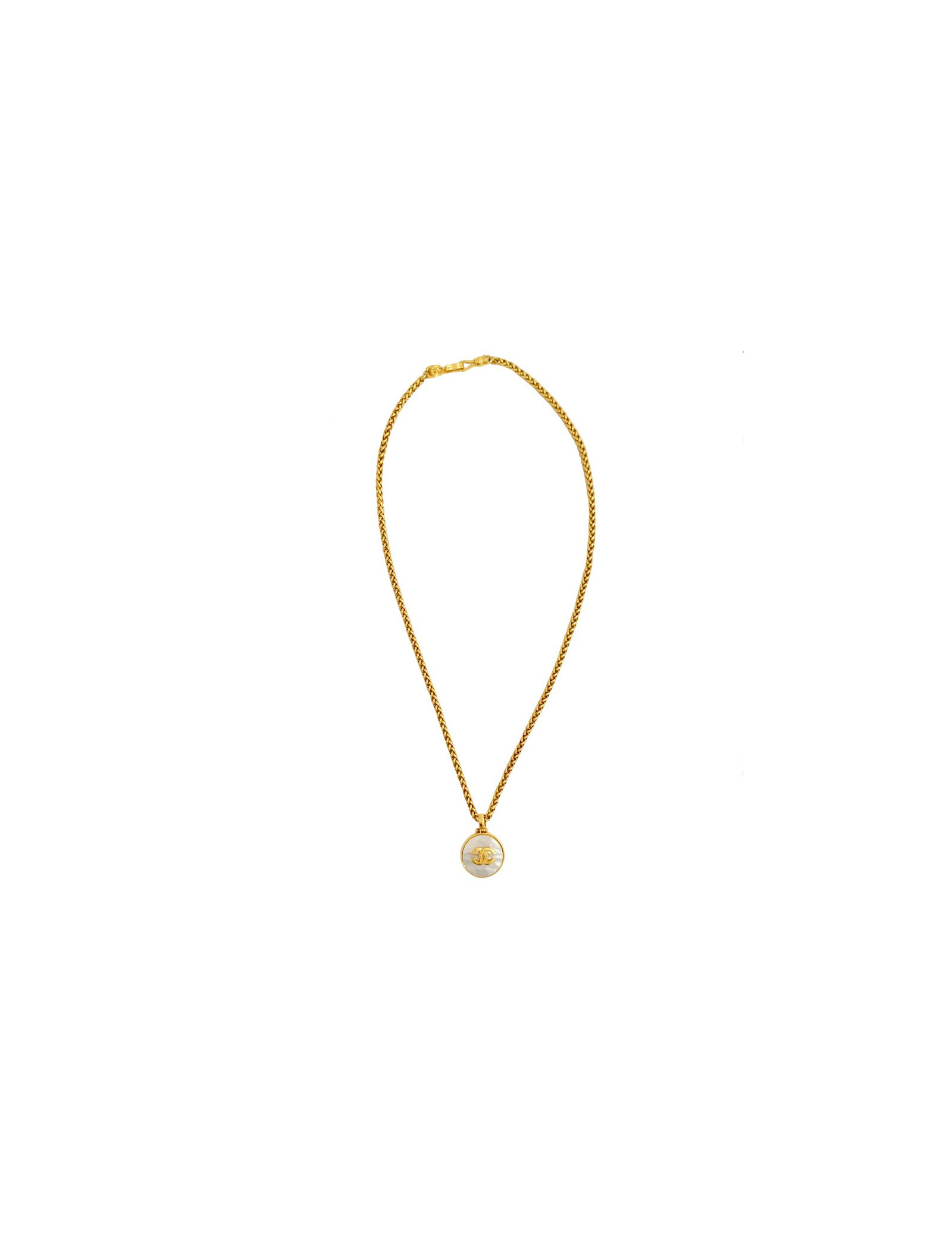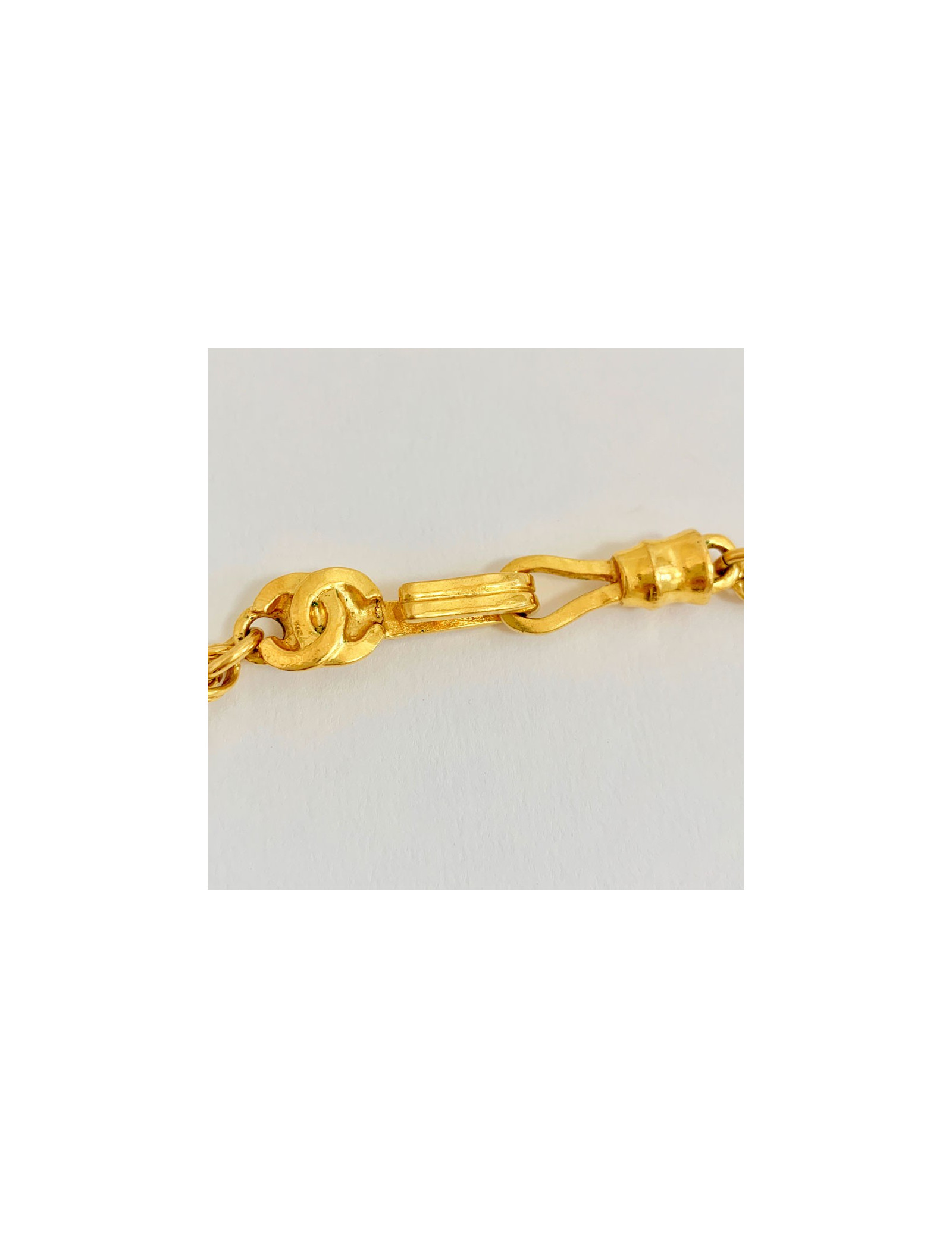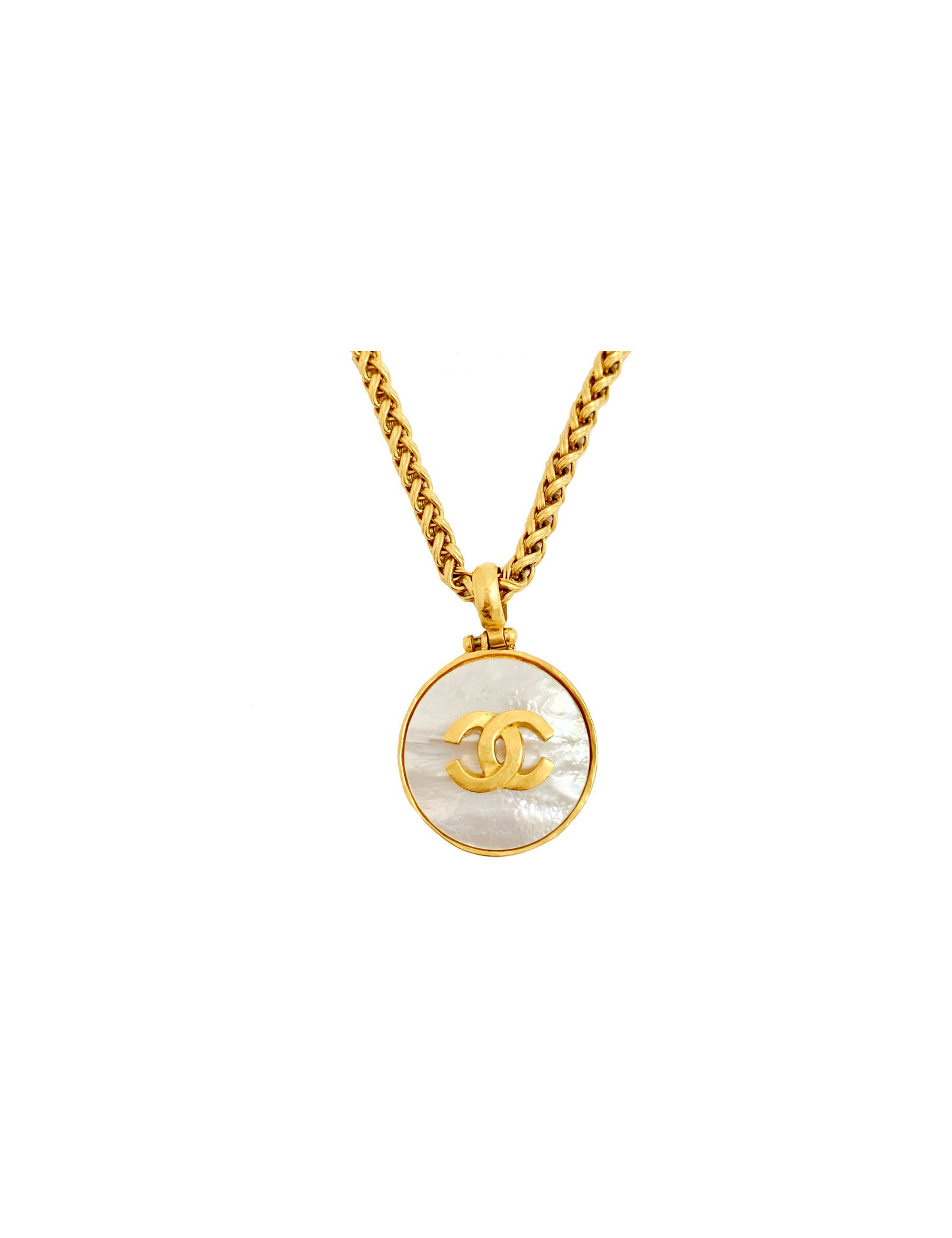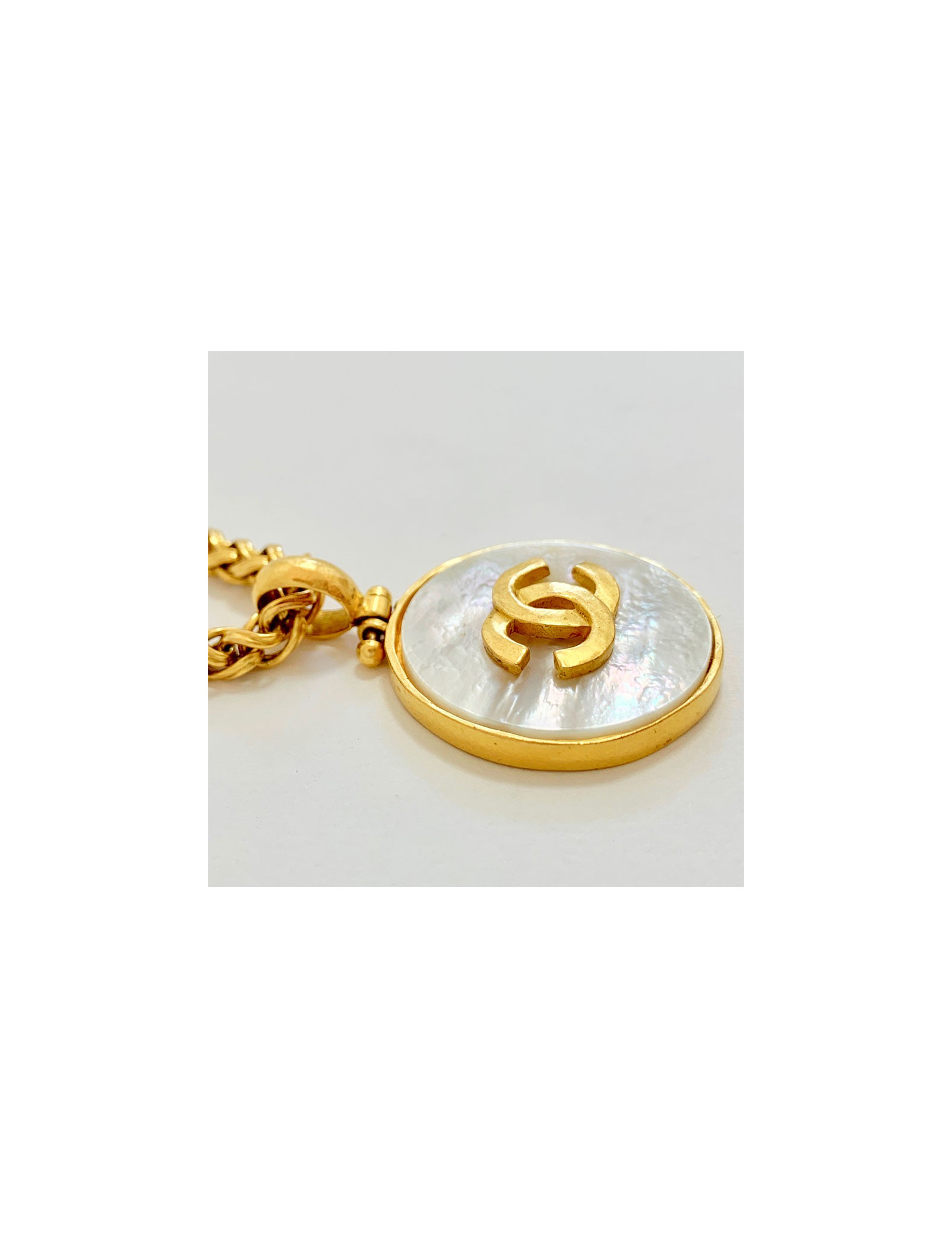Last items in stock NECKLACES CHANEL pearl and gold bib necklace CHANEL 34334 2,850.00 € CHANEL mother-of-pearl beads and gold bib necklace Condition : very goodMade in FranceMaterials : metal, pearly beadsColor : goldMeasurements : length (adjustable) up to 40 cm, pendant : 15 cmHardware : gold finish metalStamp : yesYear : Spring 2002Details : CC pendant on the clasp, rigid choker with dangling beaded chains. Advantage Valois Vintage Paris... Add to cart
