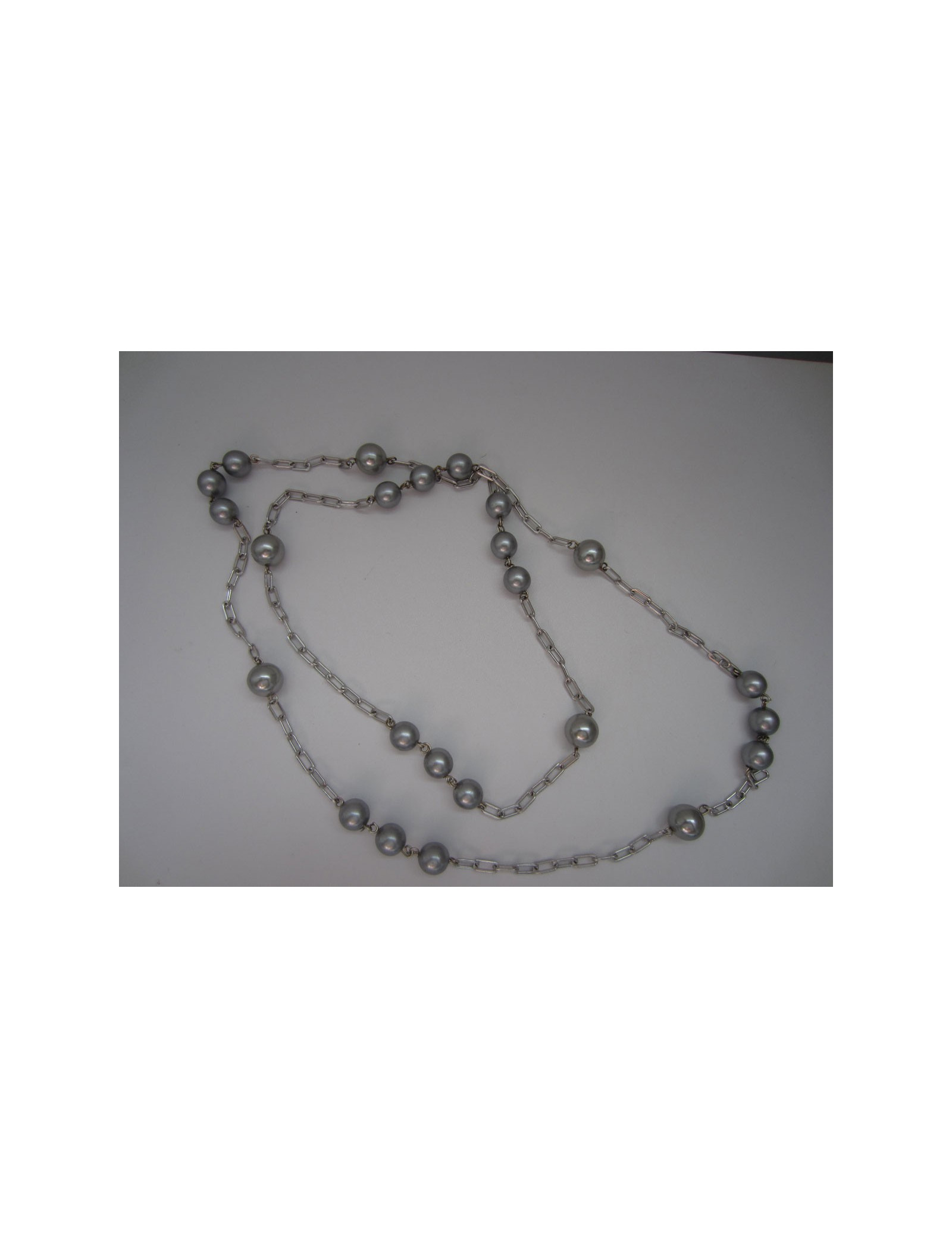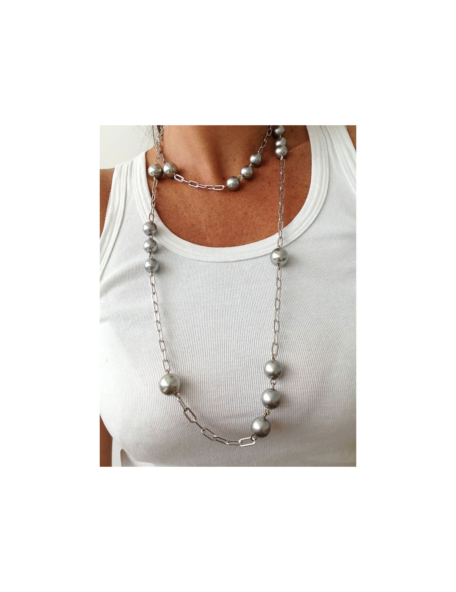 Elegant necklace Marguerite de Valois in gray pearls and silver metal chain.