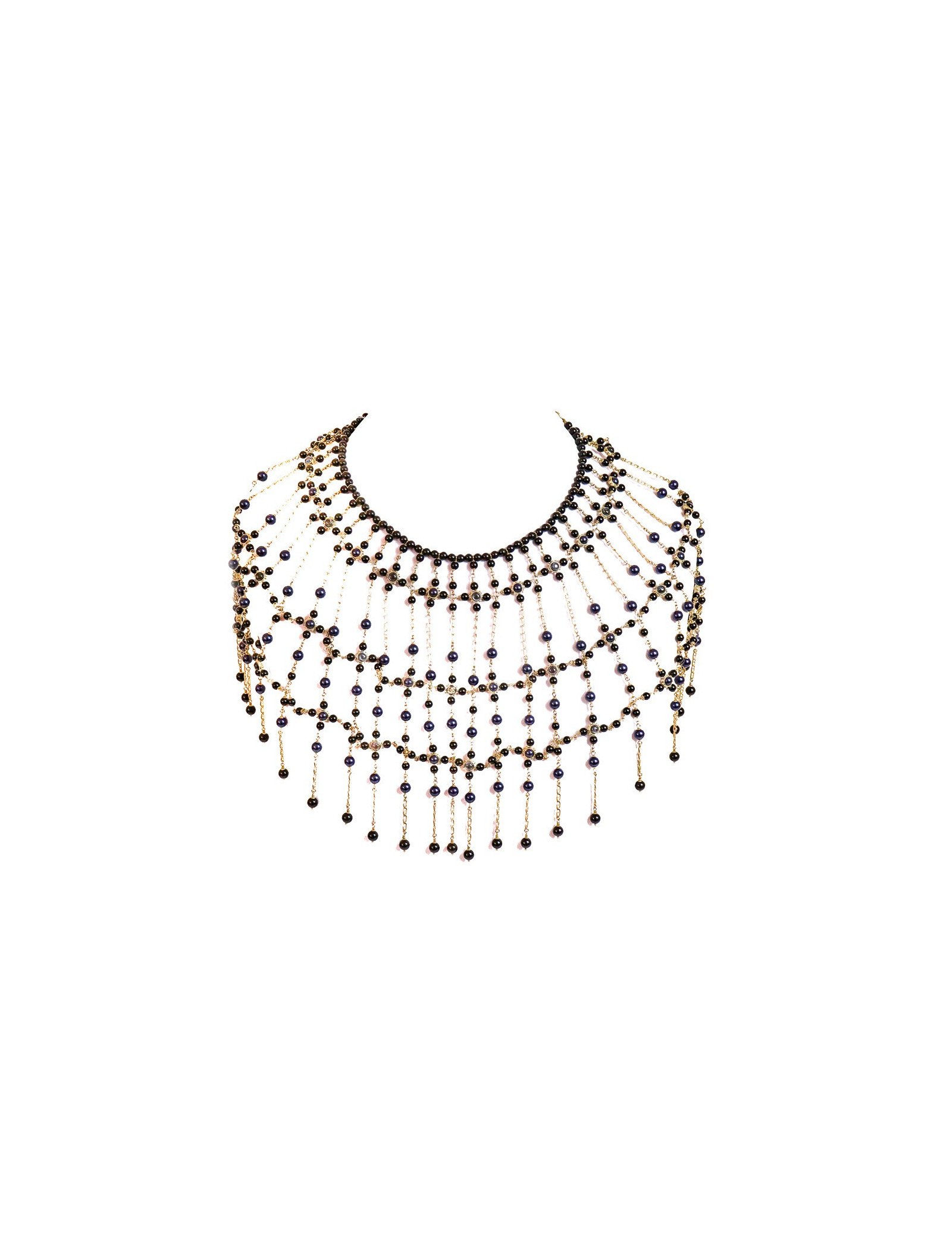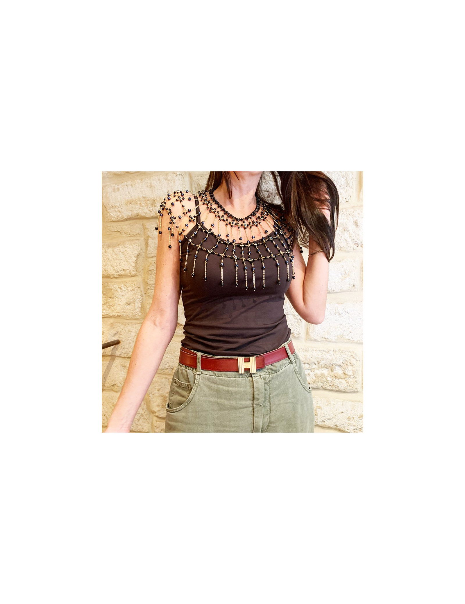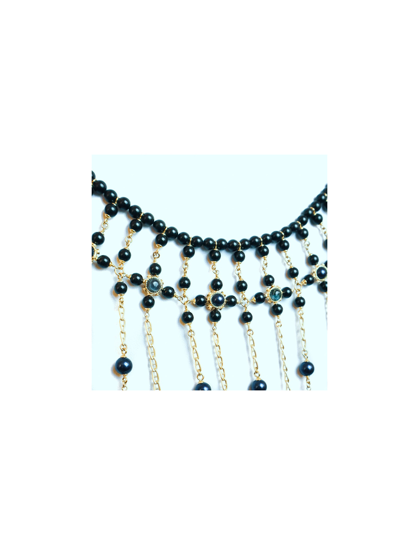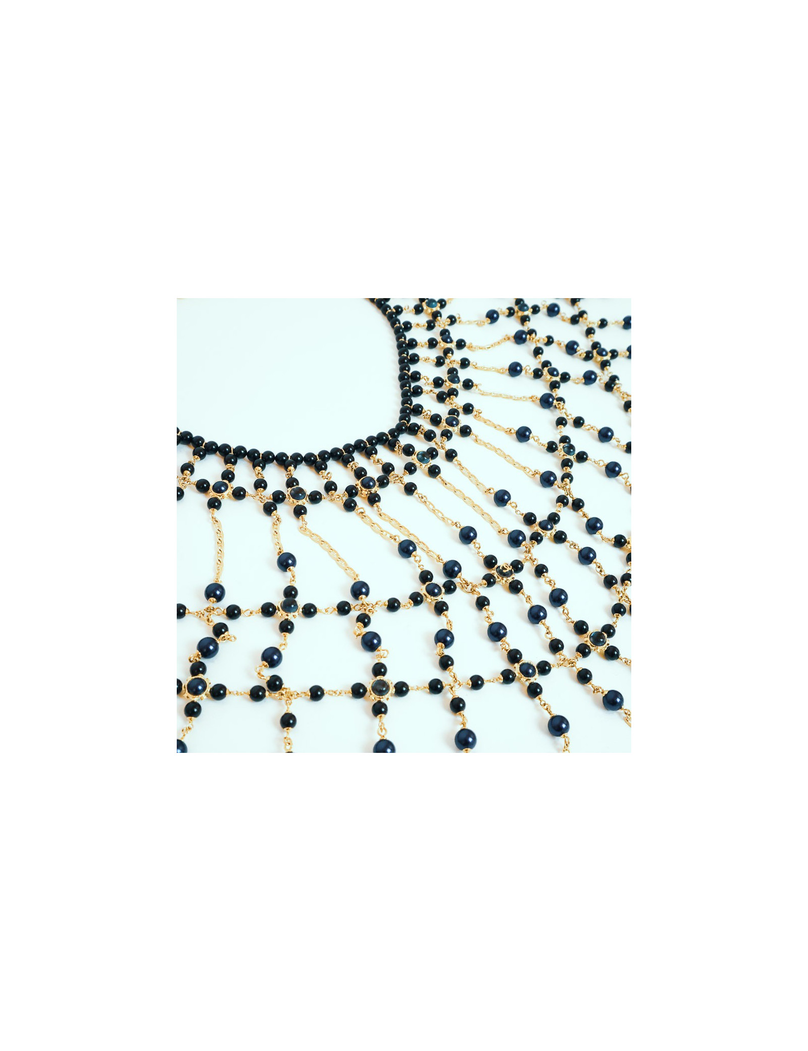 The jewel is a magnificent piece that will dress your most sophisticated parties. It is a breastplate that will cover your entire bust (and your back), a succession of bangs of gold metal chains, beaded in night blue and black. Magnify your beauty and bet on the Nefertiti look!