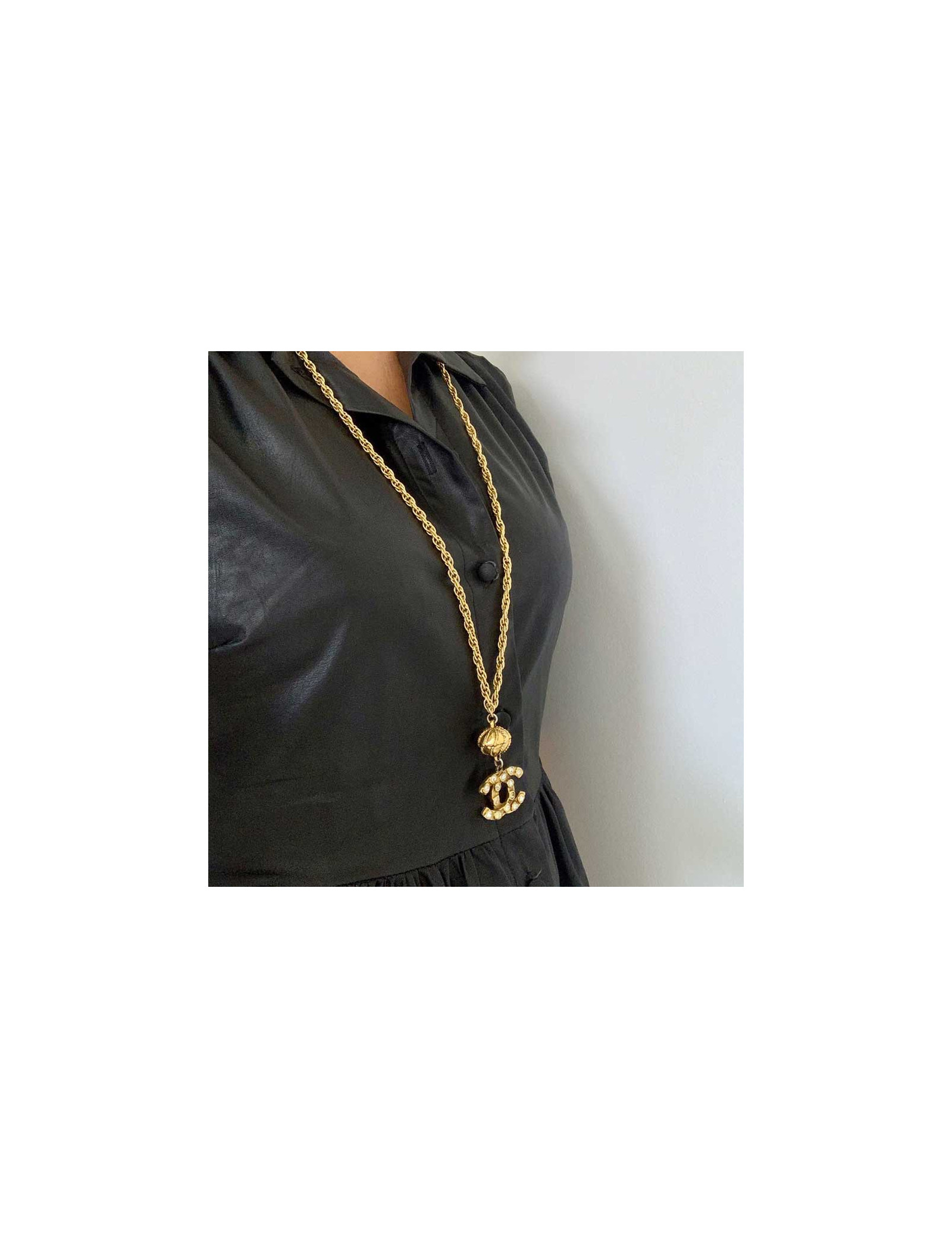 Last items in stock NECKLACES CHANEL pearls and CC rhinestones long necklace CHANEL 28525 1,850.00 € Chanel necklace pearls and CC Made in France, this long Chanel long necklace is in silver metal, pearly pearls and rhinestone CC.It is reversible on both sides. Can be worn long or double.Stamp on lobster clasp.Total length: 108 cm, CC in rhinestones sizes: 2 x 1.5 cm and 1.5 x 1 cm.ref 28525Il will be delivered in a black box Add to cart