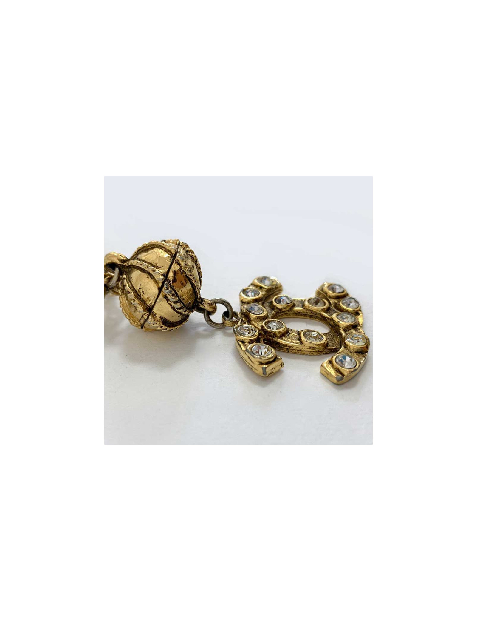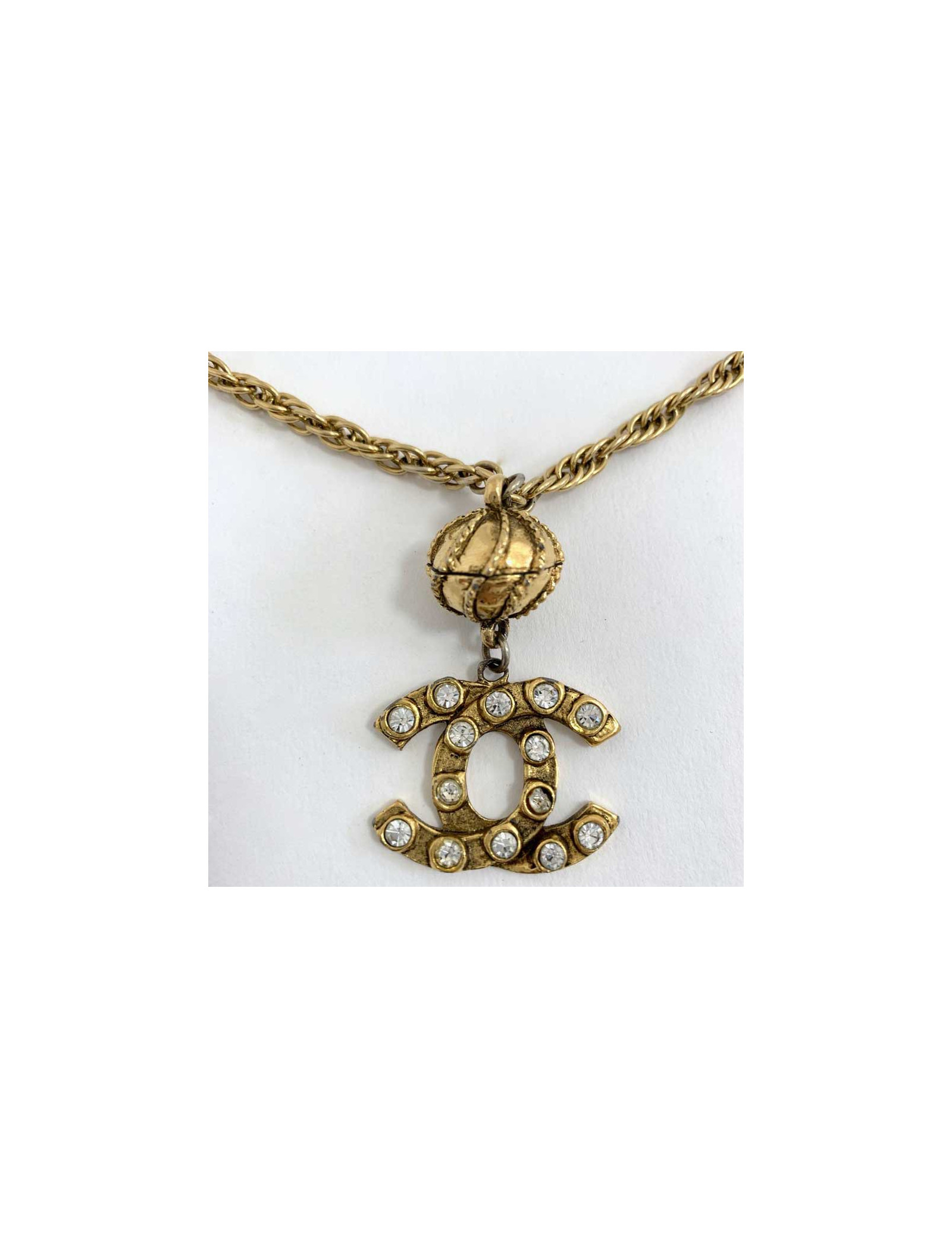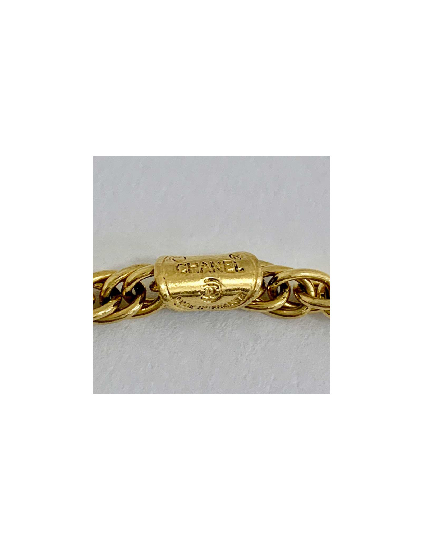 New Last items in stock NECKLACES Vintage gold CHANEL necklace strass CHANEL 40420 2,150.00 € Vintage gold CHANEL necklace Condition: very good conditionMade in FranceMaterial: metal, rhinestonesColor: goldDimensions: total length 92 cmStamp: yesYear: 1971-1980Hardware: gold metalDetails: imposing necklace composed of alternating gold square links with a grid pattern and transparent crystal-style cabochons. Add to cart