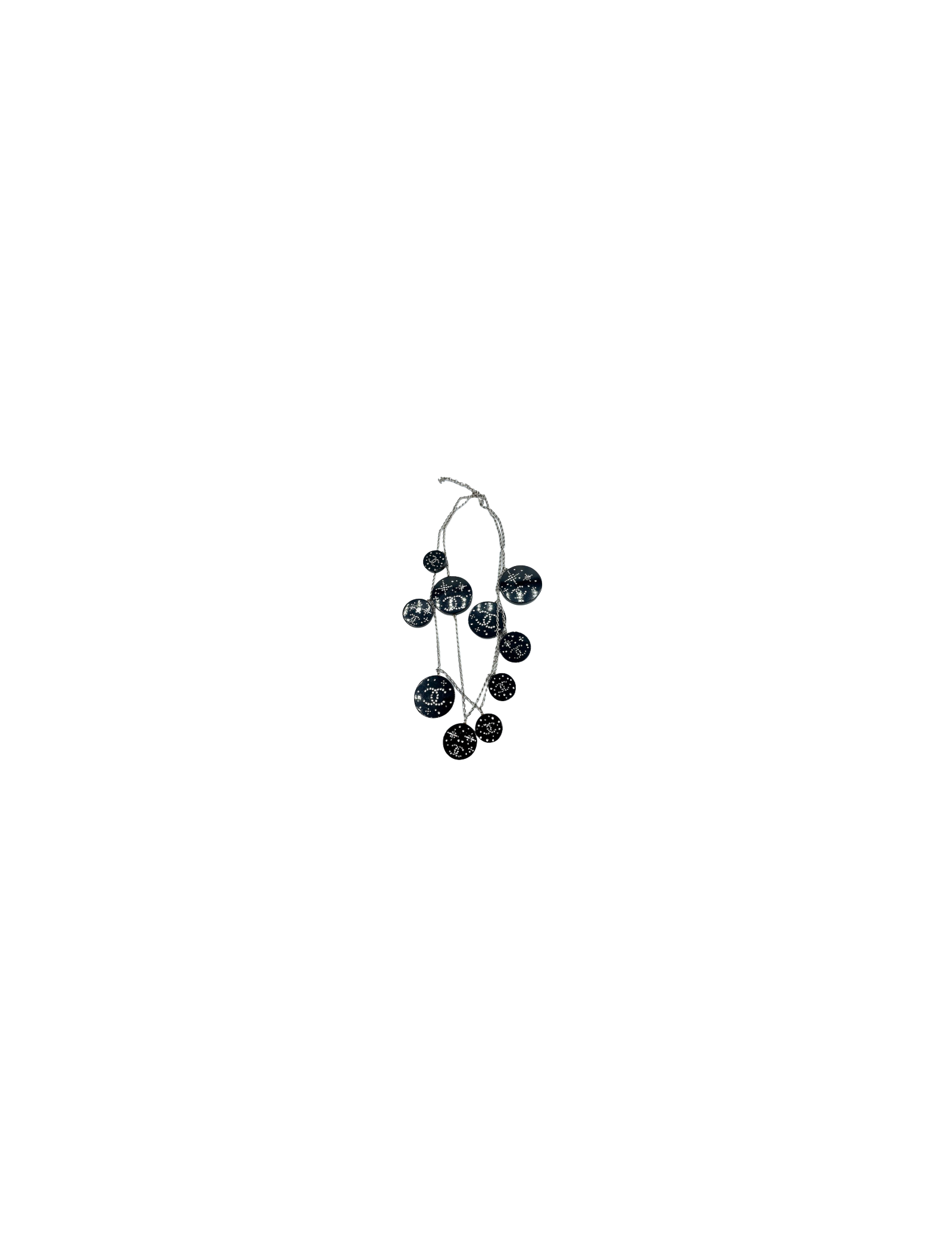 Last items in stock NECKLACES CHANEL pearls and CC rhinestones long necklace CHANEL 28525 1,850.00 € Chanel necklace pearls and CC Made in France, this long Chanel long necklace is in silver metal, pearly pearls and rhinestone CC.It is reversible on both sides. Can be worn long or double.Stamp on lobster clasp.Total length: 108 cm, CC in rhinestones sizes: 2 x 1.5 cm and 1.5 x 1 cm.ref 28525Il will be delivered in a black box Add to cart