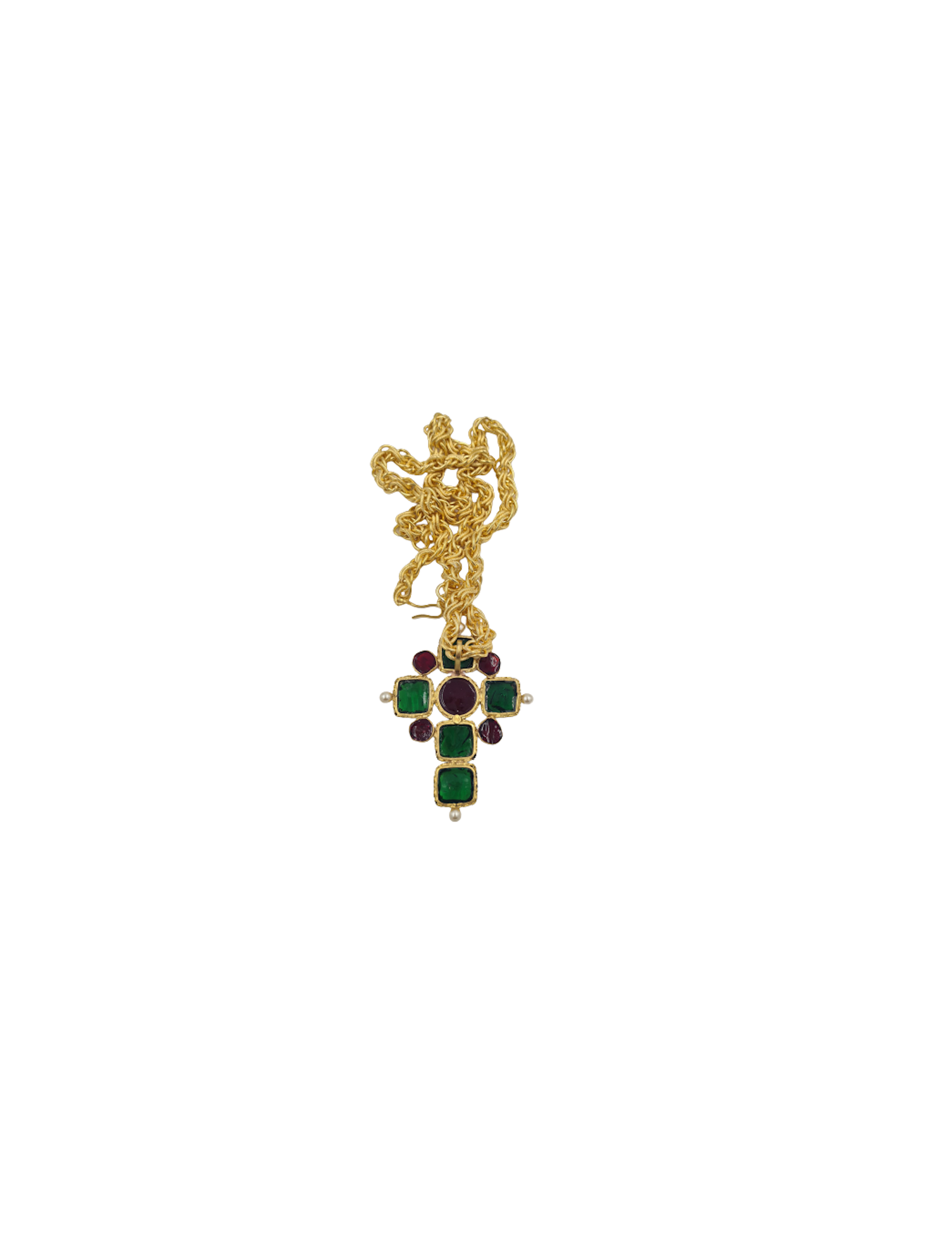 Last items in stock NECKLACES CHANEL vintage gold and emerald green molten glass long necklace CHANEL 36063 2,100.00 € CHANEL vintage gold and emerald green molten glass long necklace Condition : very goodMade in FranceMaterials : metal, molten glassColors : gold, emerald greenMeasurements : total chain length 72 cm, pendant 5 x 5 cmStamp : yesYear : 1984Details : jewelry chain reminiscent of a bag's shoulder strap. The pendant has 4 small pieces of emerald green molten... Add to cart