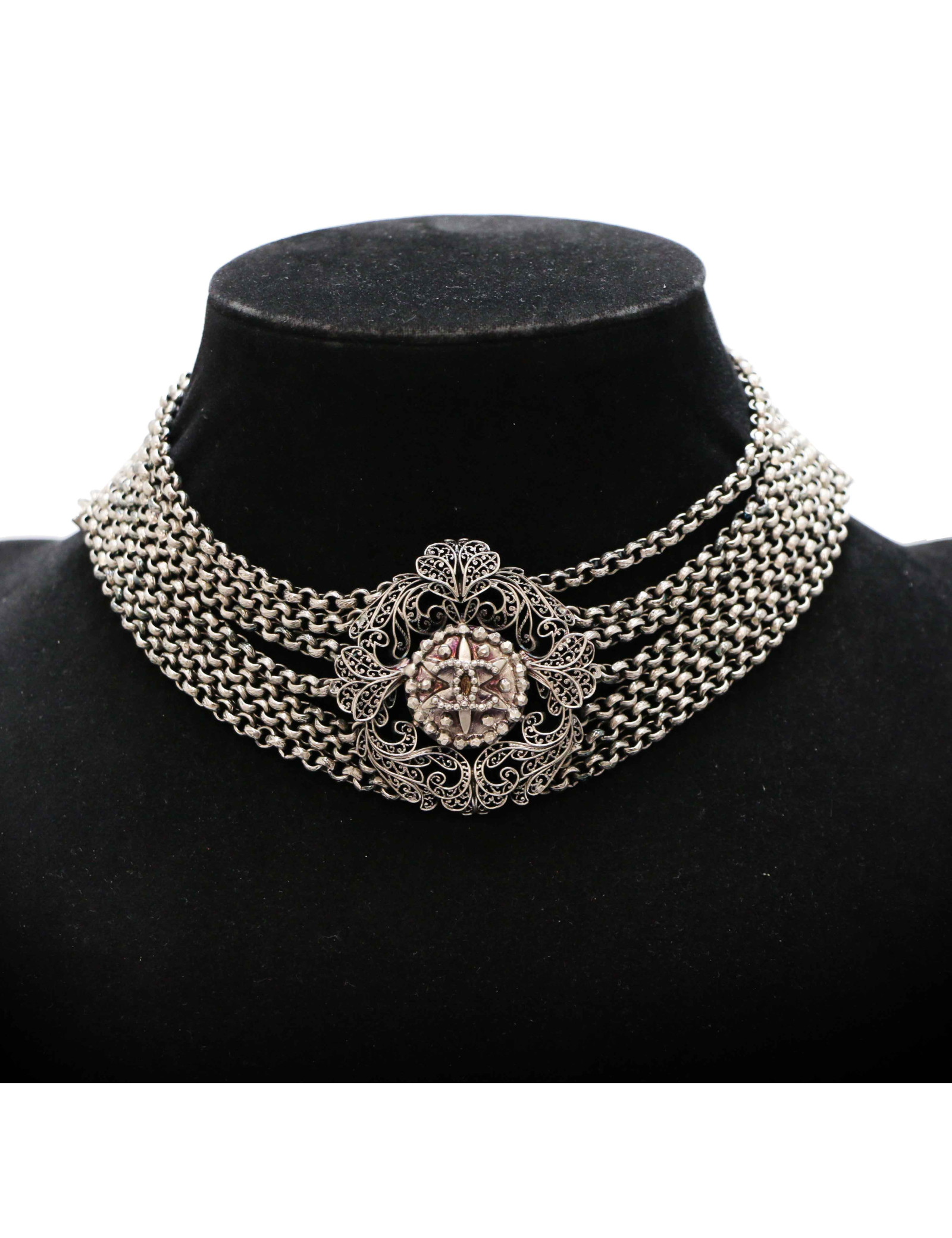 NECKLACES CHANEL multicolor choker necklace CHANEL 36155 2,550.00 € CHANEL vintage choker necklace Condition : very goodMade in FranceMaterials : gold plated metal, resinColors : yellow, amethyst, rubyMeasurements : length: 39 cm + 5 cm of adjustable chain, size of a coin medallion : 3 x 3 cmGold finish metalStamp : yesYear : 1990-1992Details : A succession of inlaid pieces in gilded metal with a resin stone at the... Add to cart