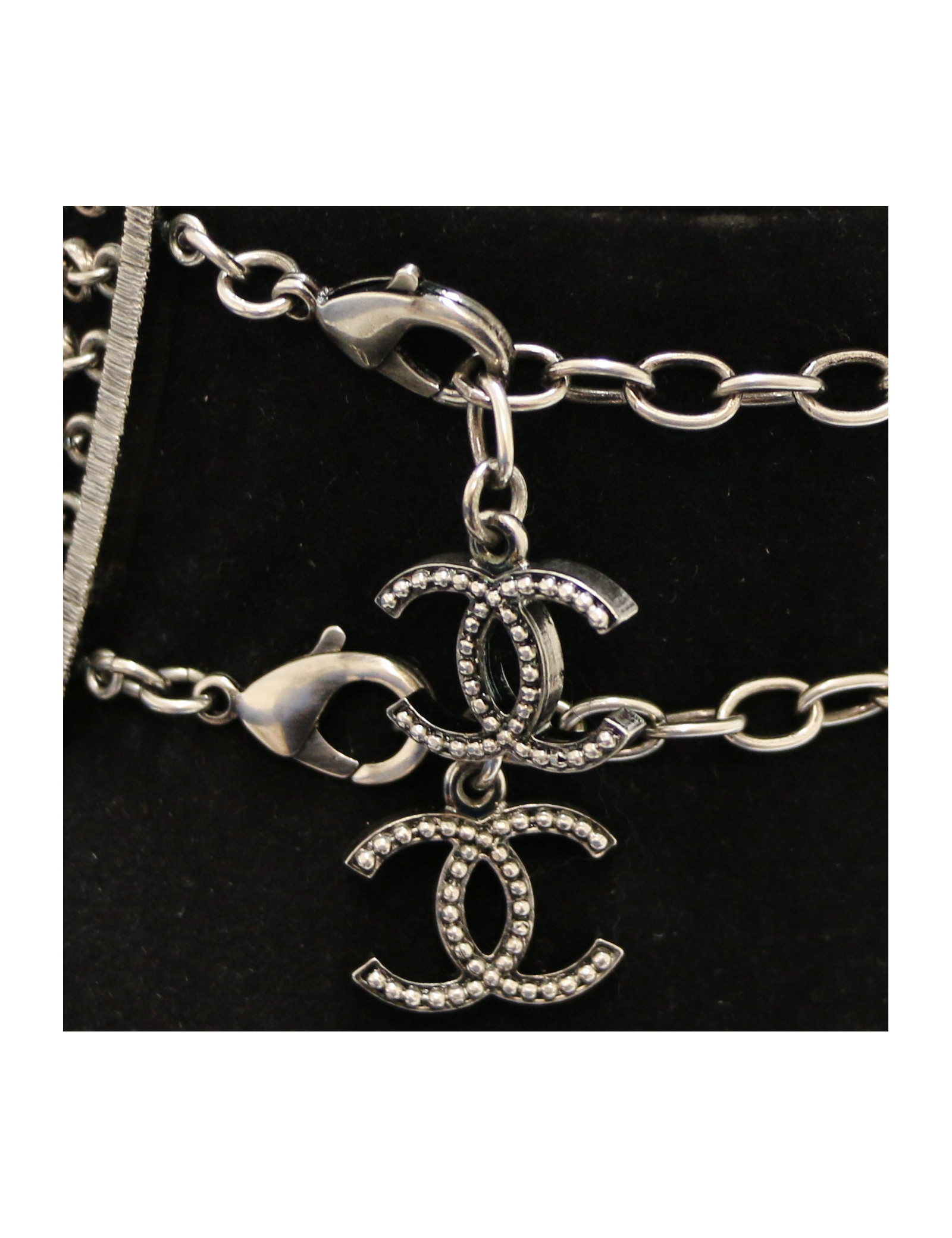 NECKLACES CHANEL ruthenium chain and pearly beads belt-necklace CHANEL 22057 1,200.00 € CHANEL belt in large matte ruthenium chain and pearls Made in FranceCondition: very goodMaterial: metal, pearly beadsColors: silver, mother-of-pearlHardware: mat ruthenium silver finish metalYear: Fall 2006Measurements: total length: 93cm, worn at its longest: 86.5cm, width: 1.5cmDetails: Chanel necklace-belt, large matte ruthenium metal chain, 3 pearly... Add to cart