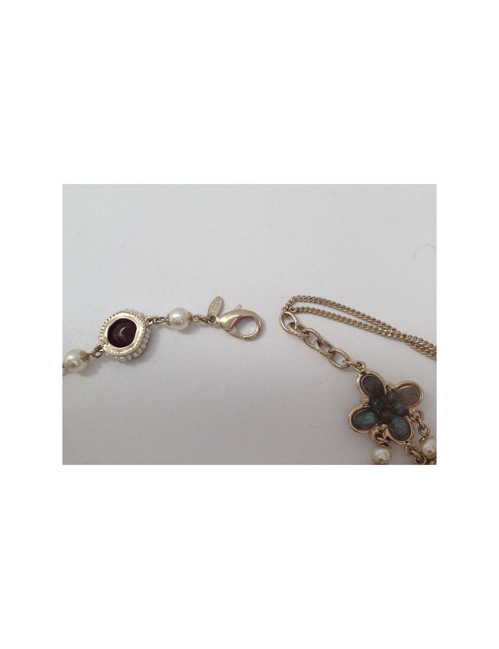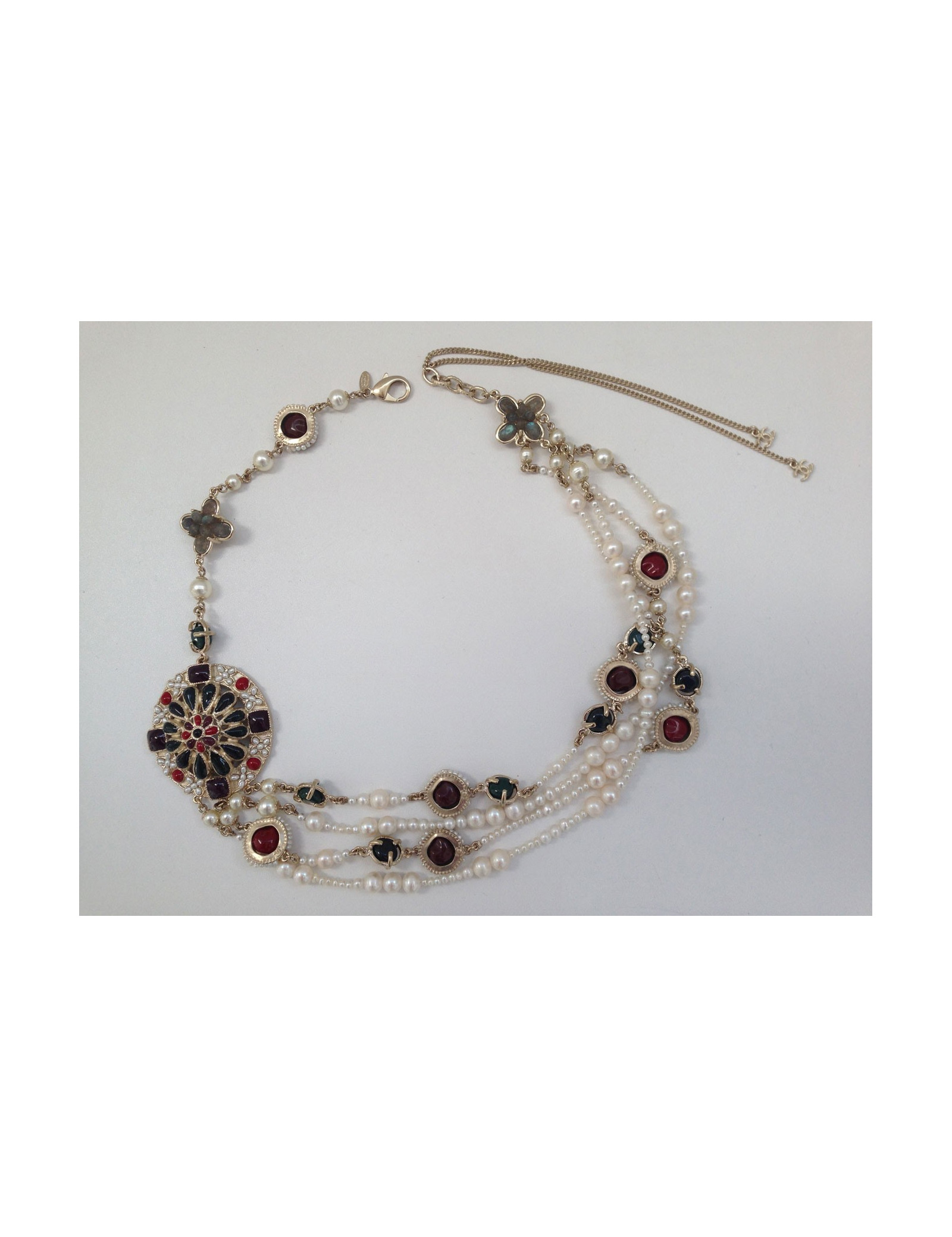 Quadruple collar ranks Chanel, consisting of two rows of pearls and two rows of jewellery in glass (red, Burgundy, black and green) circled pearls and metal gilded end. Two pretty clovers in quartz smoked enhance each end of this necklace.