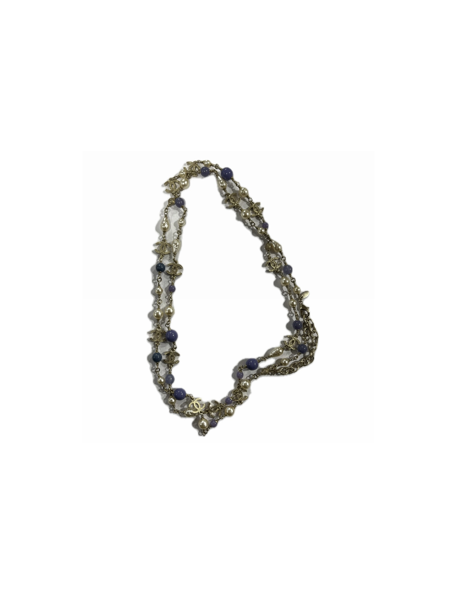 Last items in stock NECKLACES CHANEL pearl and gold bib necklace CHANEL 34334 2,850.00 € CHANEL mother-of-pearl beads and gold bib necklace Condition : very goodMade in FranceMaterials : metal, pearly beadsColor : goldMeasurements : length (adjustable) up to 40 cm, pendant : 15 cmHardware : gold finish metalStamp : yesYear : Spring 2002Details : CC pendant on the clasp, rigid choker with dangling beaded chains. Advantage Valois Vintage Paris... Add to cart