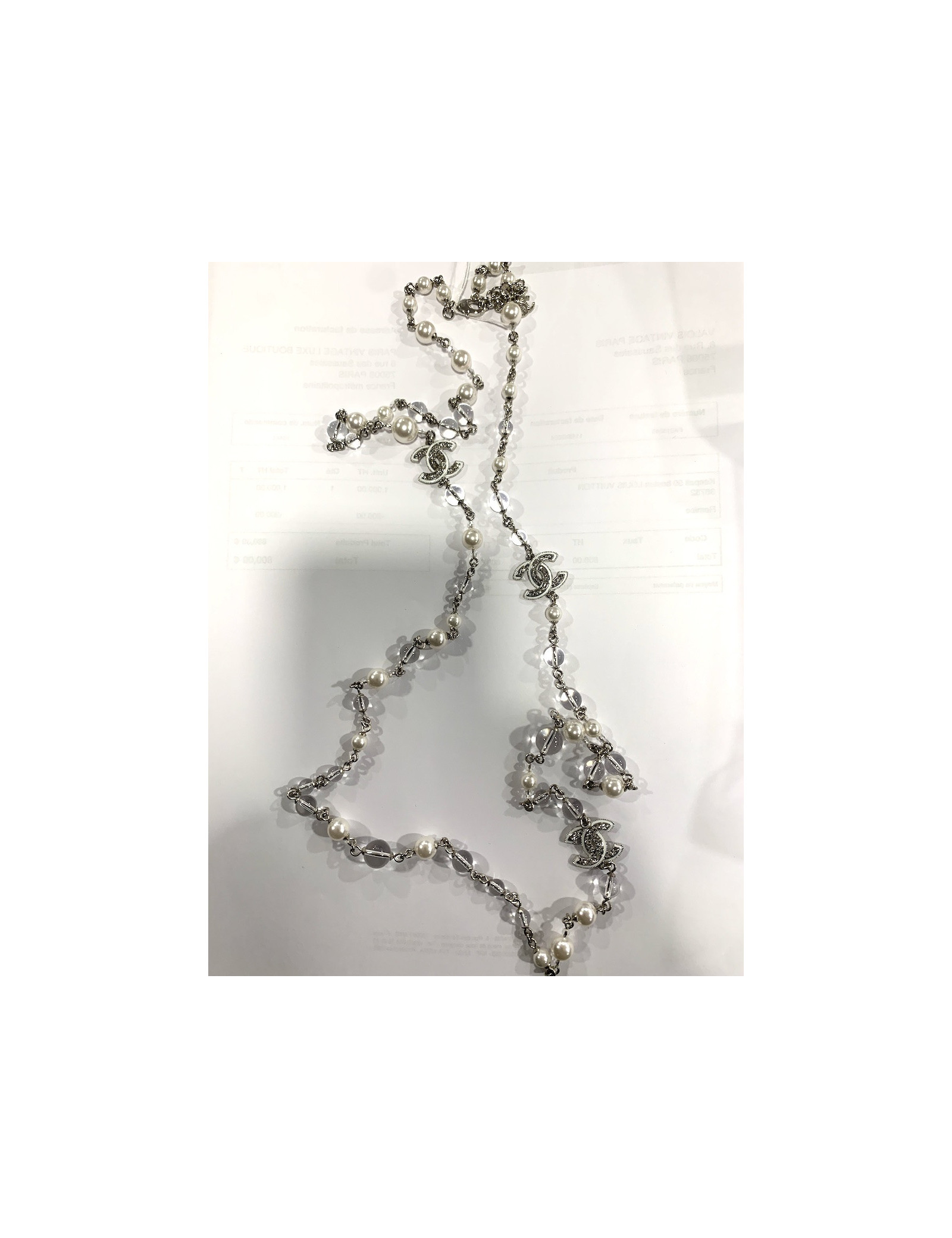 Last items in stock NECKLACES CHANEL pearls and CC rhinestones long necklace CHANEL 28525 1,850.00 € Chanel necklace pearls and CC Made in France, this long Chanel long necklace is in silver metal, pearly pearls and rhinestone CC.It is reversible on both sides. Can be worn long or double.Stamp on lobster clasp.Total length: 108 cm, CC in rhinestones sizes: 2 x 1.5 cm and 1.5 x 1 cm.ref 28525Il will be delivered in a black box Add to cart
