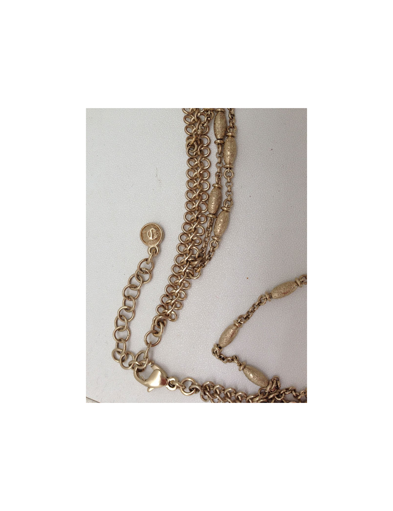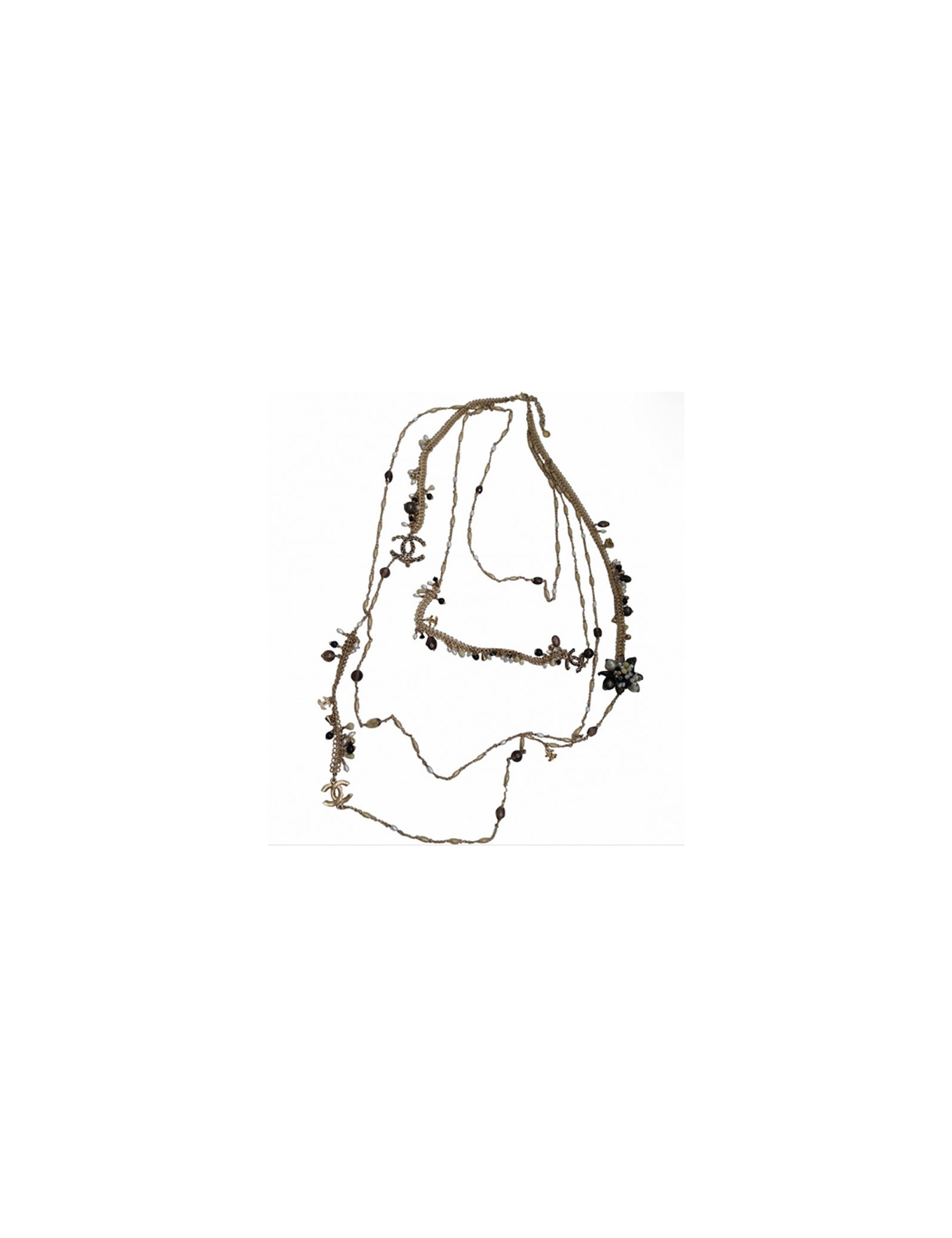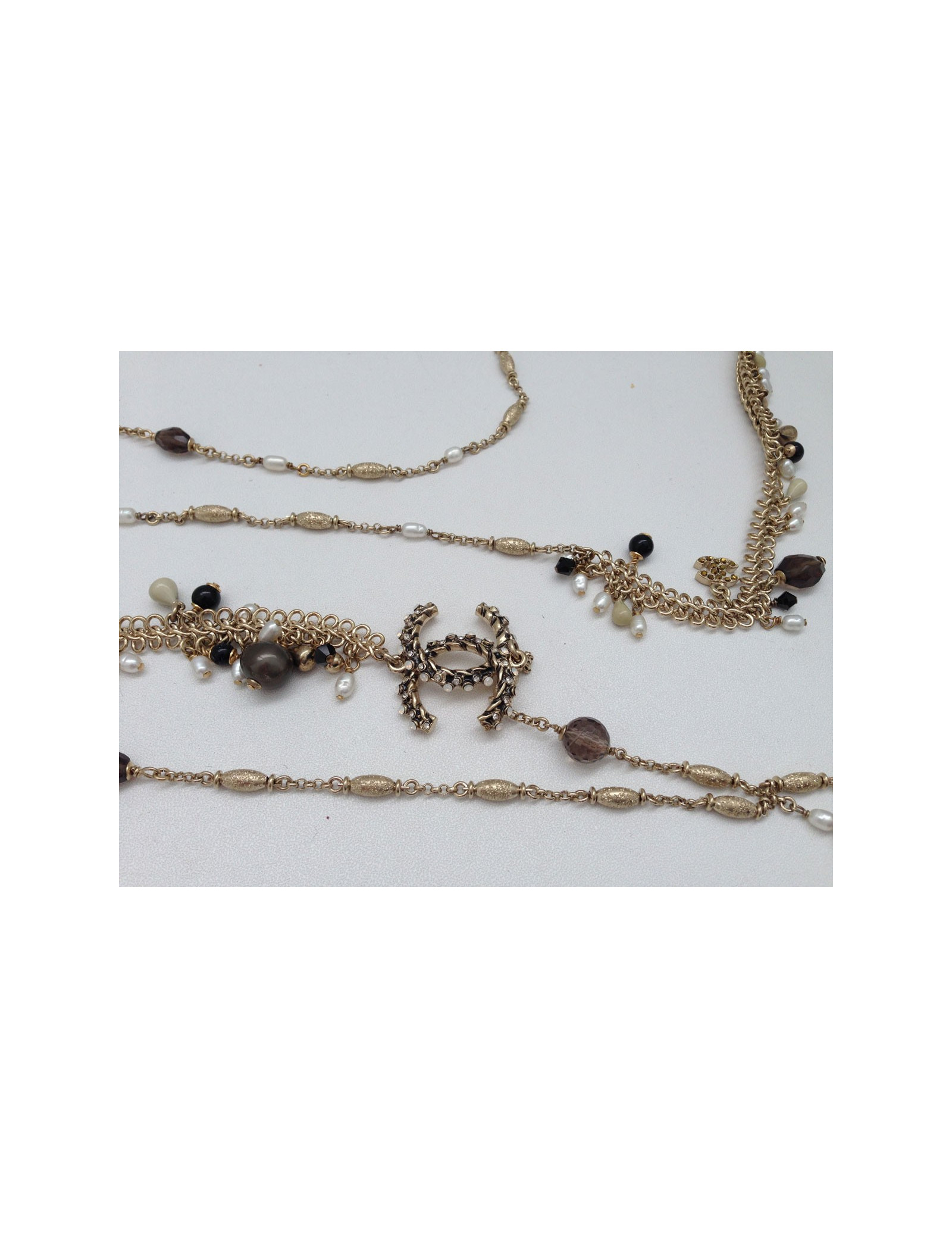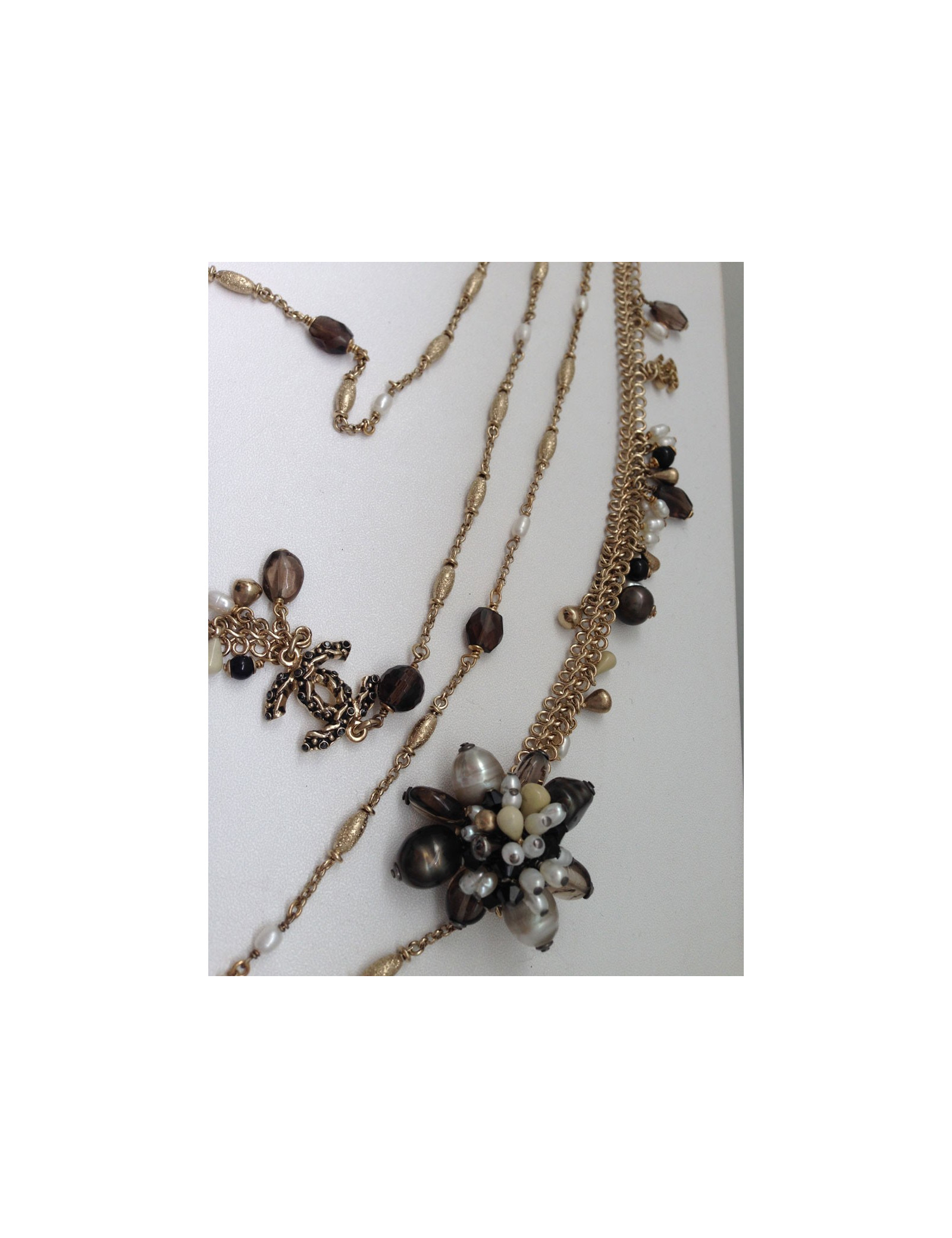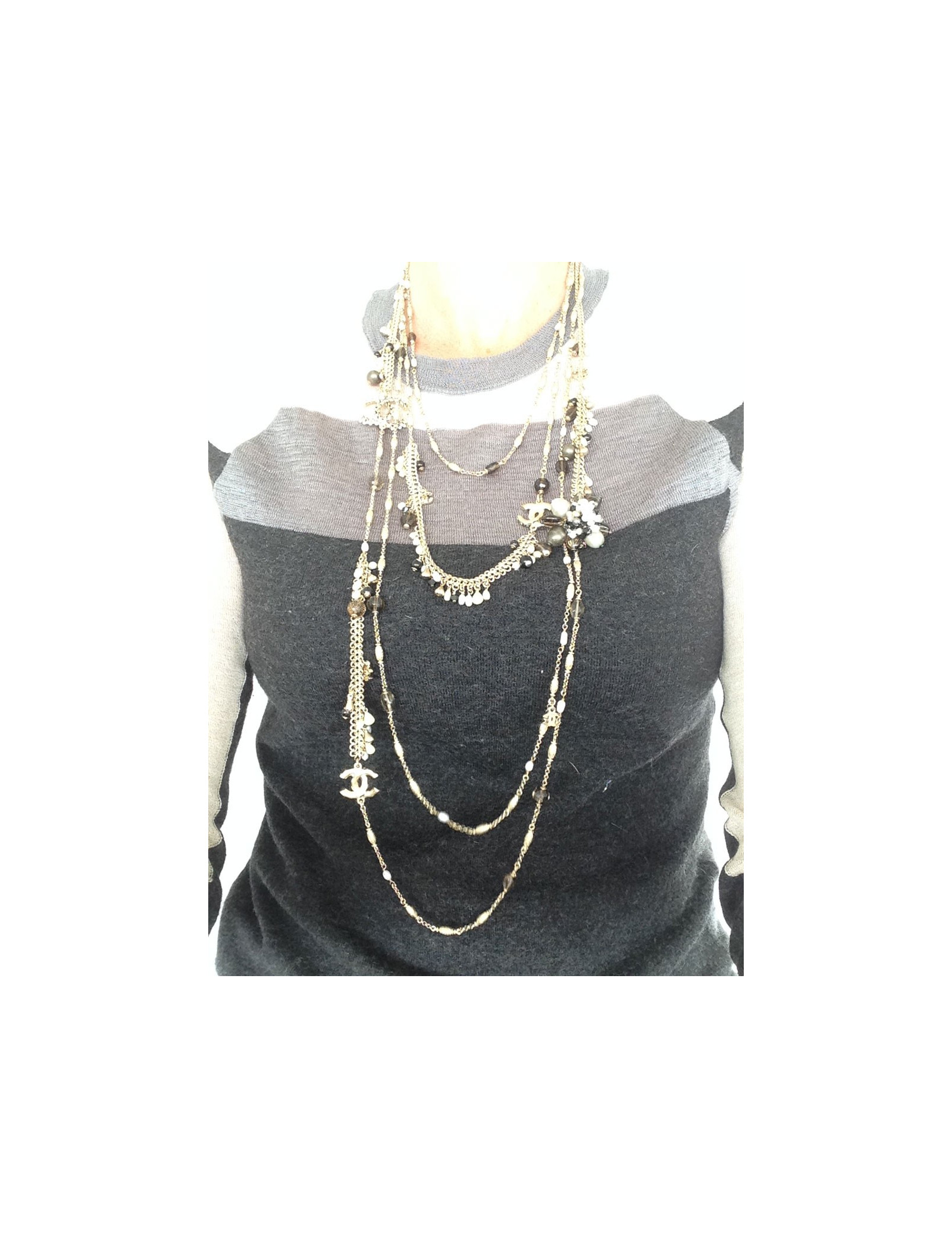 Quadruple jumper ranks Chanel metal fine gilded, two types of strings on this Saltire, surmounted Pearly Pearl, black, faceted smoky gray, CC in rhinestone and a flower jewel composed of beads all different. This quadruple jumper has the advantage of always stay in place because the four channels are welded, they therefore do not turn, Saltire is chest.