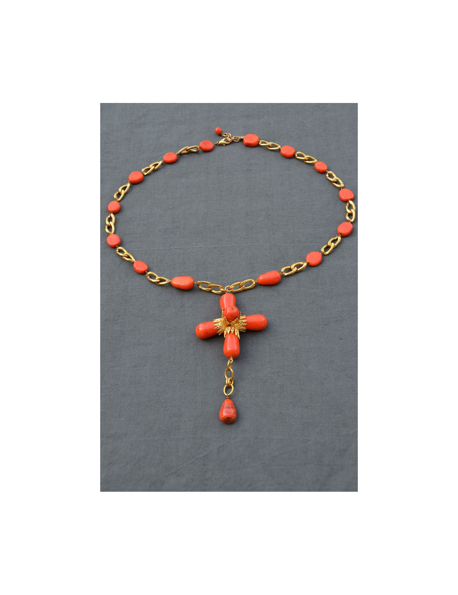Saltire cross Marguerite de Valois in coral glass and metal gold fine gold.