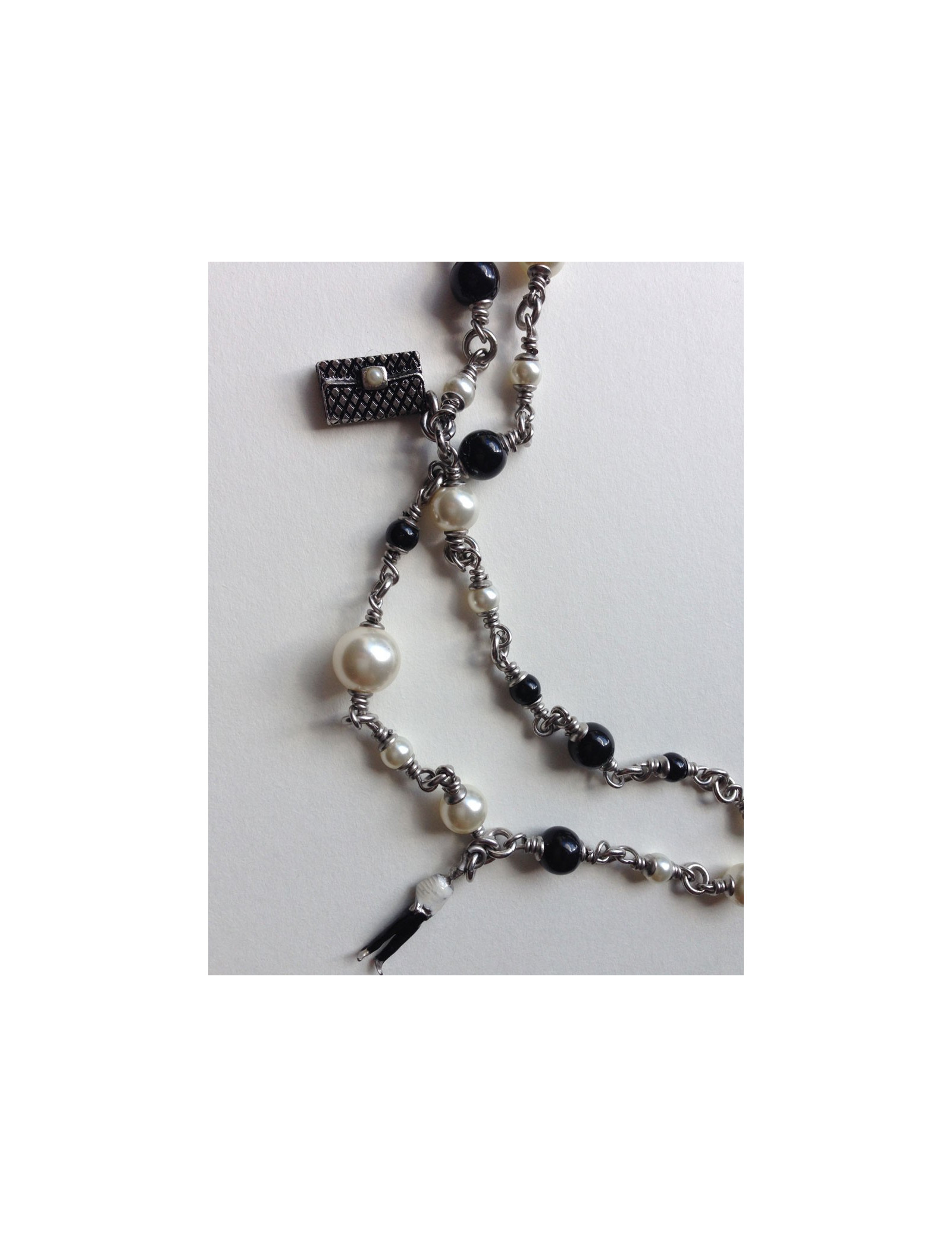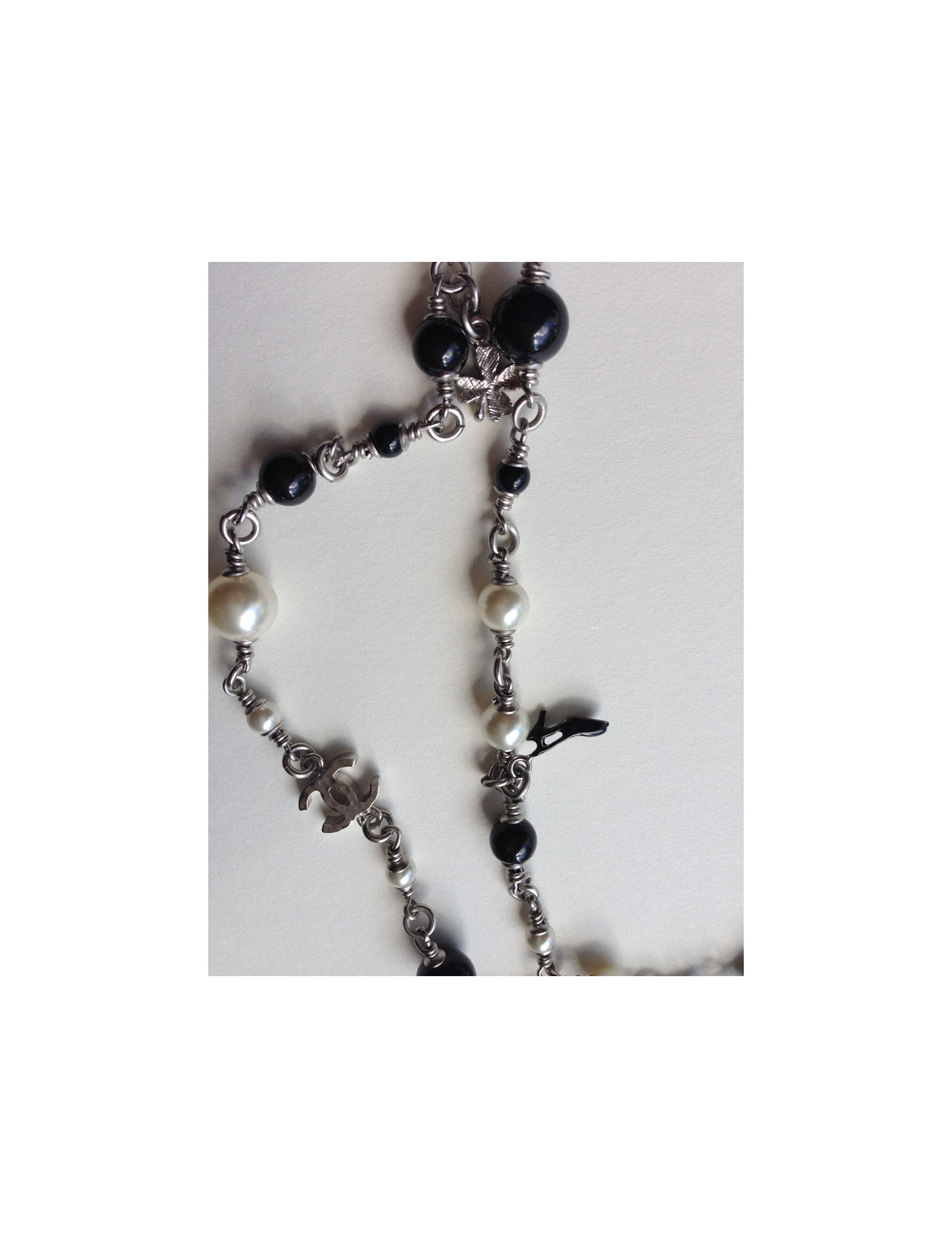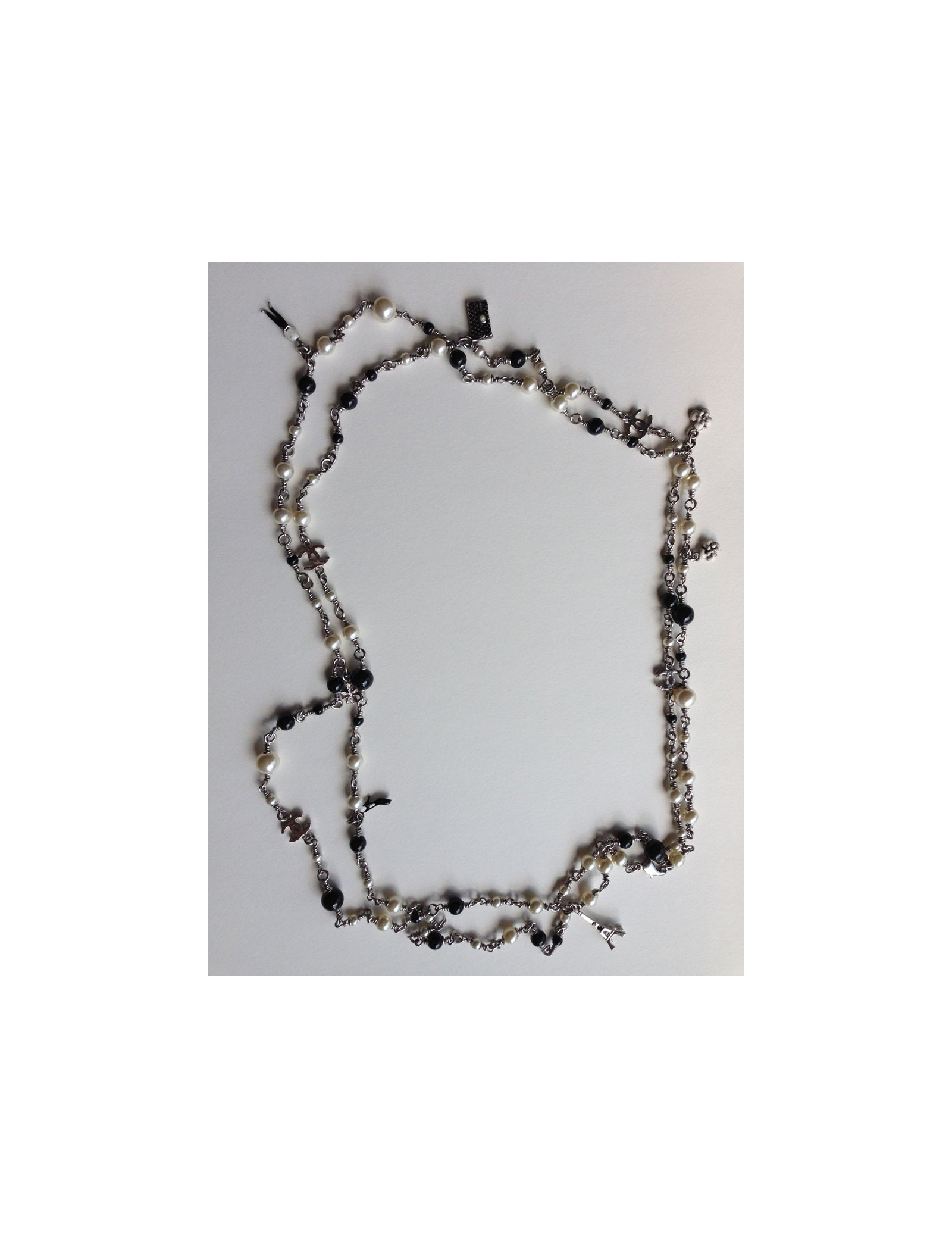 Chanel necklace you like them! It is composed of pearls black and Pearl and especially of small symbols, such as the famous Camellia, Coco, a black shoe, the Eiffel Tower, a bag Chanel quilted, clovers, and finally two c. silver coloured chain.