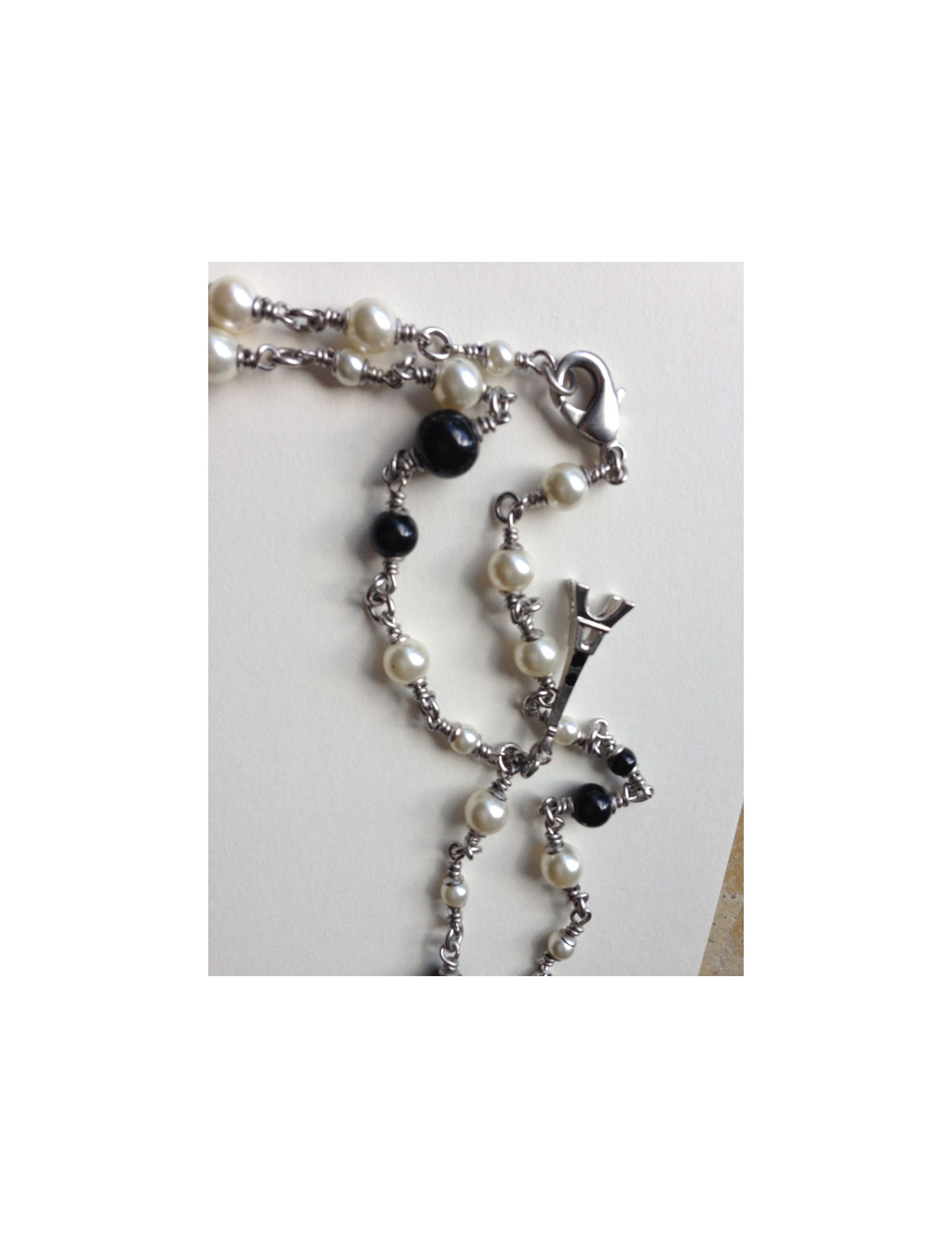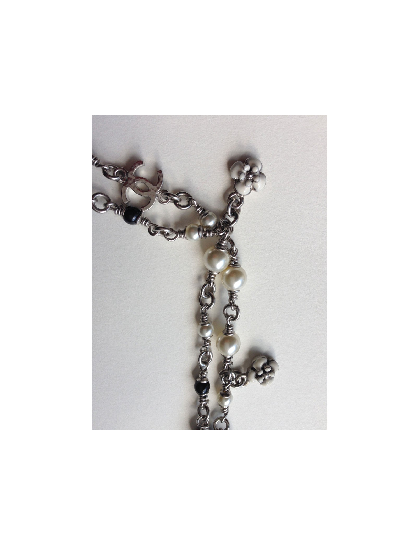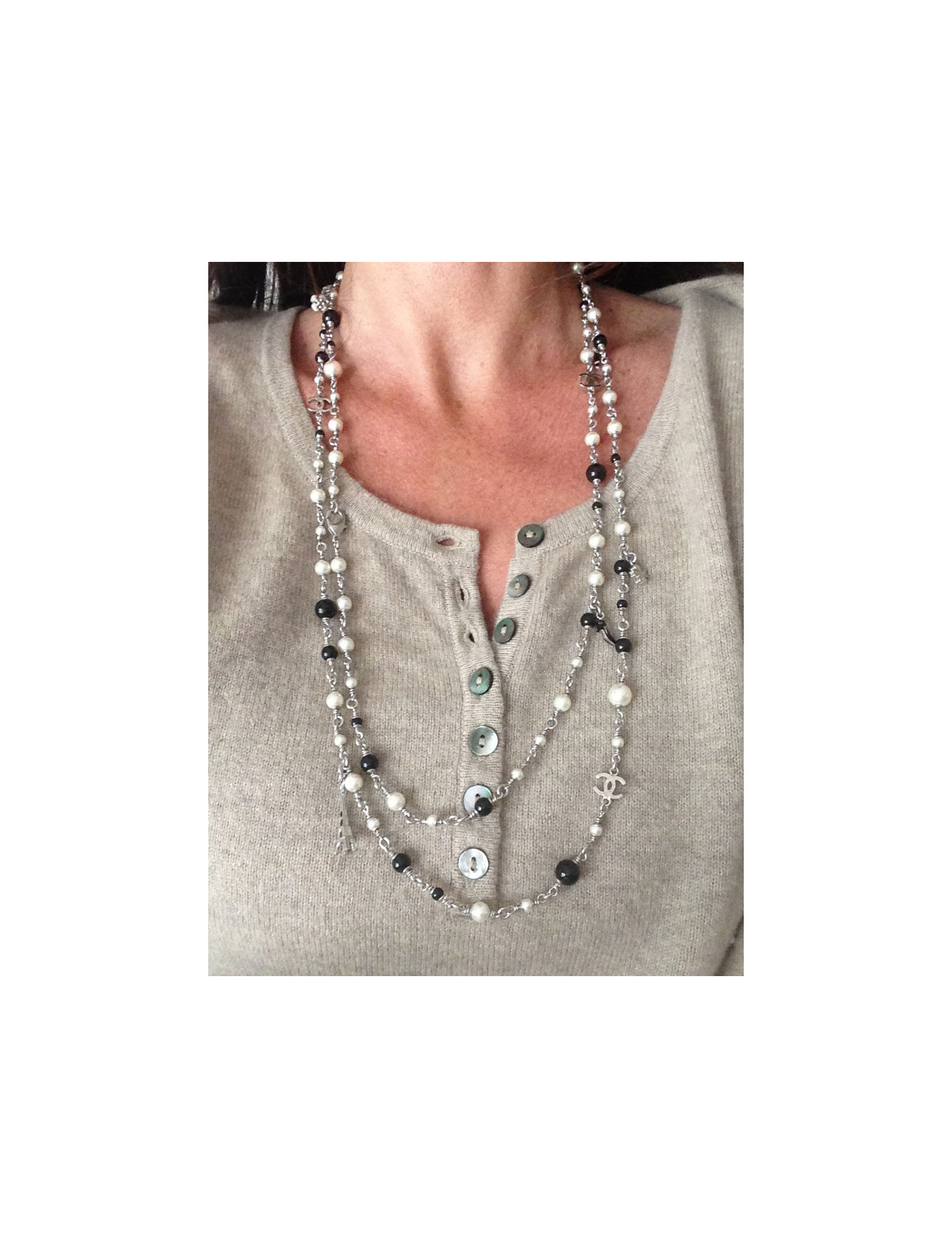 Chanel necklace you like them! It is composed of pearls black and Pearl and especially of small symbols, such as the famous Camellia, Coco, a black shoe, the Eiffel Tower, a bag Chanel quilted, clovers, and finally two c. silver coloured chain.
