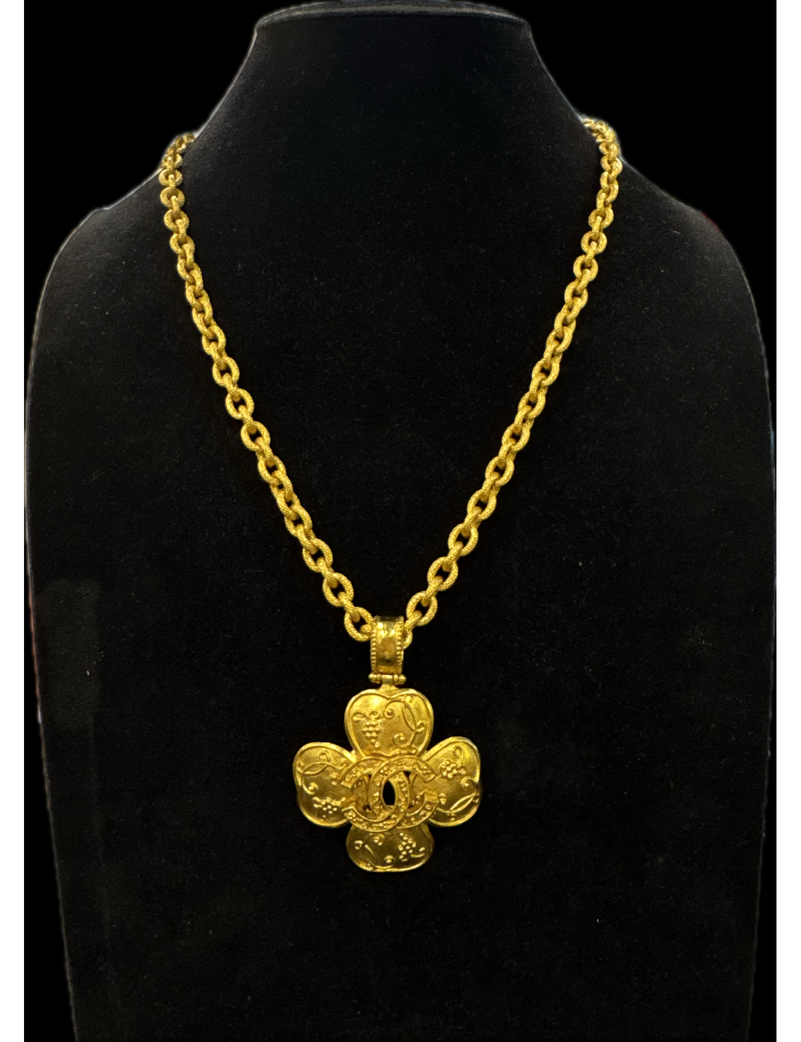 Last items in stock NECKLACES CHANEL vintage gold and emerald green molten glass long necklace CHANEL 36063 2,100.00 € CHANEL vintage gold and emerald green molten glass long necklace Condition : very goodMade in FranceMaterials : metal, molten glassColors : gold, emerald greenMeasurements : total chain length 72 cm, pendant 5 x 5 cmStamp : yesYear : 1984Details : jewelry chain reminiscent of a bag's shoulder strap. The pendant has 4 small pieces of emerald green molten... Add to cart