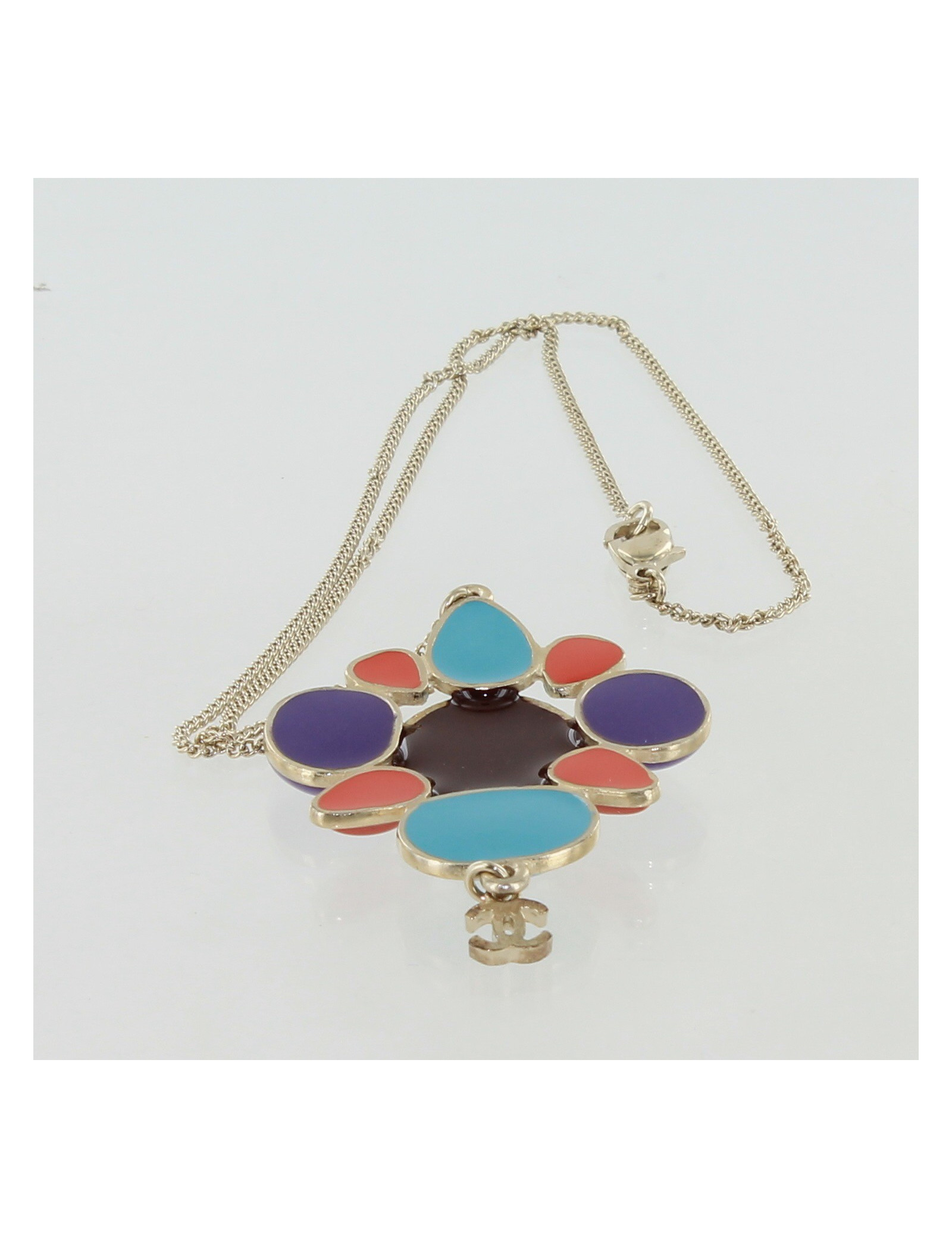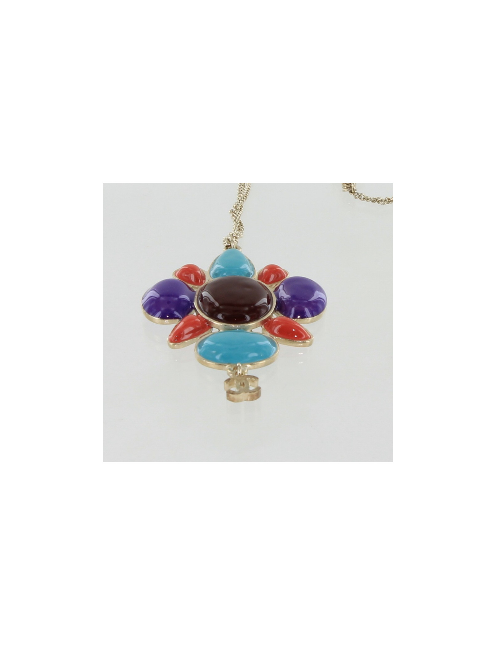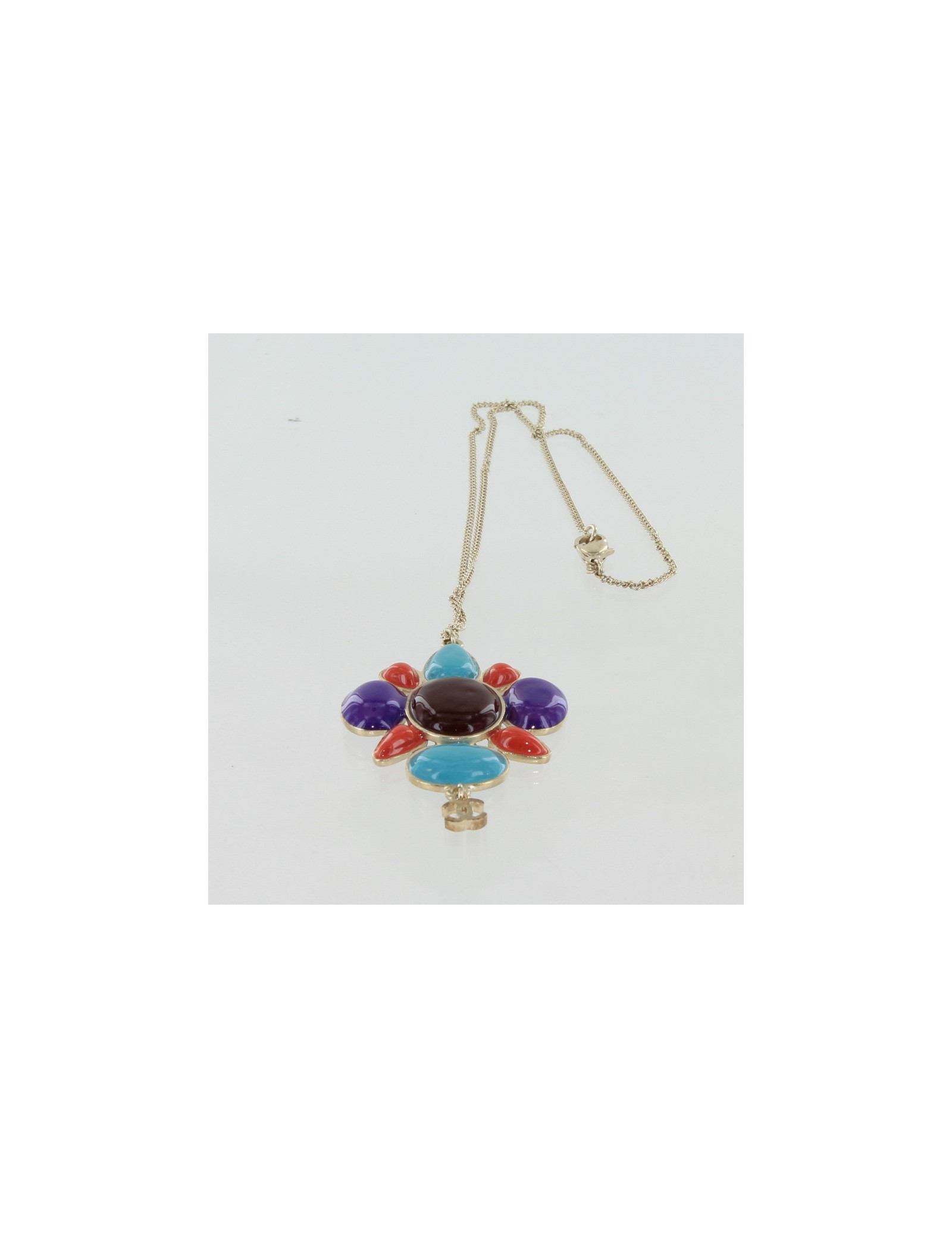 NECKLACES CHANEL multicolor choker necklace CHANEL 36155 2,550.00 € CHANEL vintage choker necklace Condition : very goodMade in FranceMaterials : gold plated metal, resinColors : yellow, amethyst, rubyMeasurements : length: 39 cm + 5 cm of adjustable chain, size of a coin medallion : 3 x 3 cmGold finish metalStamp : yesYear : 1990-1992Details : A succession of inlaid pieces in gilded metal with a resin stone at the... Add to cart