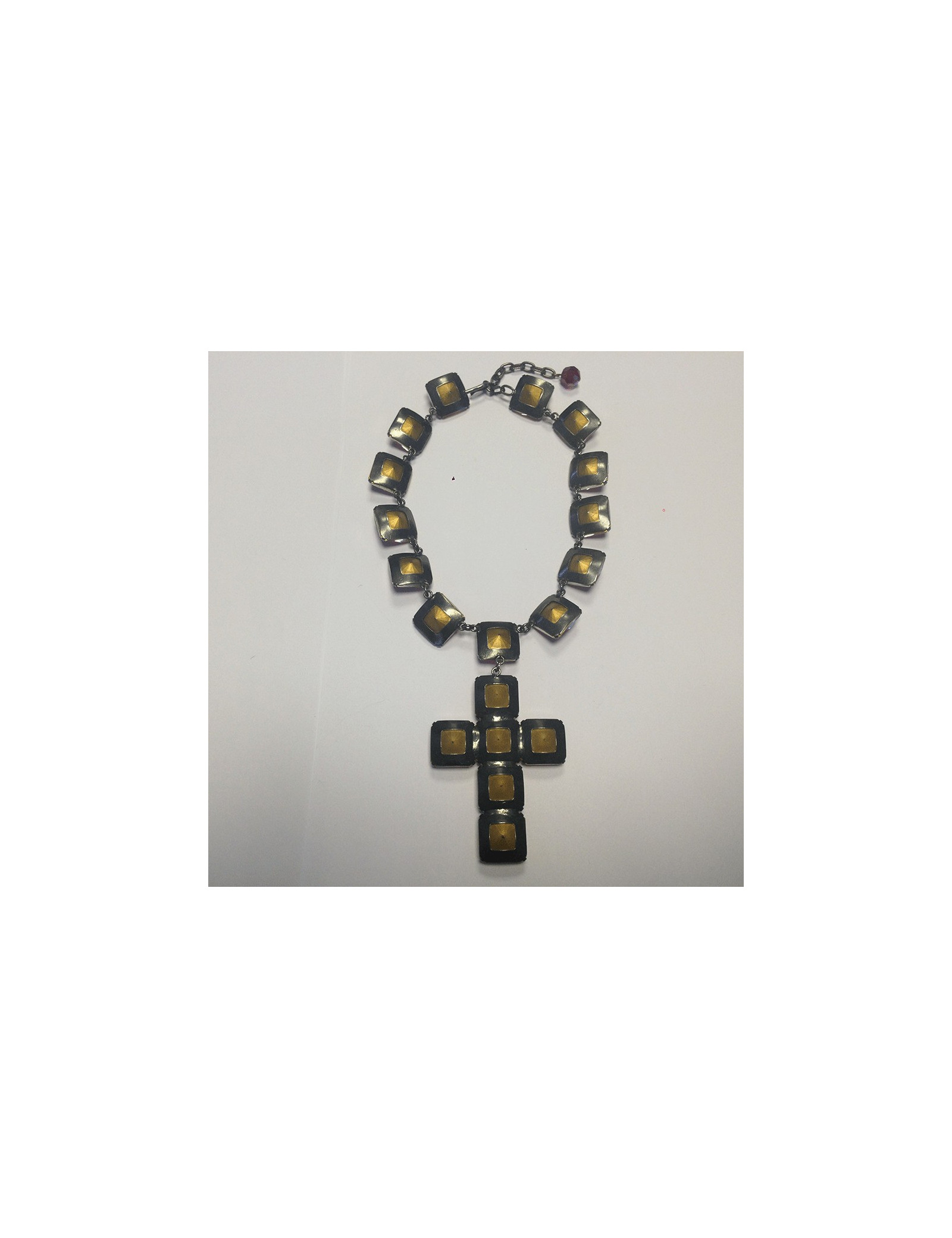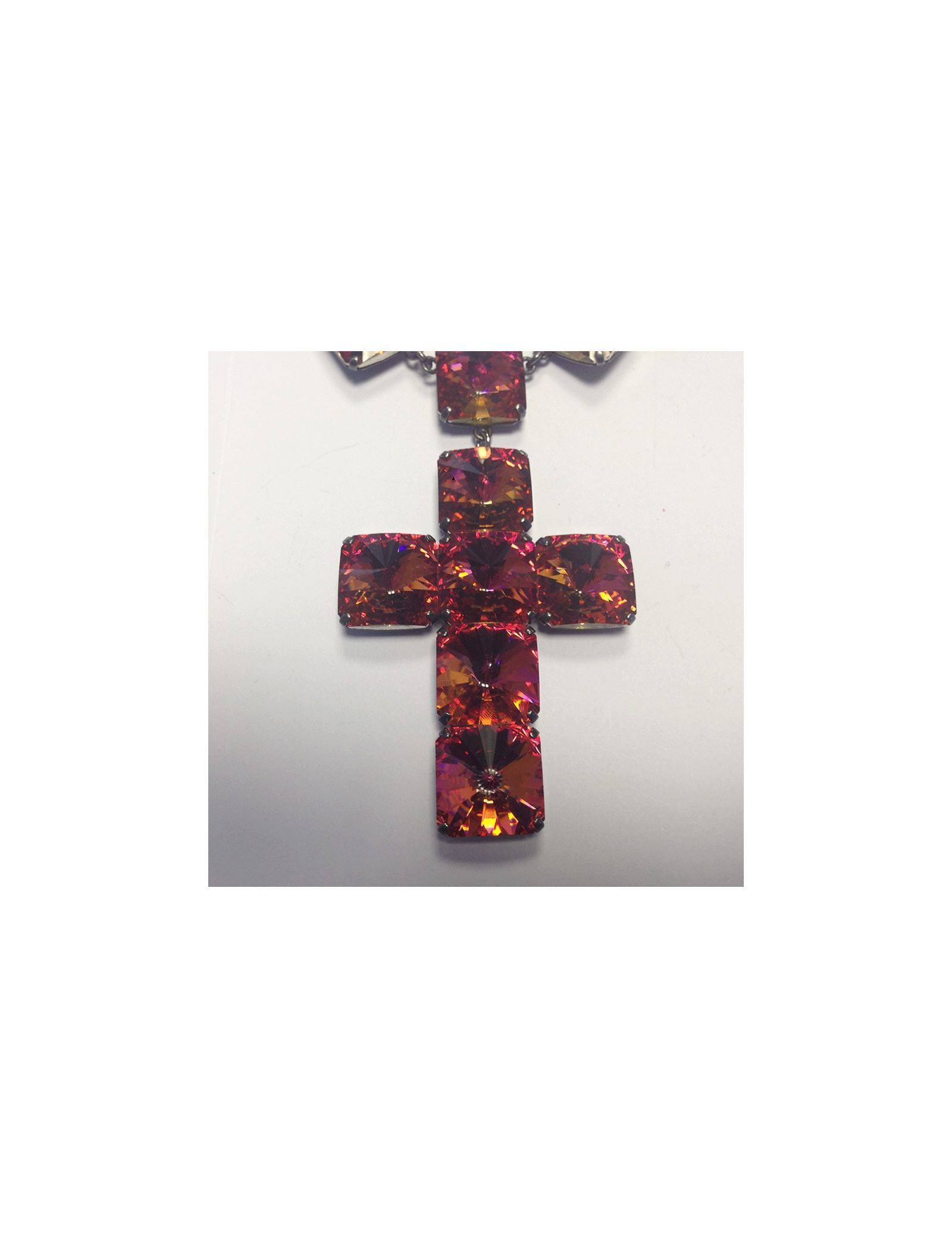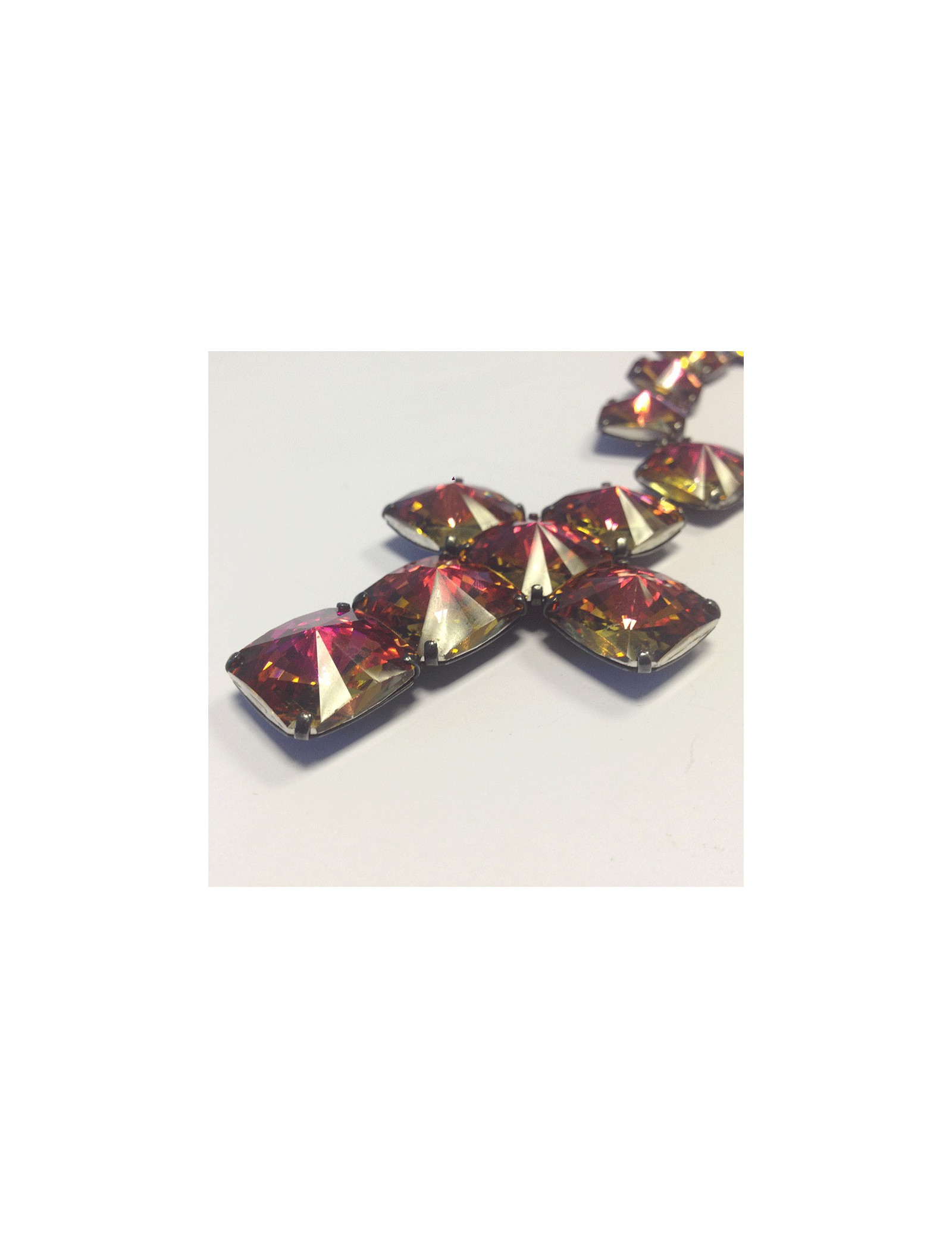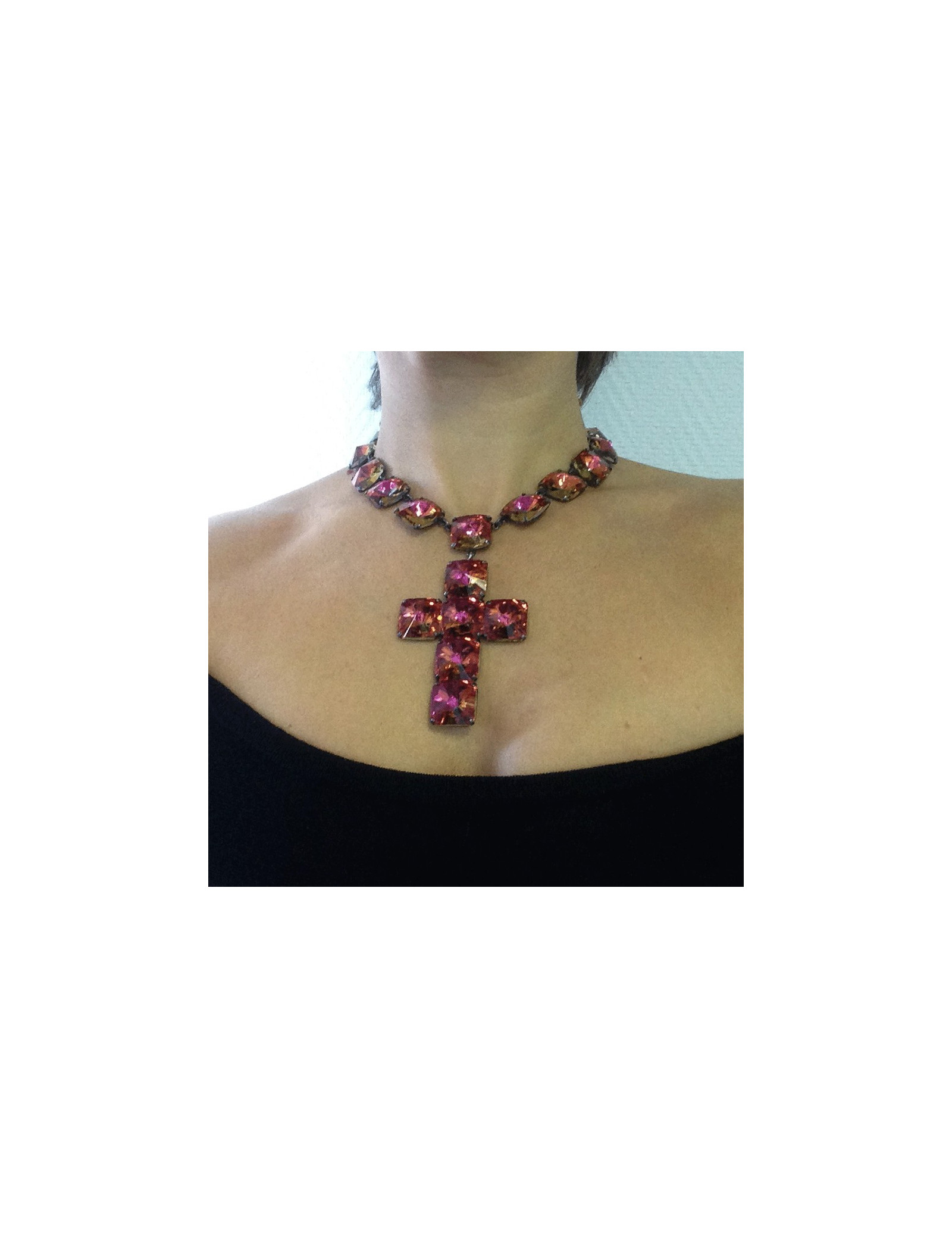 Beautiful necklace of unknown brand consisting of strassdans pink tones (a strass has a small sliver at the top). The pendant is set also Pink Rhinestone cross. Metal chain. In very good condition.