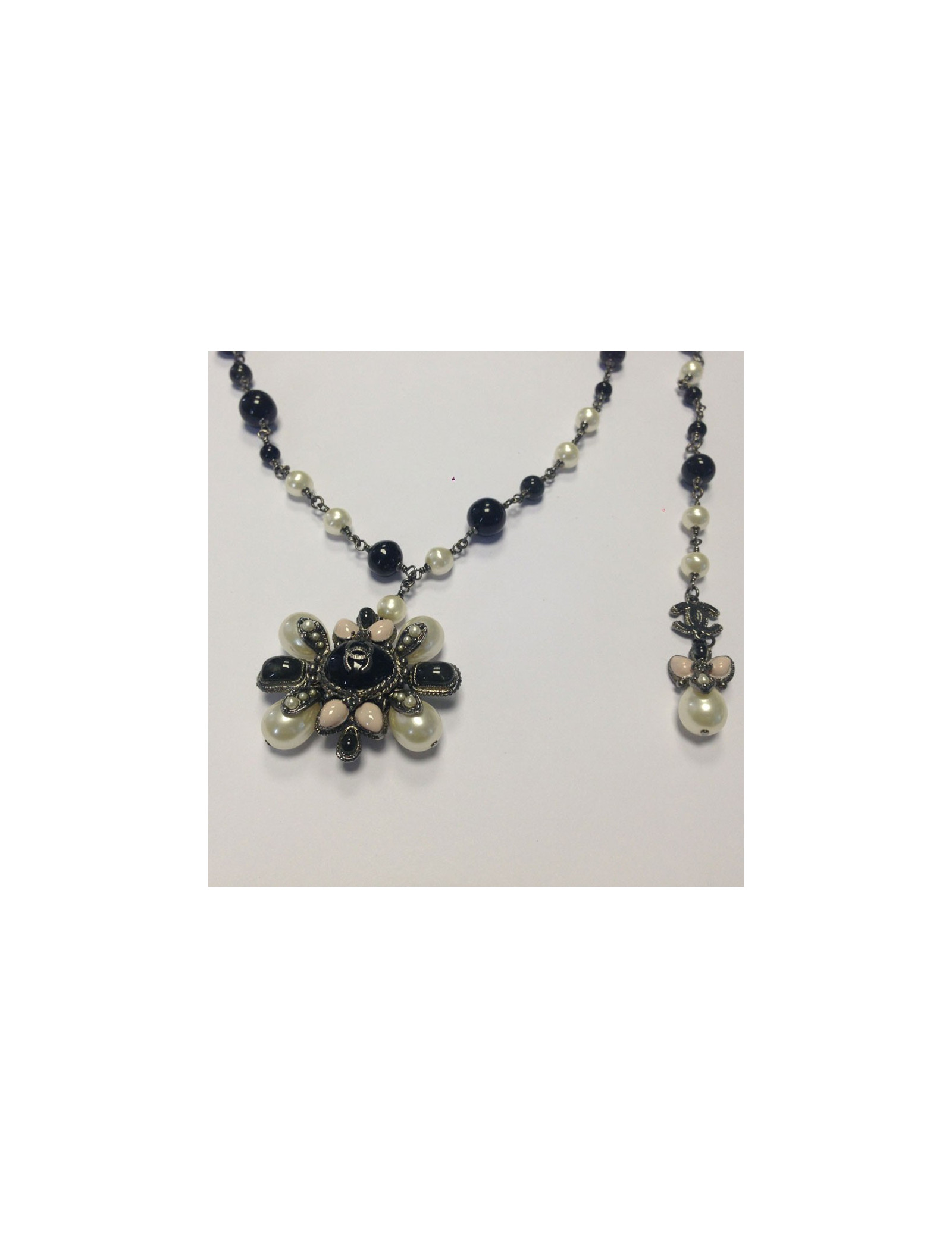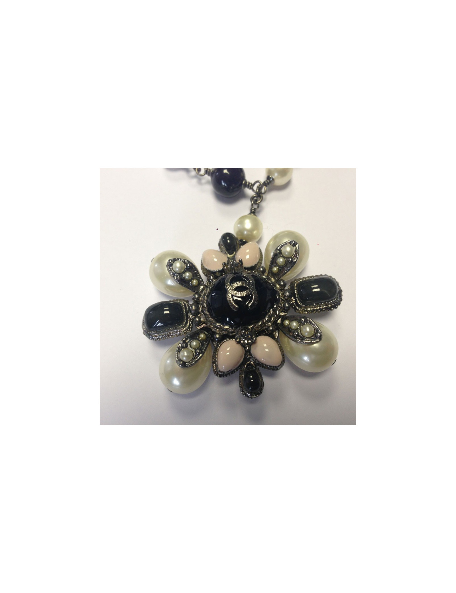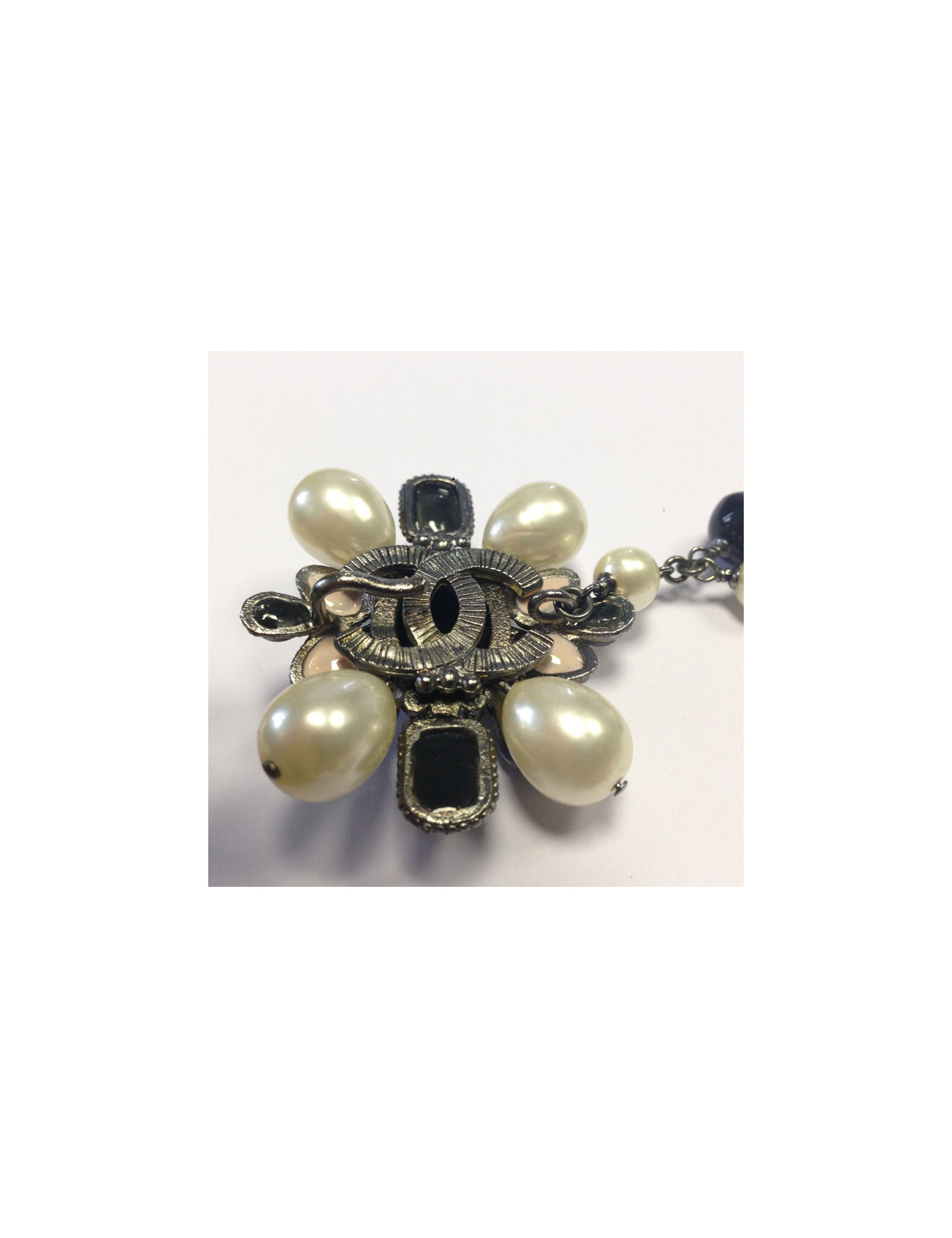 Superb! belt-Saltire CHANEL black and Pearly beads mounted on silver. Clasp signed jewel (CC), with Parma cabochons, pearly beads and black stones. Drop-shaped pendant, pearl beads and purple cabochon. Ornate CC of small beads. Never worn.