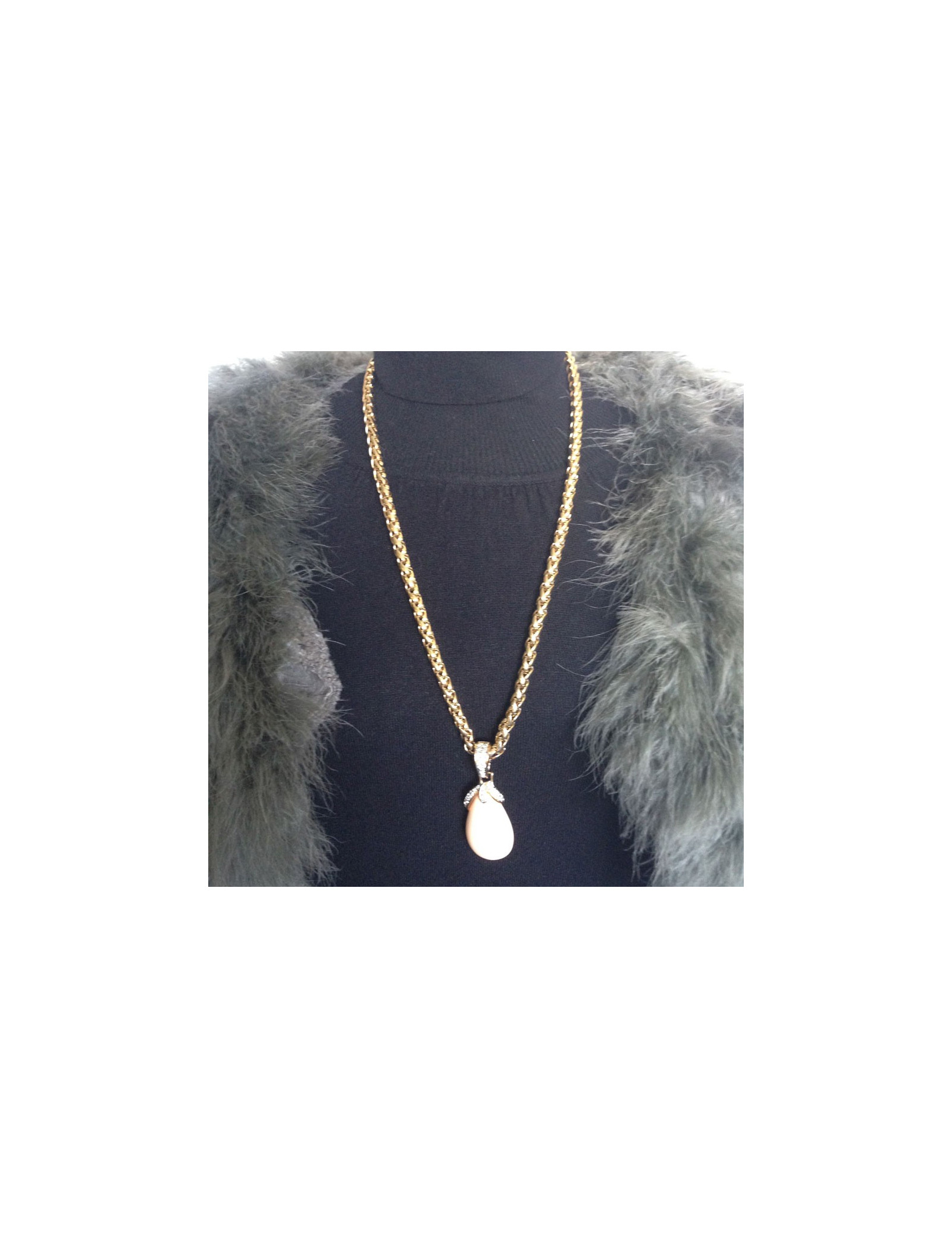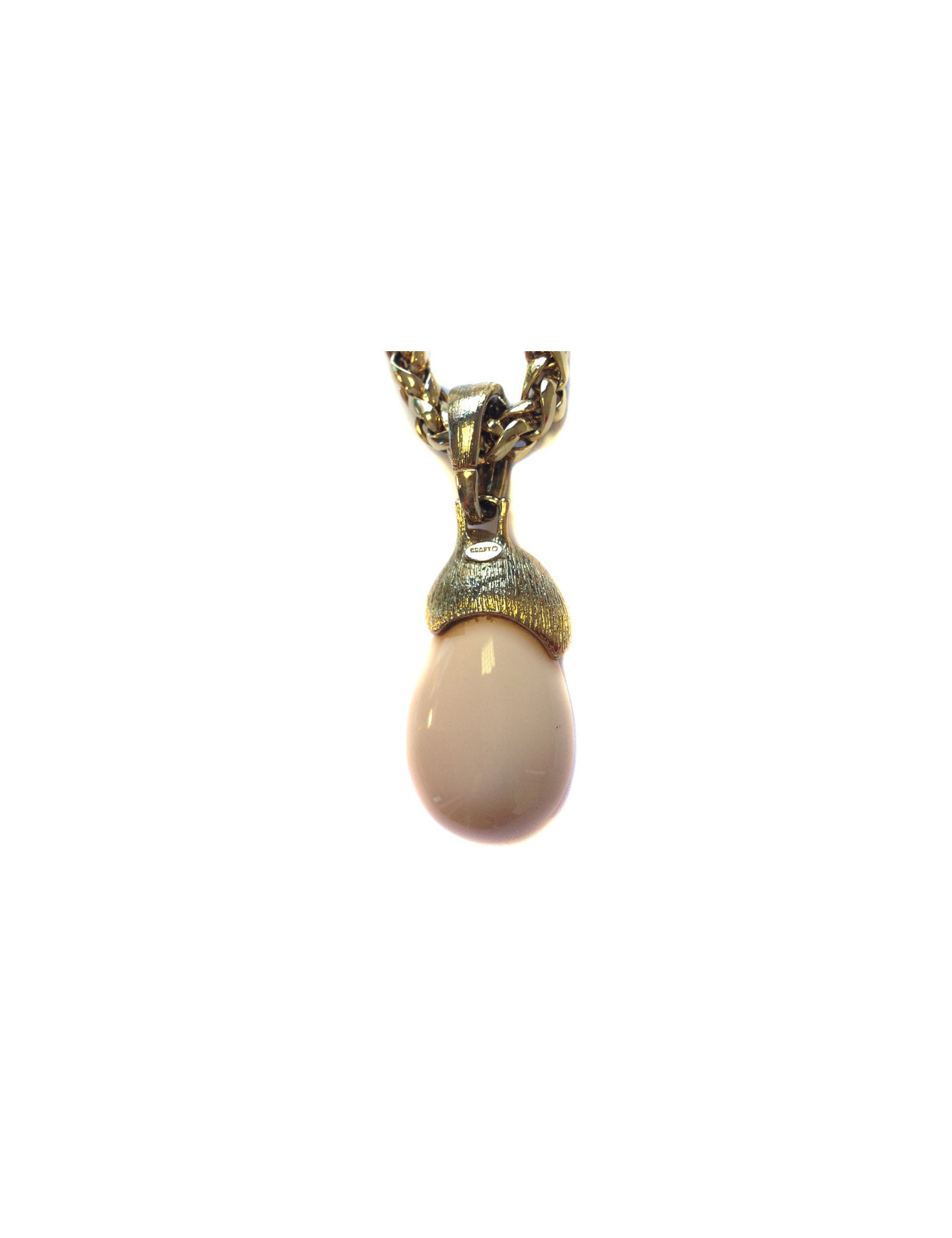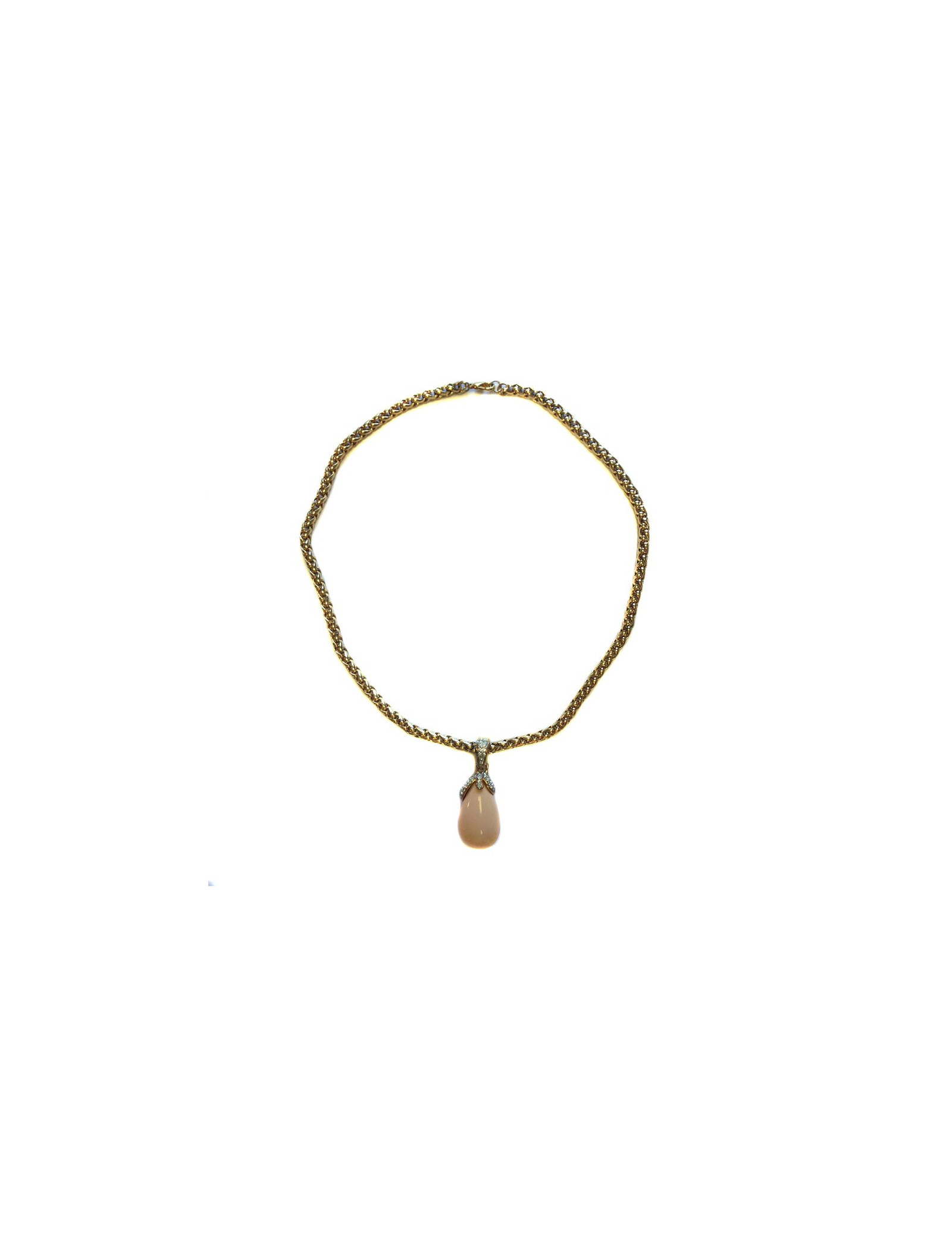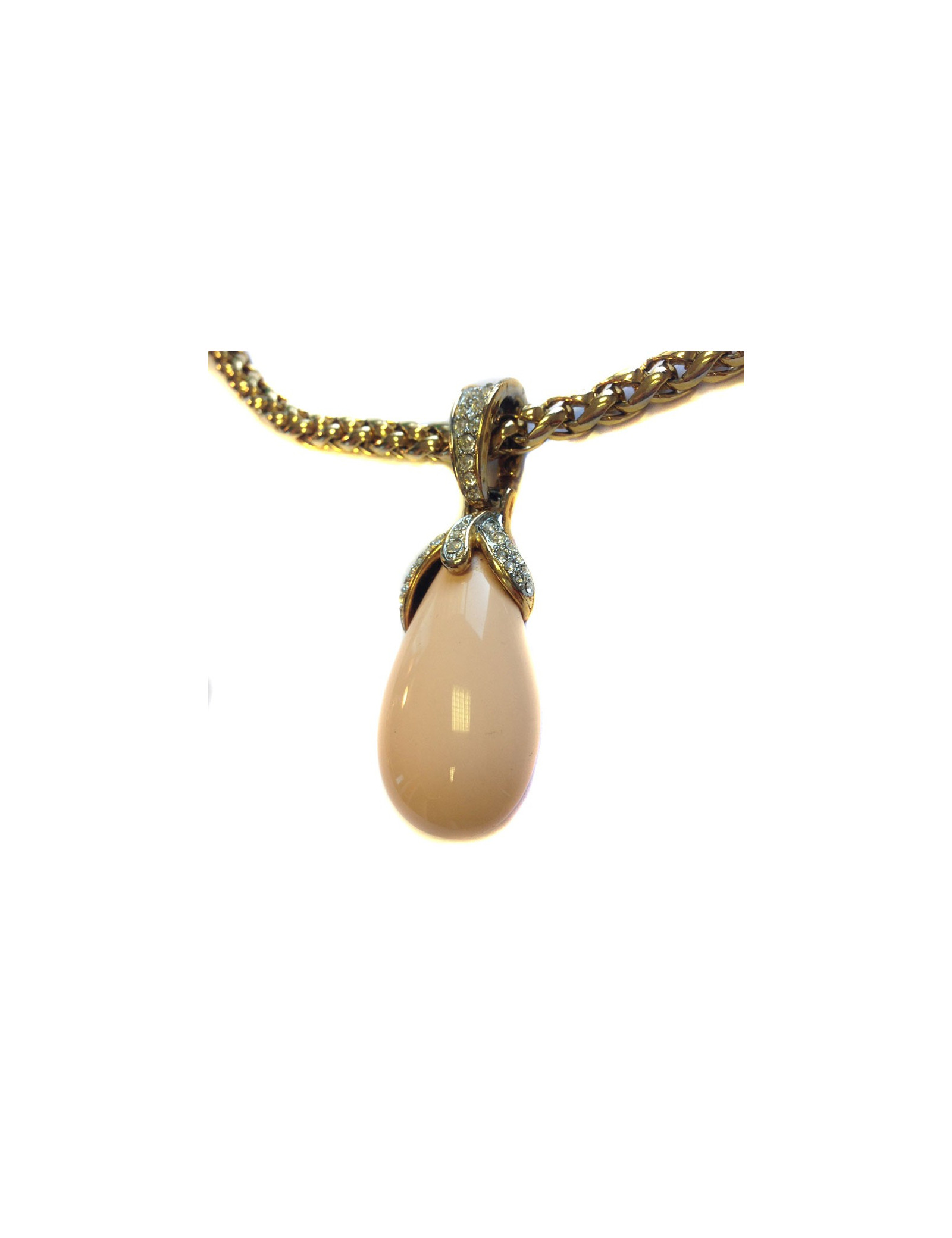 Very beautiful necklace GRAFT knit Golden Palm and pendant Teardrop pale coral color. The pendant hangs from the chain by a ring set with Rhinestones on his half. Can be worn with jeans with an evening dress. In very good condition.