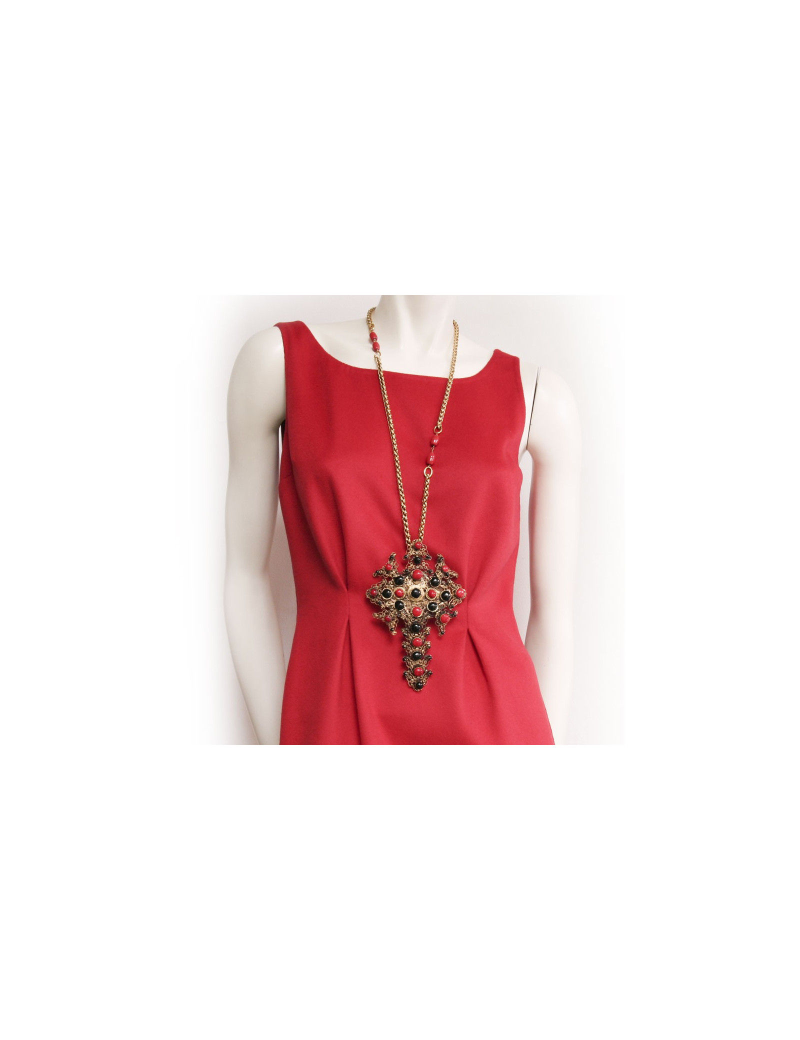 This beautiful imposing Saltire cross into paste in black and red glass, appeared in the Magazine Vogue Paris. Production in the workshops of the brand. Very good condition. The jewelry is dipped in gold.