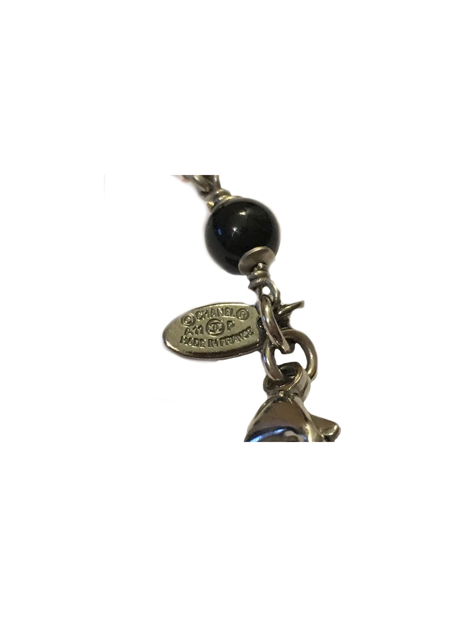 Very nice necklace in silver and gray pearls, pearly, transparent CHANEL sequin and black sizes. CC with Rhinestones, black, and white CC in rhinestone white. Small spheres in silver with black and white rhinestones. Collection 2011.
