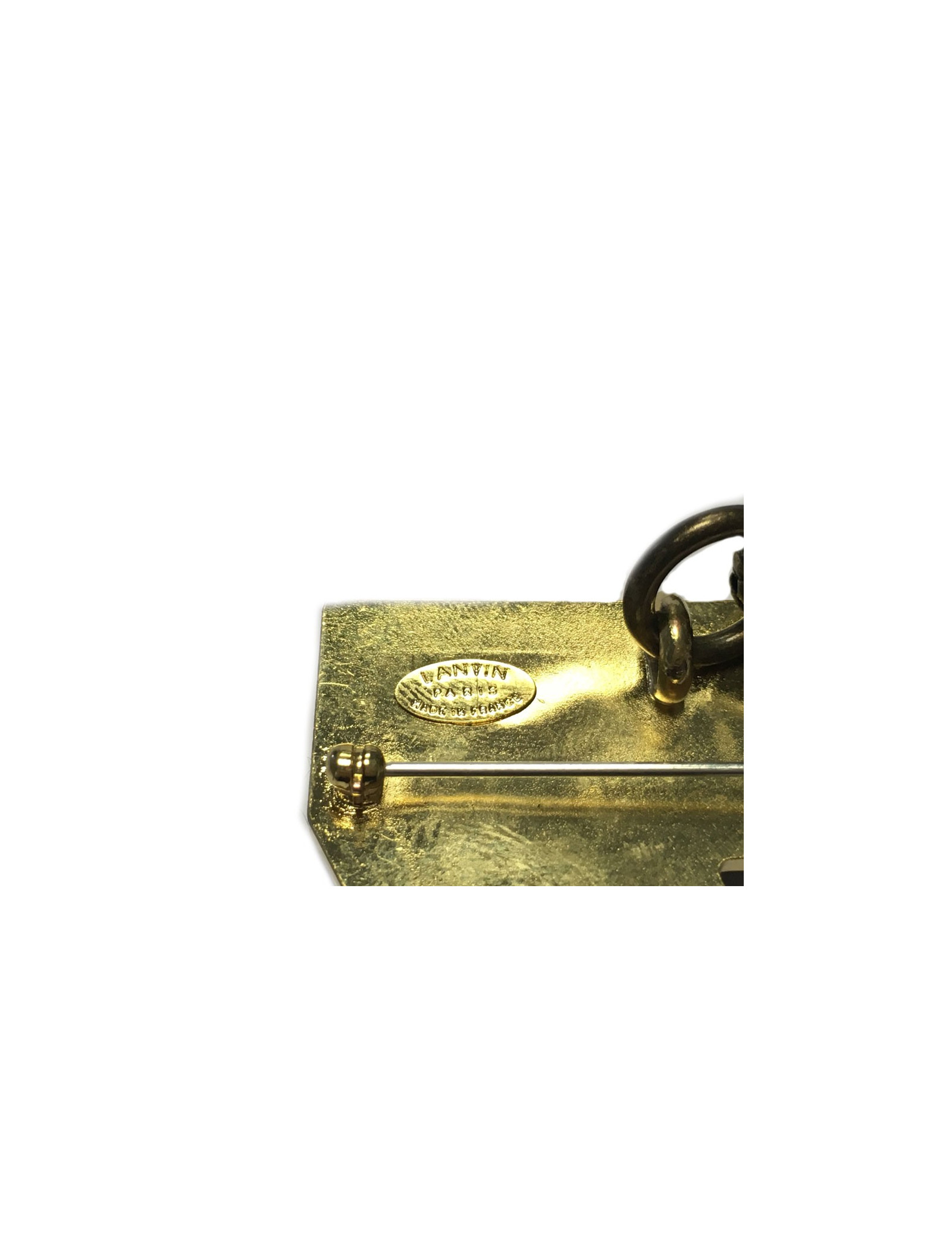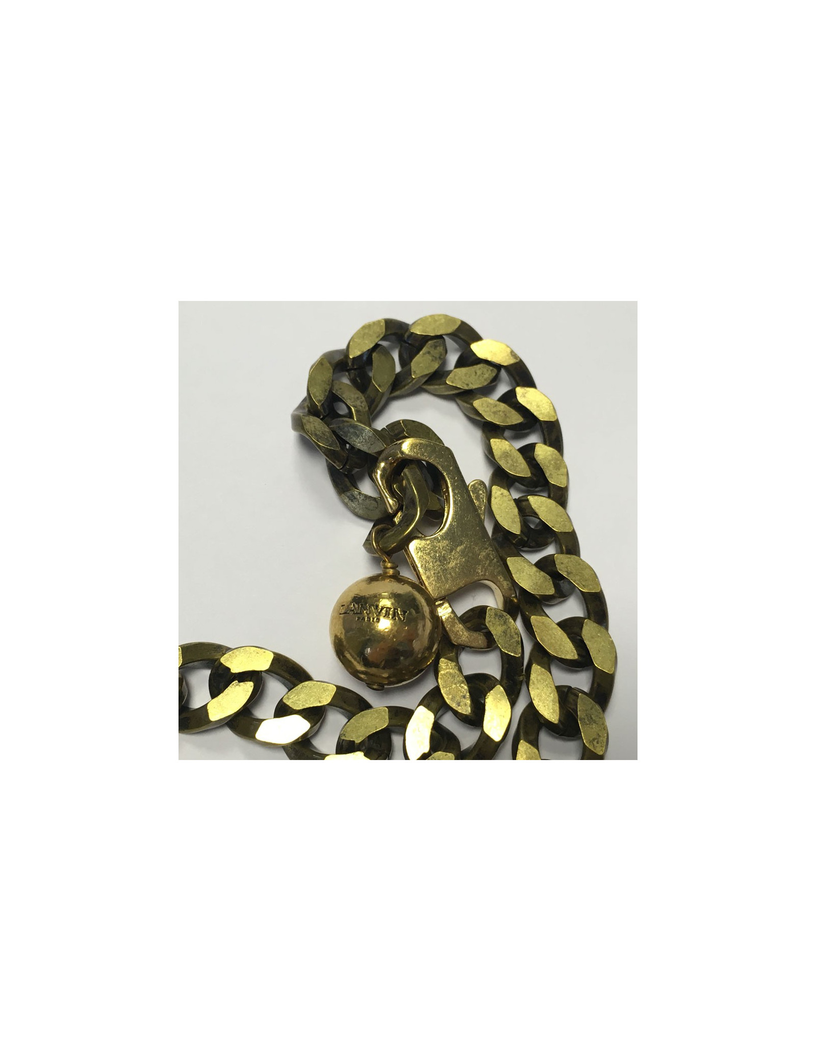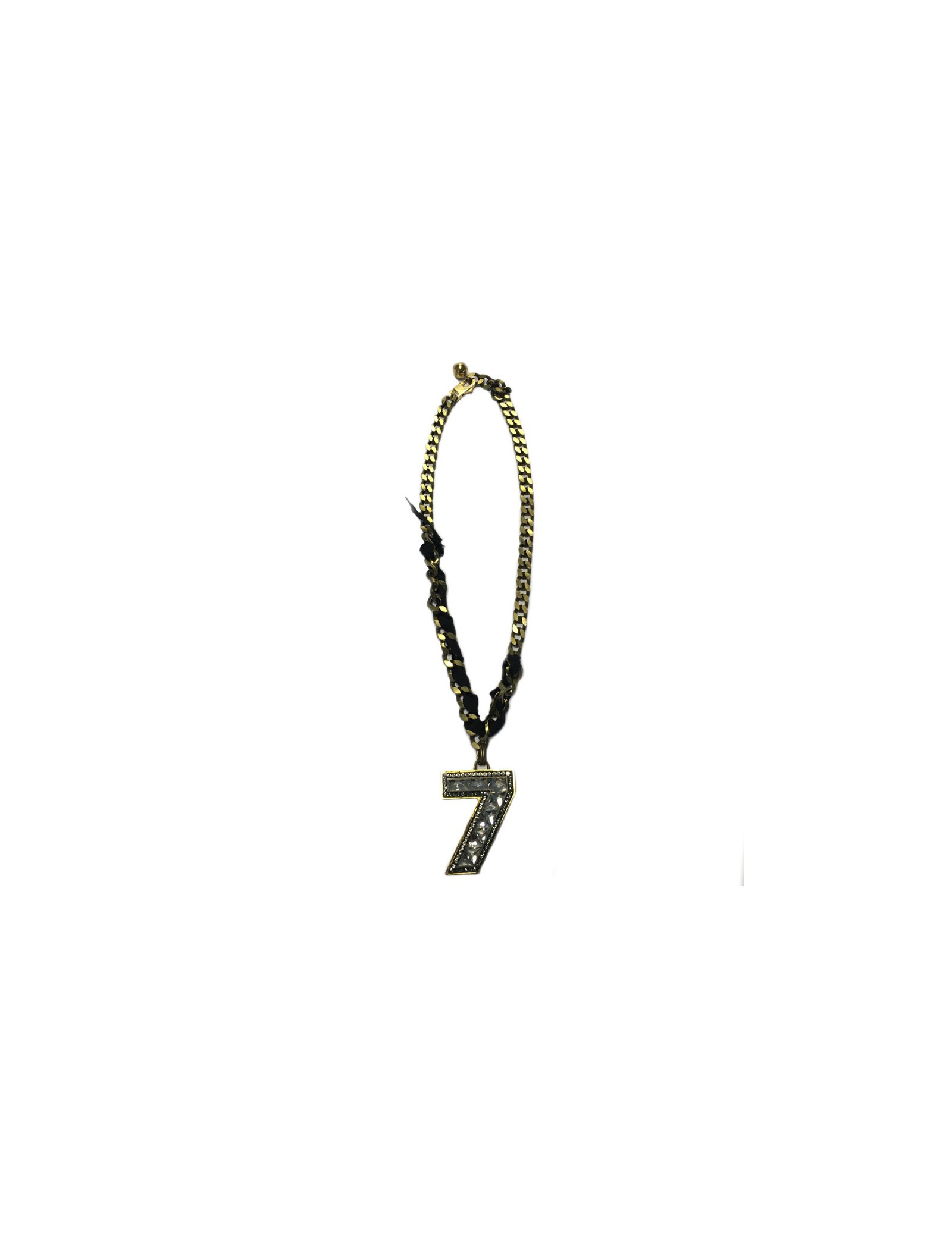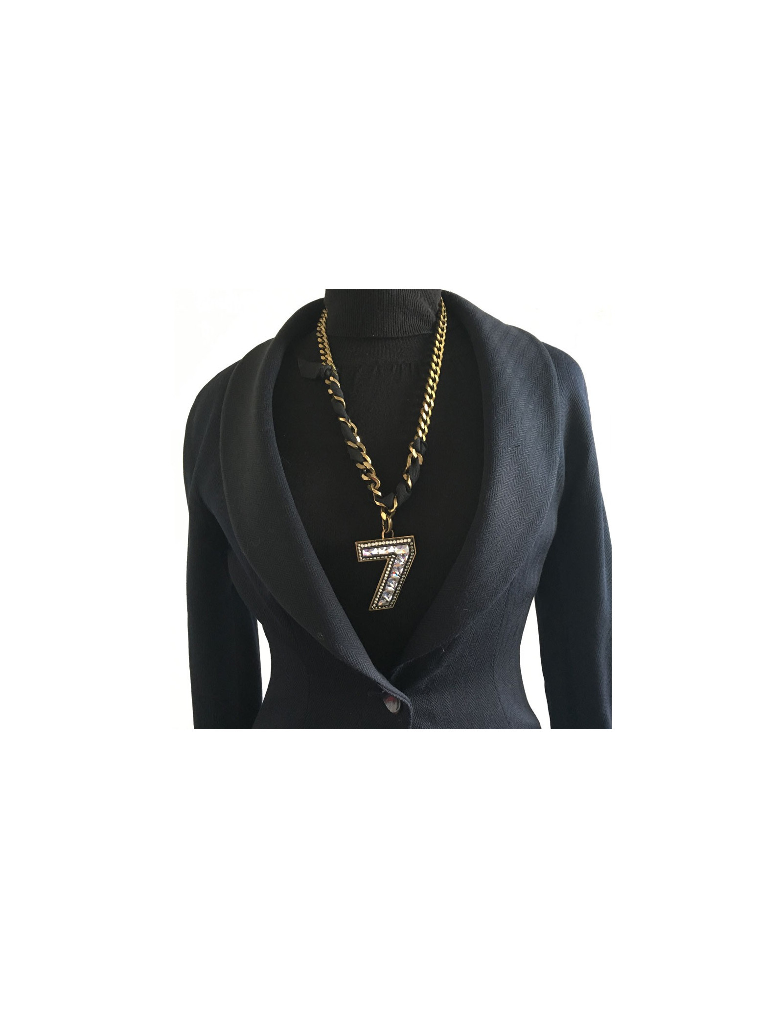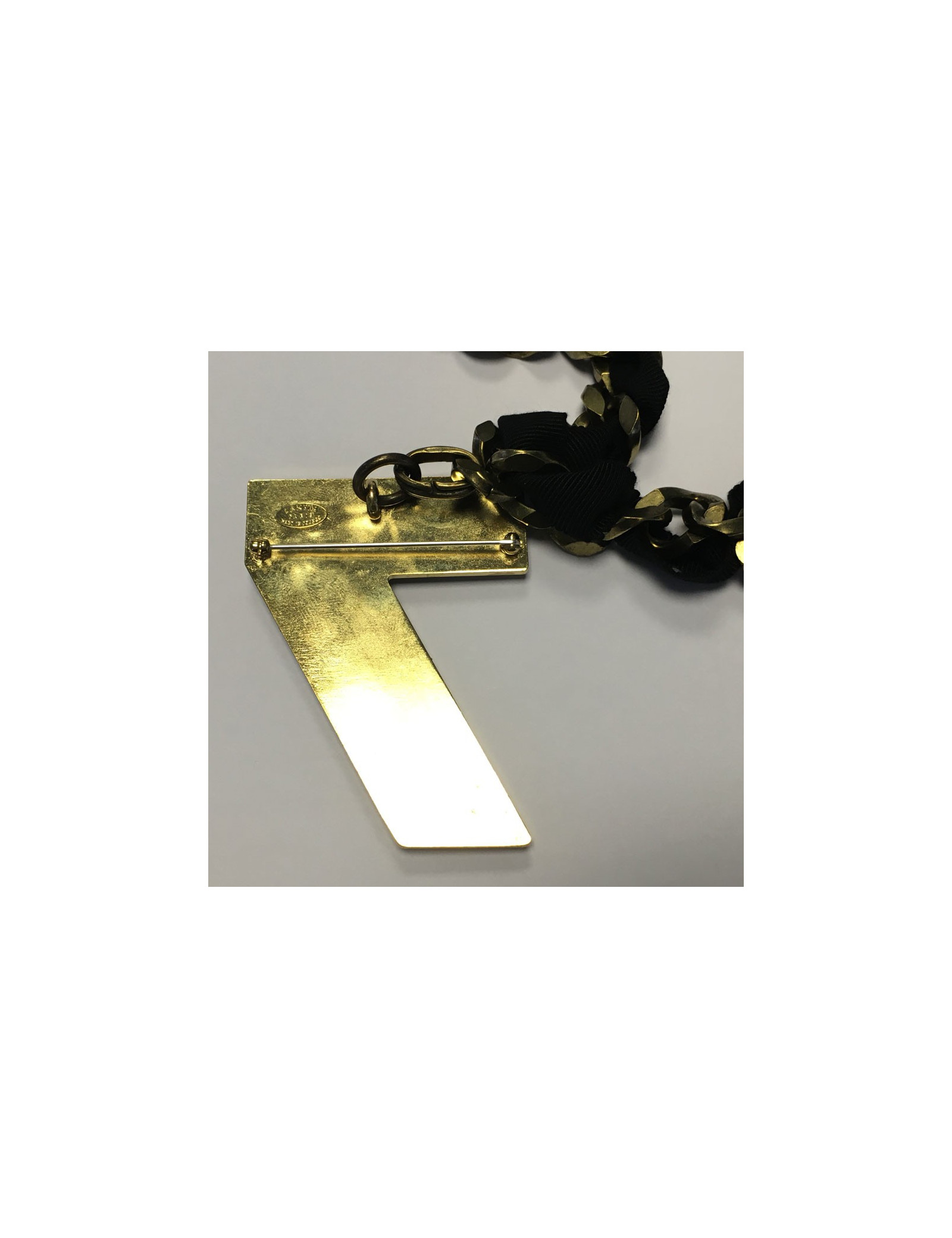 LANVIN necklace chain with large matte gold mesh surrounded by a black grosgrain ribbon. Pin pendant number 7 in rhinestones. Never worn. Pastille of the present brand.