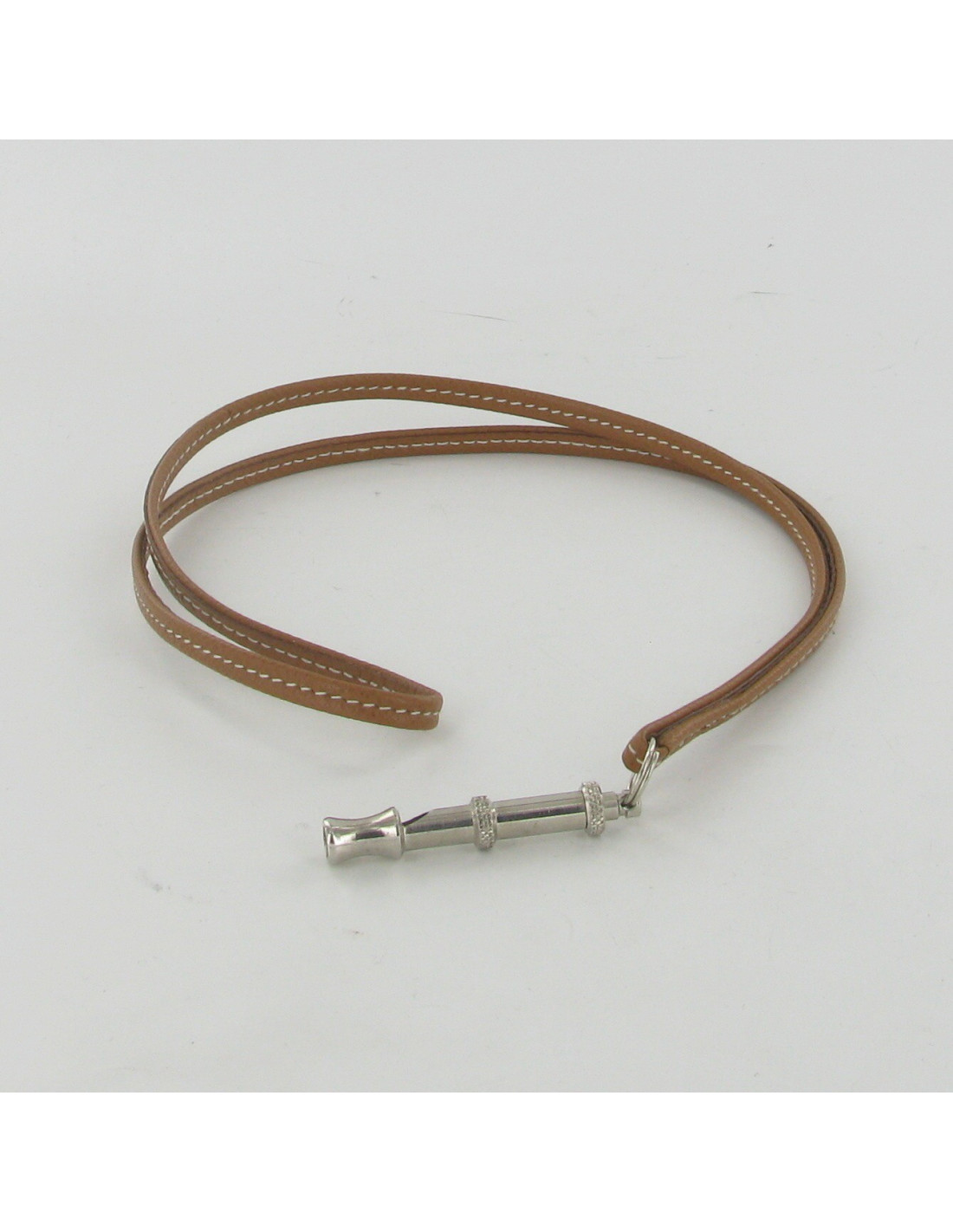 Beautiful whistle to ultra sound mounted on a cord deauville gold leather HERMES steel. Nice wink of the brand, to wear offbeat in the city.