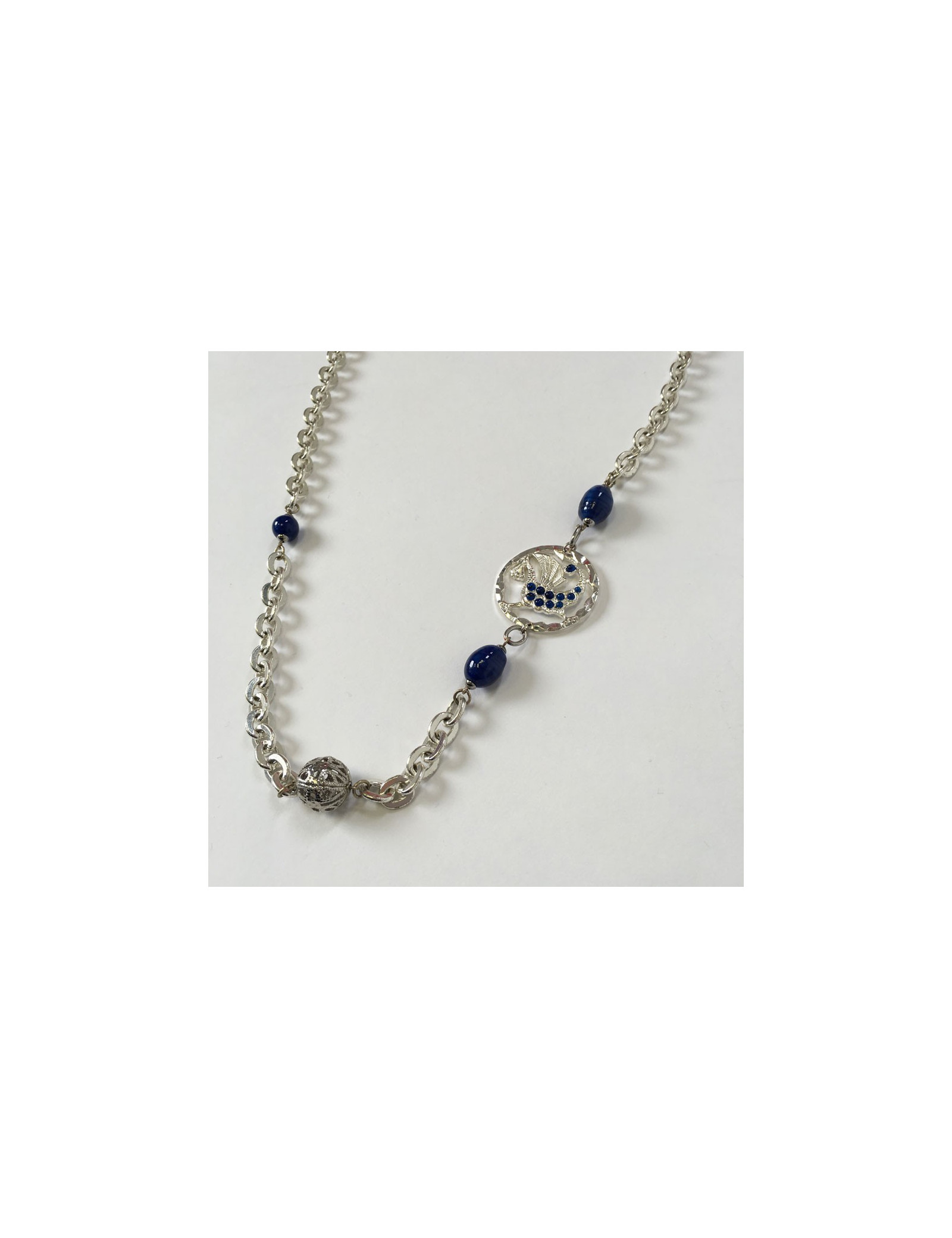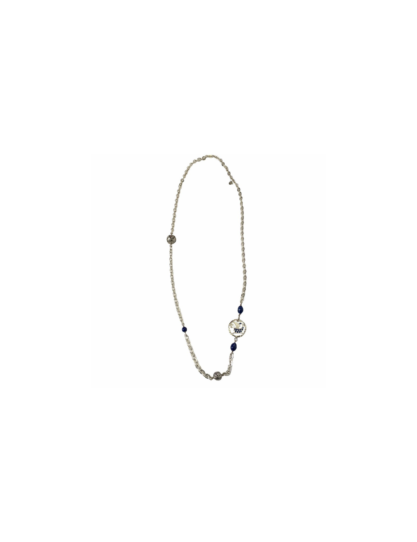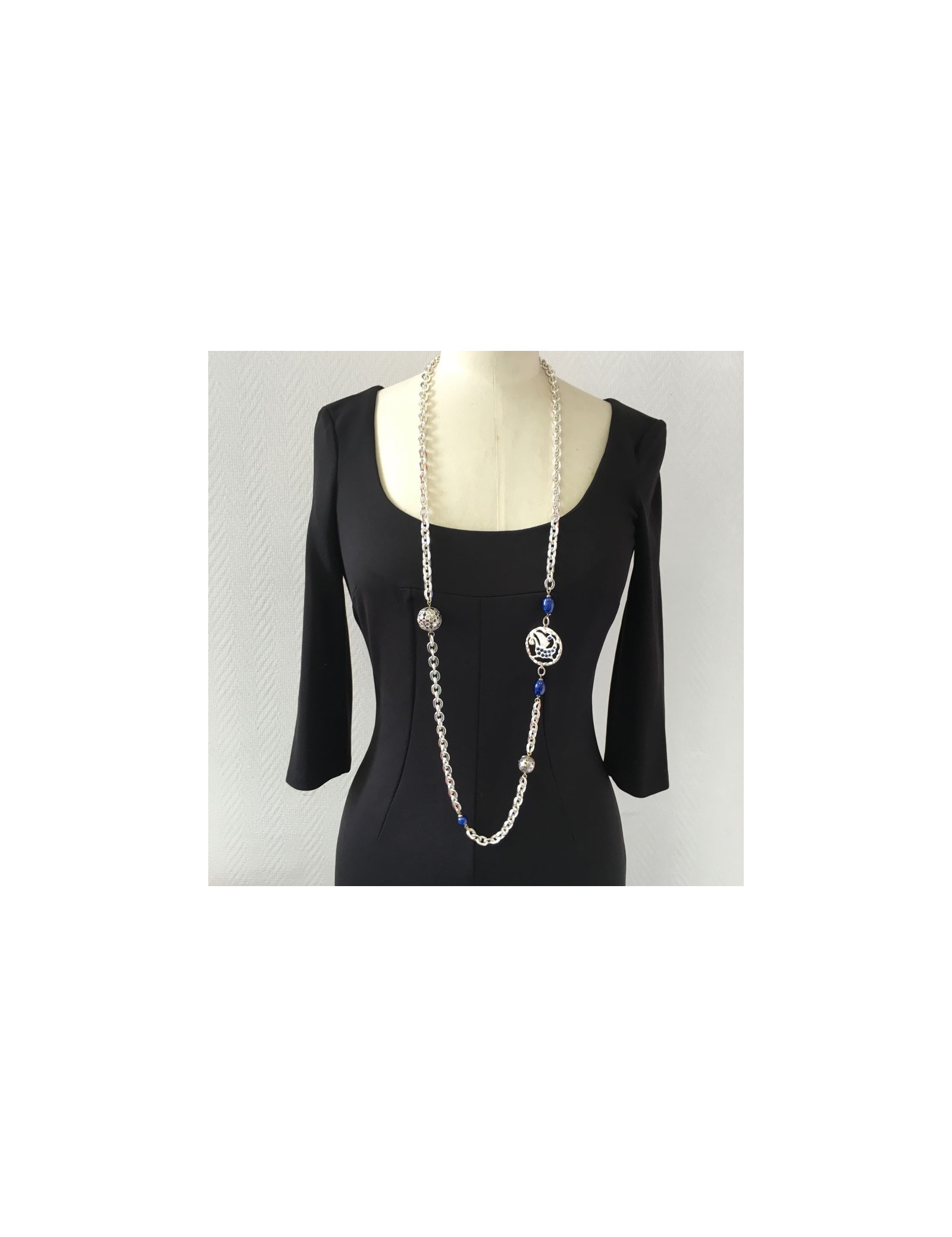 Beautiful necklace MARGUERITE of VALOIS, string silver, metal 2 balls Openwork, blue beads and piece representing a dragon, seam of blue beads.
