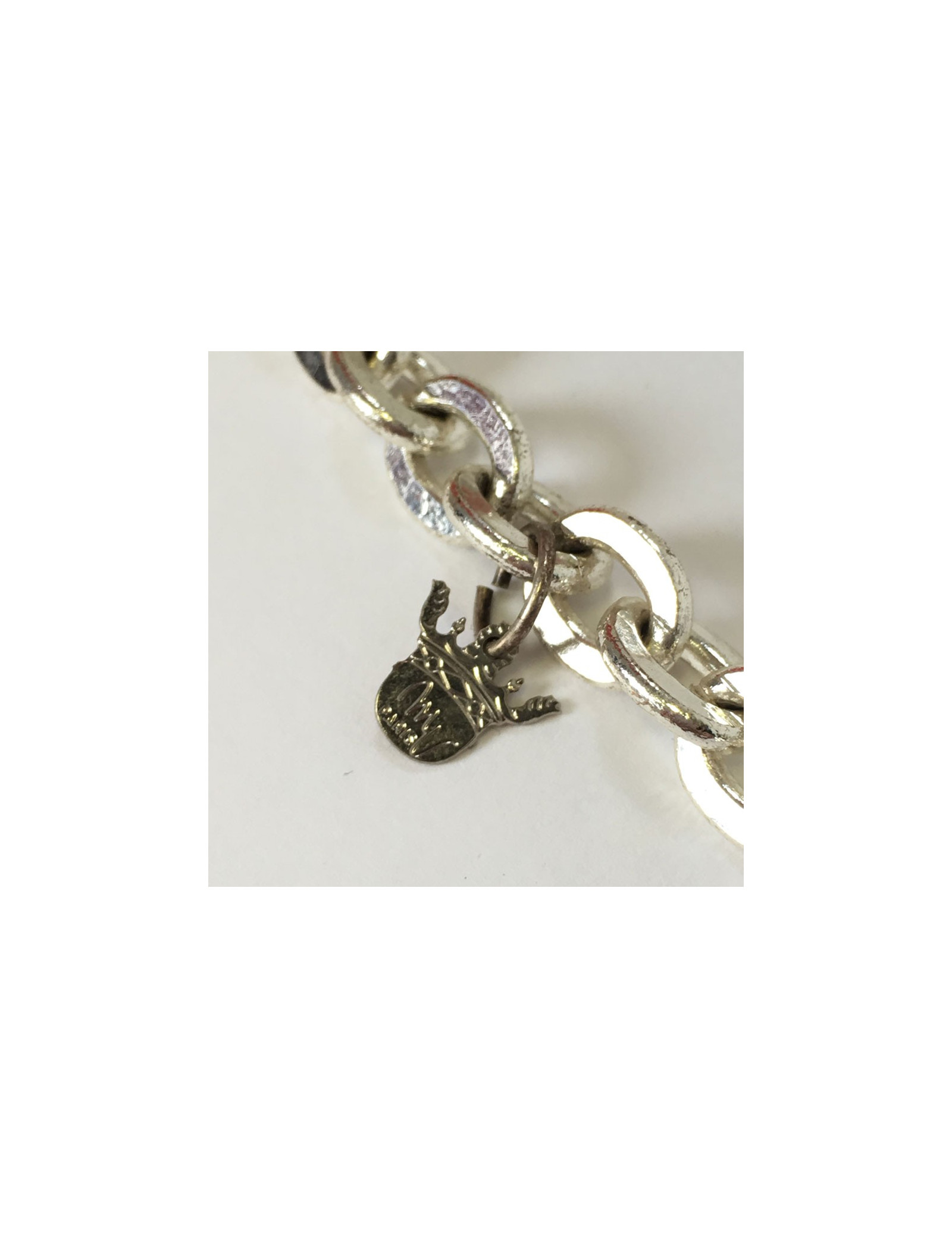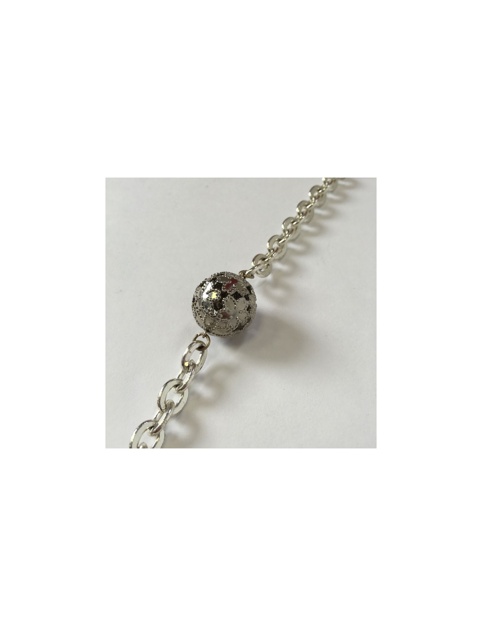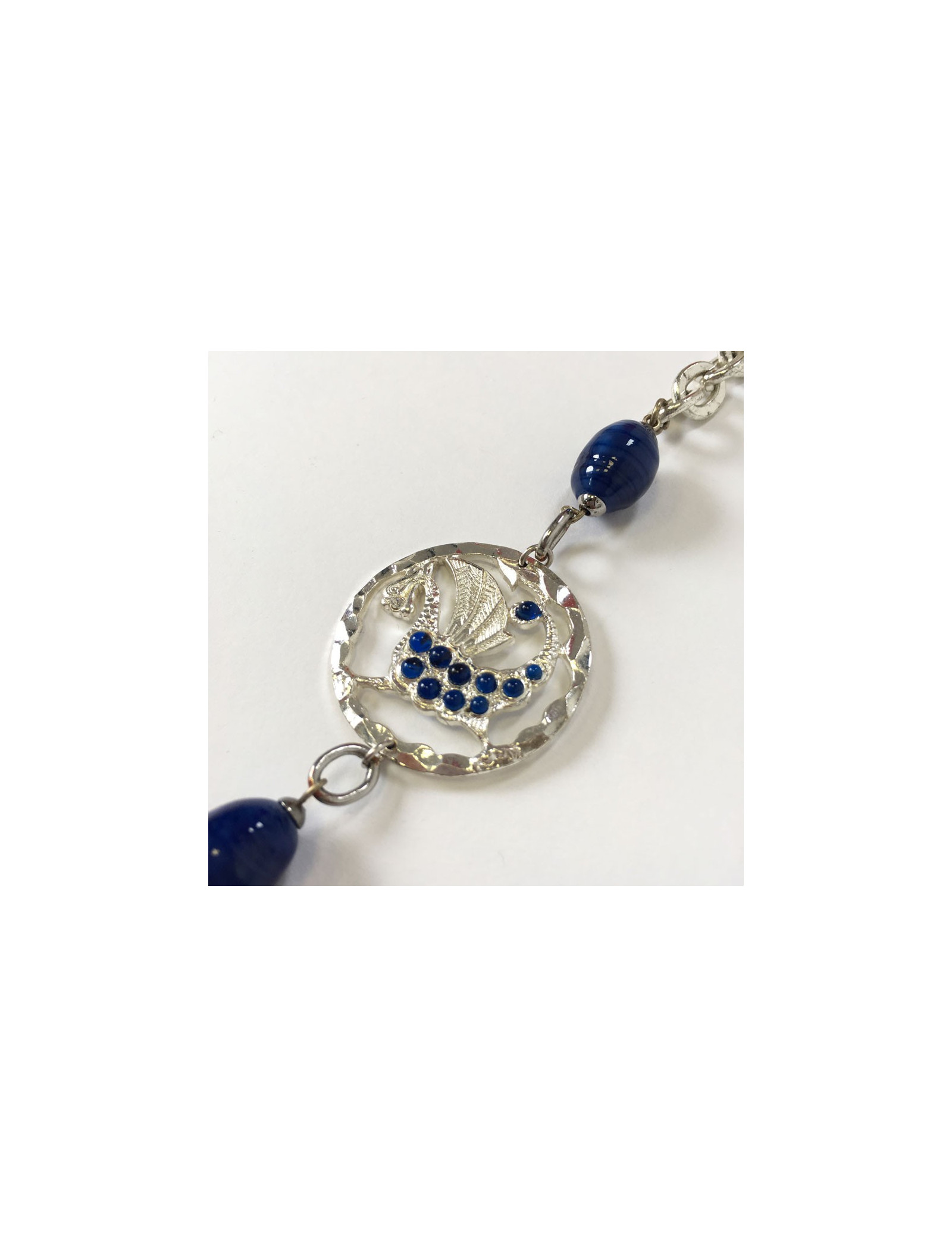 Beautiful necklace MARGUERITE of VALOIS, string silver, metal 2 balls Openwork, blue beads and piece representing a dragon, seam of blue beads.