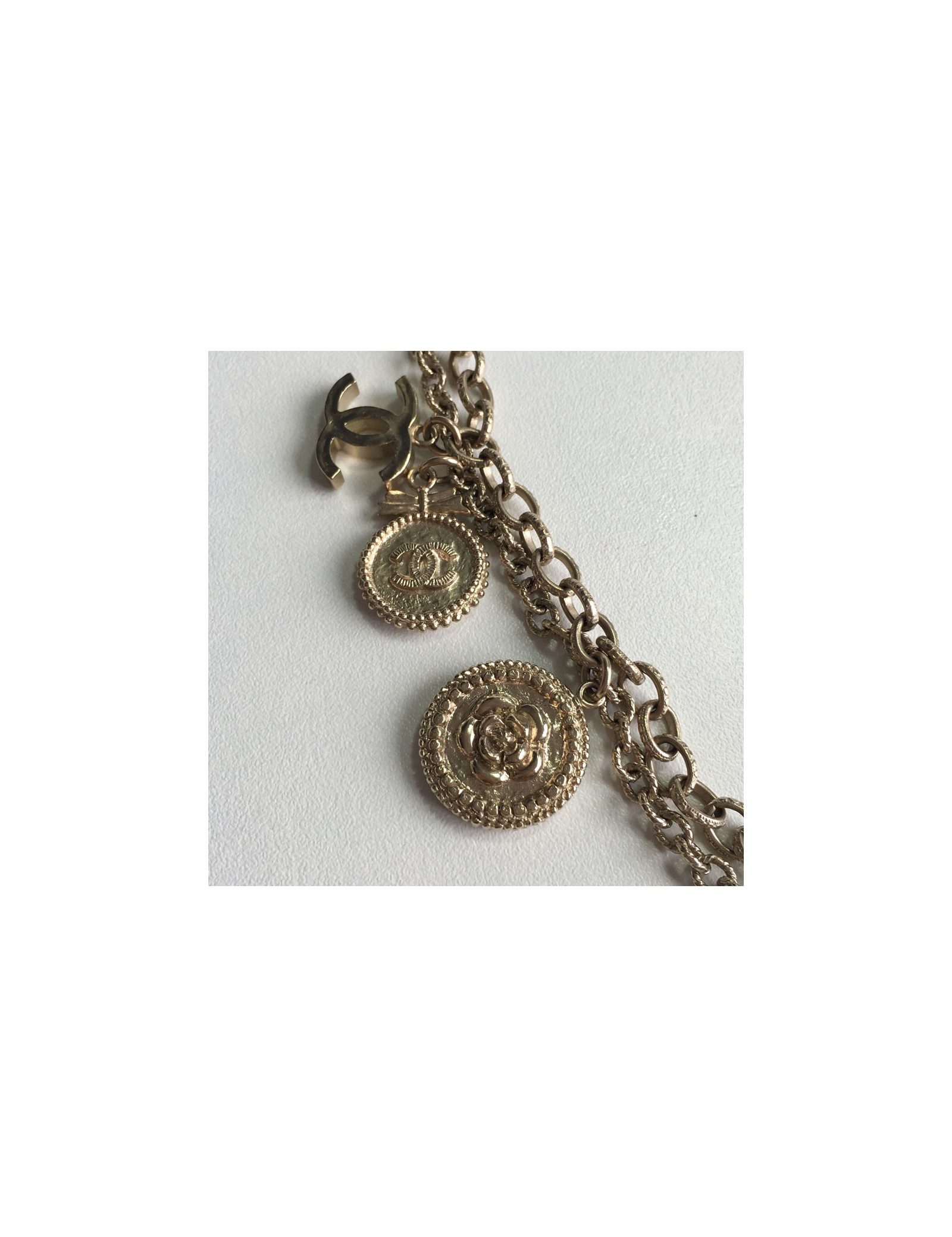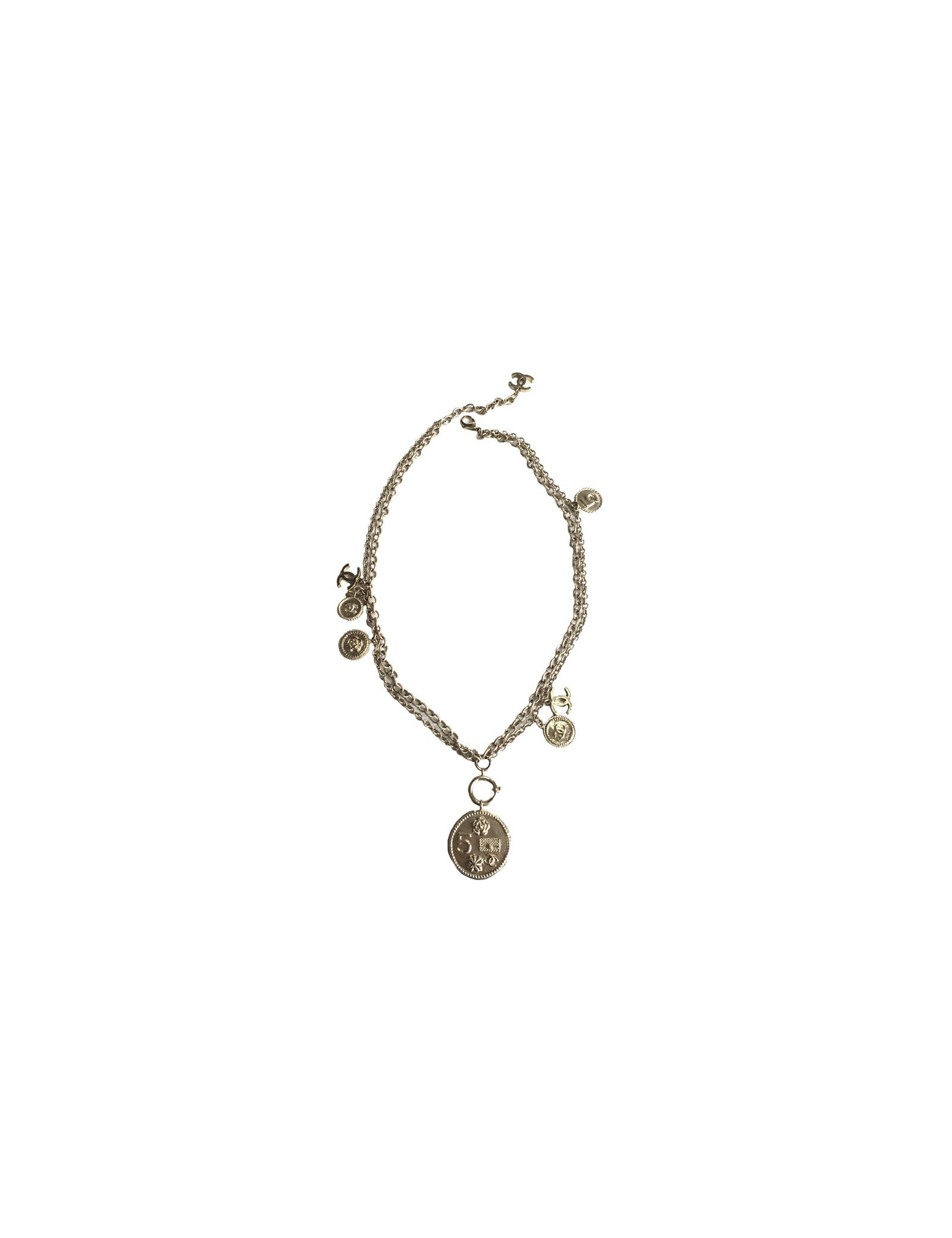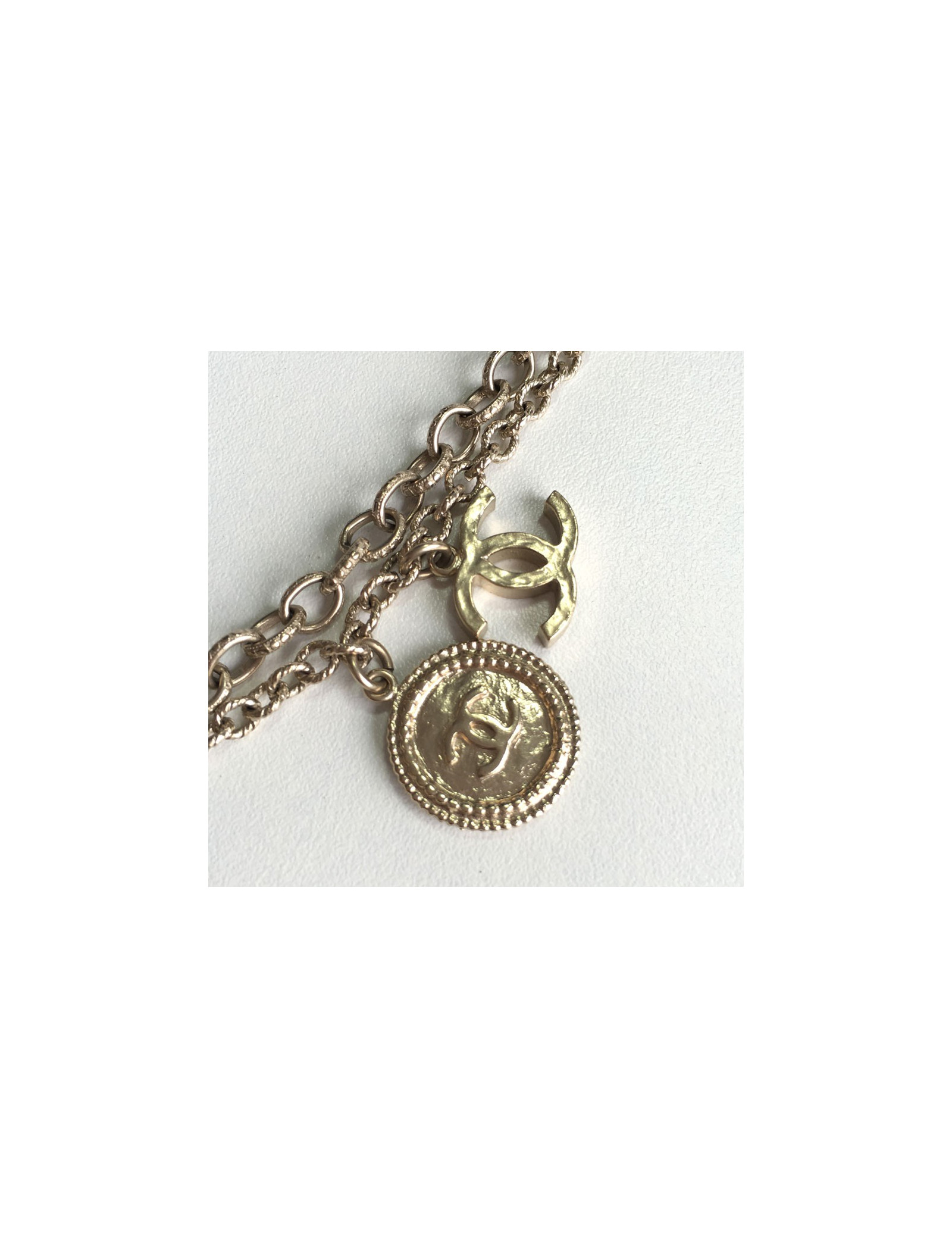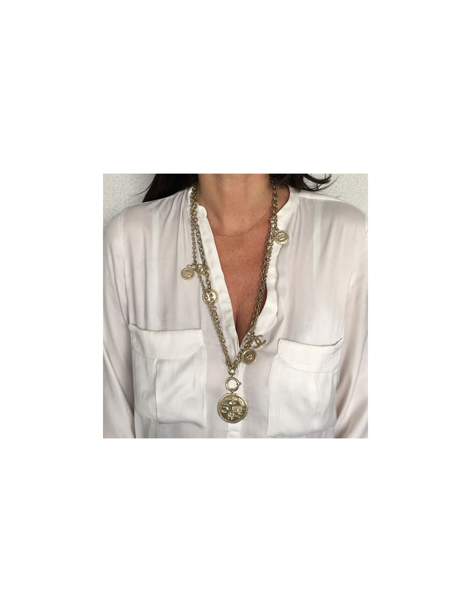 Sold NECKLACES CHANEL vintage gilded chain necklace with coins CHANEL 34399 1,380.00 € CHANEL vintage gilded chain necklace with coins Condition : very goodMade in FranceMaterial : metalColor : goldMeasurements : total length 86 cmHardware : 24K gold plated metalStamp : yesYear : Fall 1995Details : 8 charm coins, can also be worn doubled. View