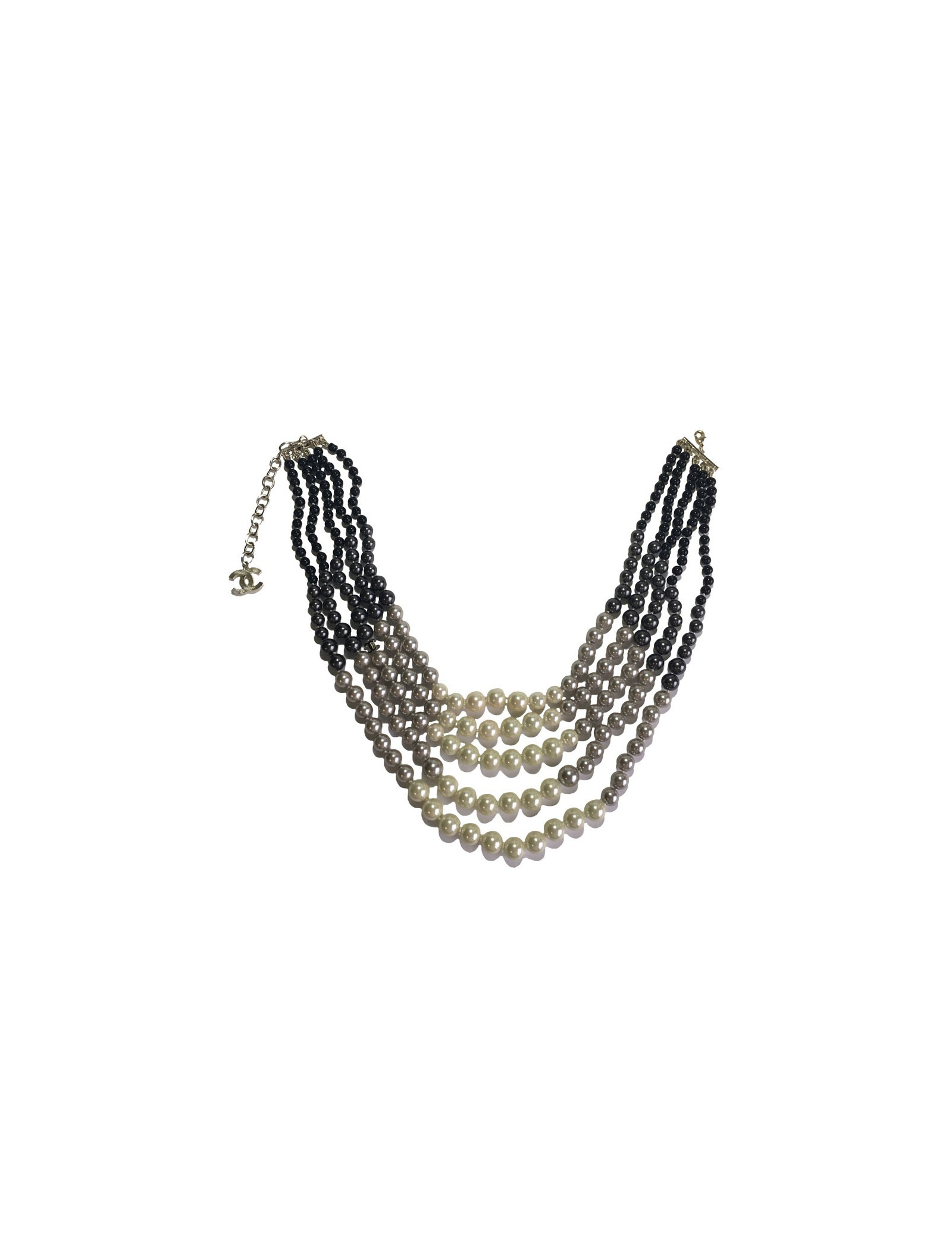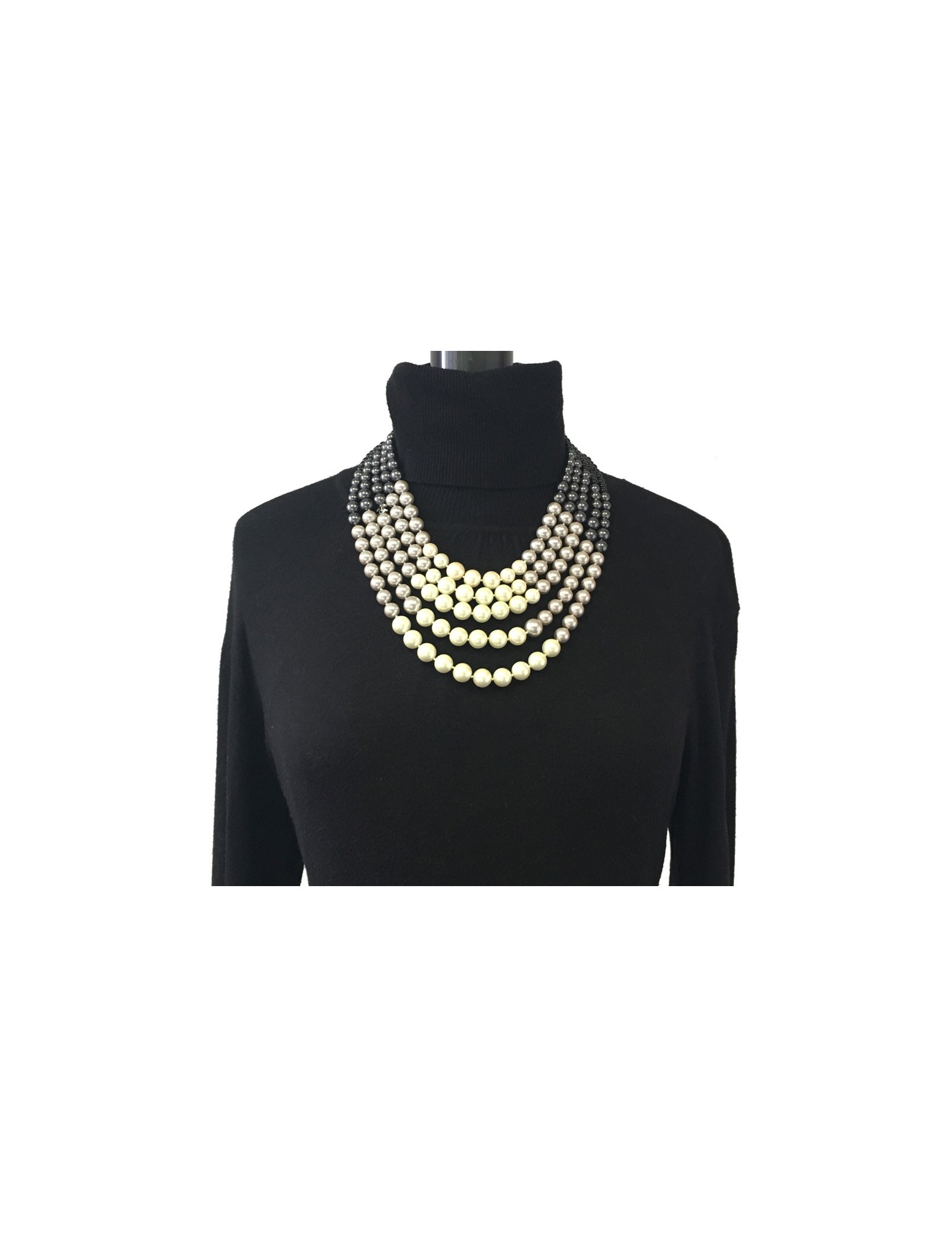 Sumptuous Chanel necklace 5 rows of beads of 4 colors: beige, gray, anthracite and black. A beautiful golden metal gilded gold finishes this necklace. Hologram of the brand on the clasp. Never worn