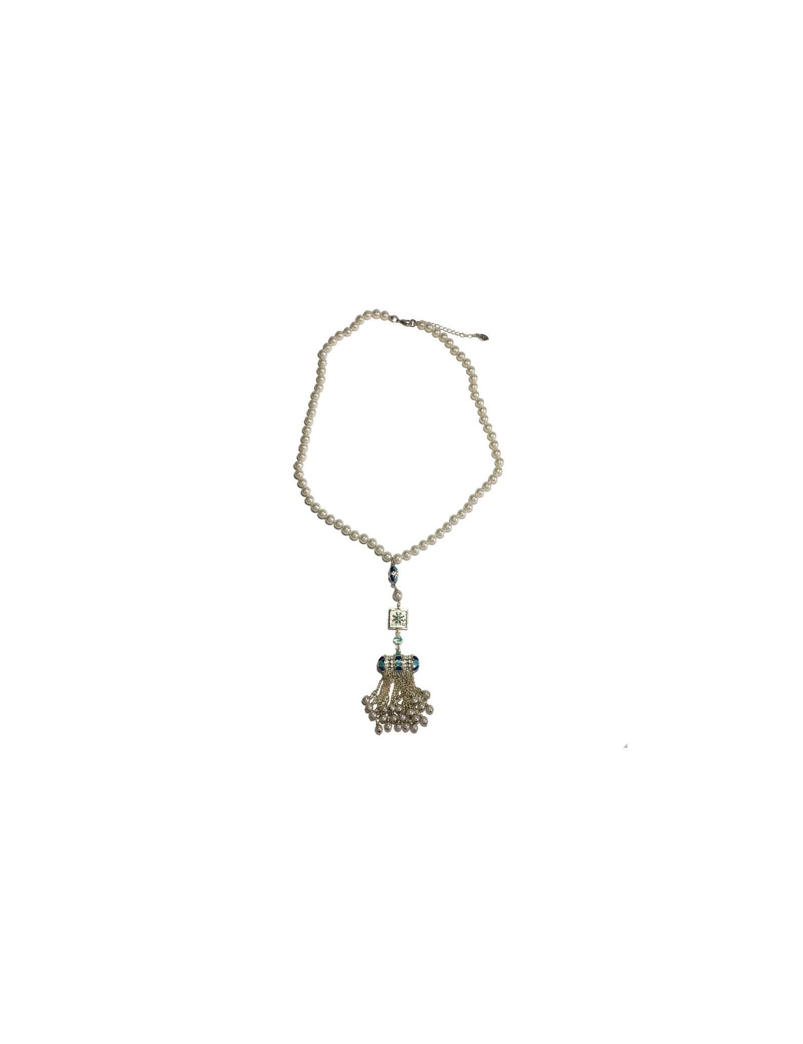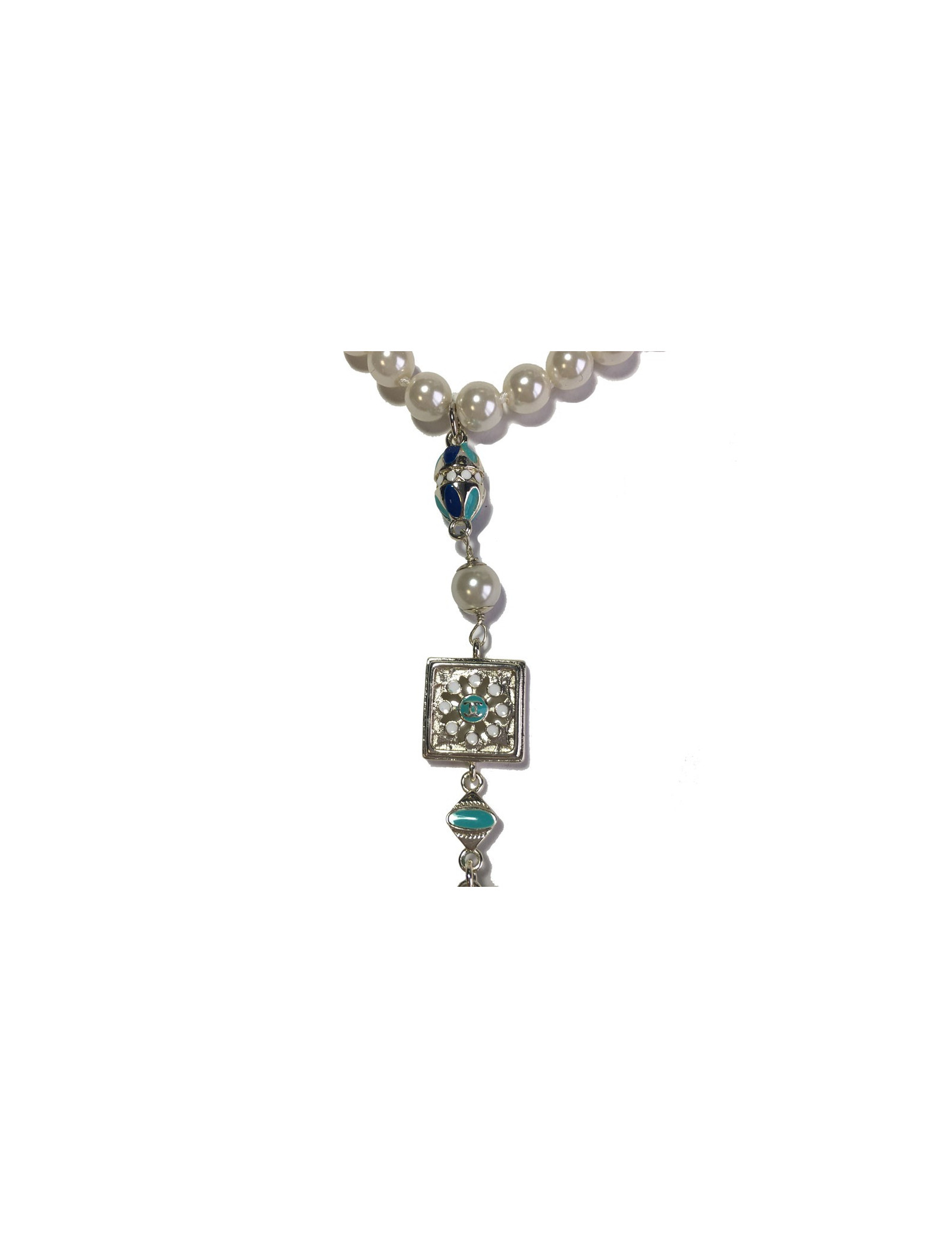 Magnifique collier collection des Métiers d'Art "Paris-Dubaï" en perles nacrées, pendentif en métal argenté, résine de couleur blanche, bleu clair et bleu foncé, petites chaînes avec perles nacrées.