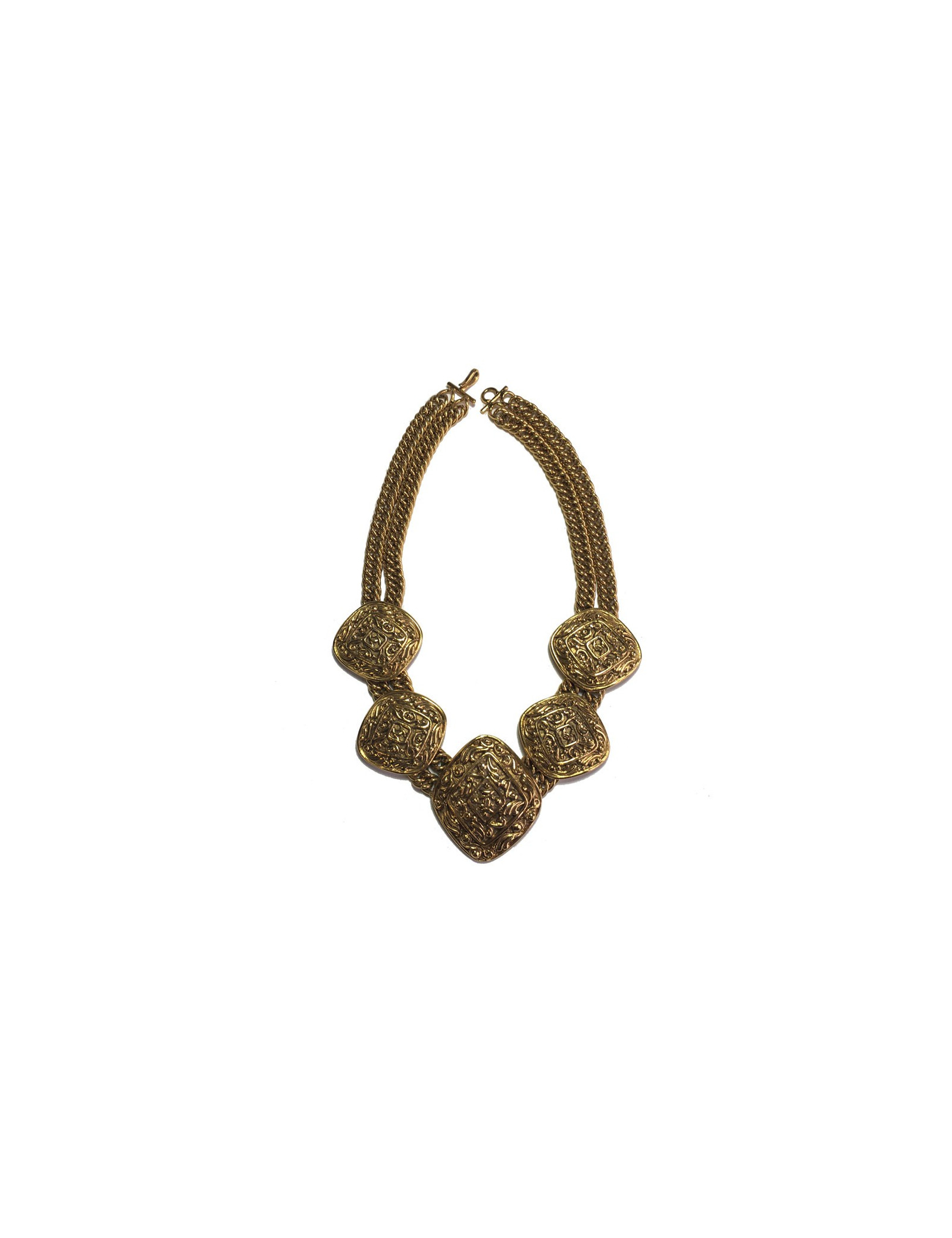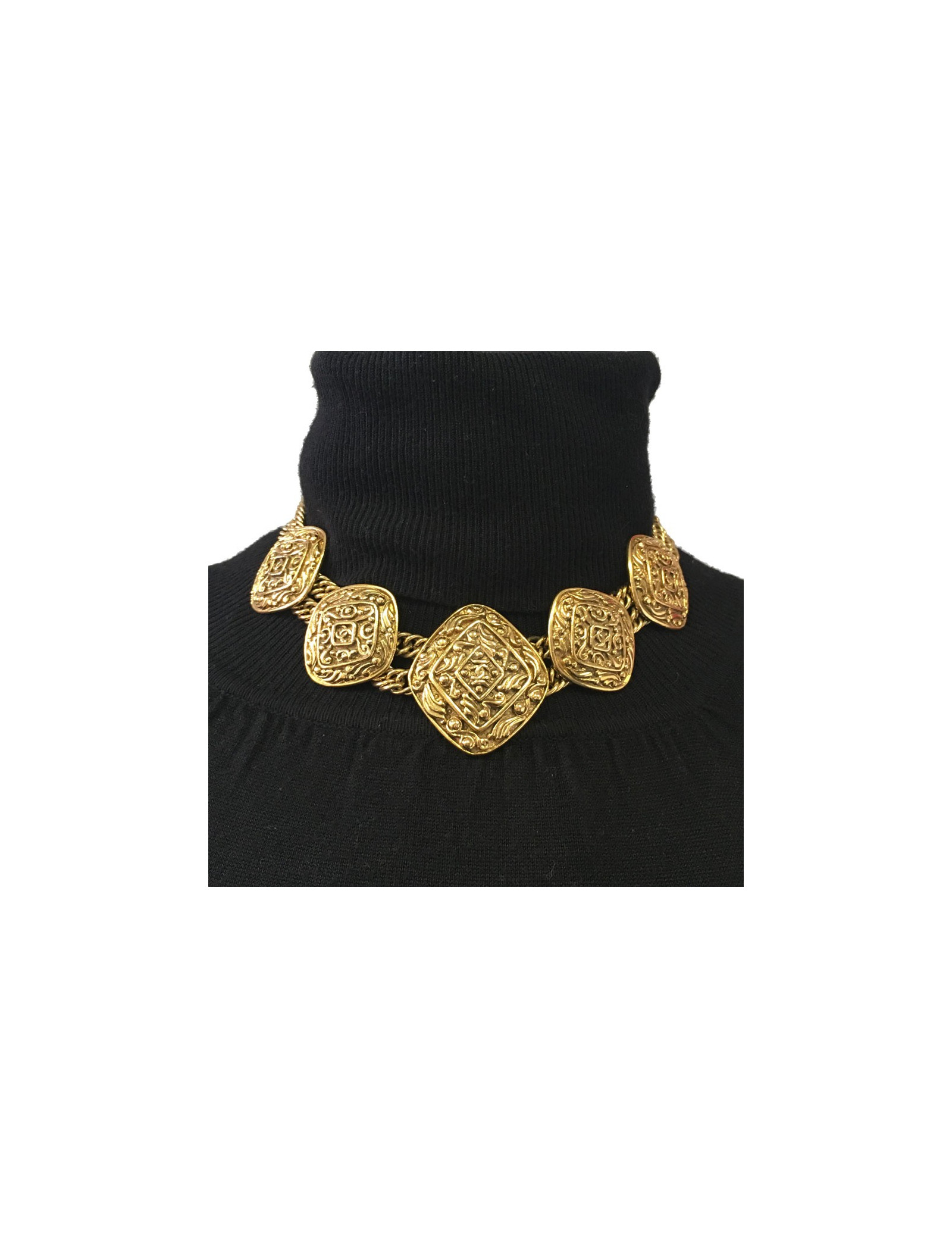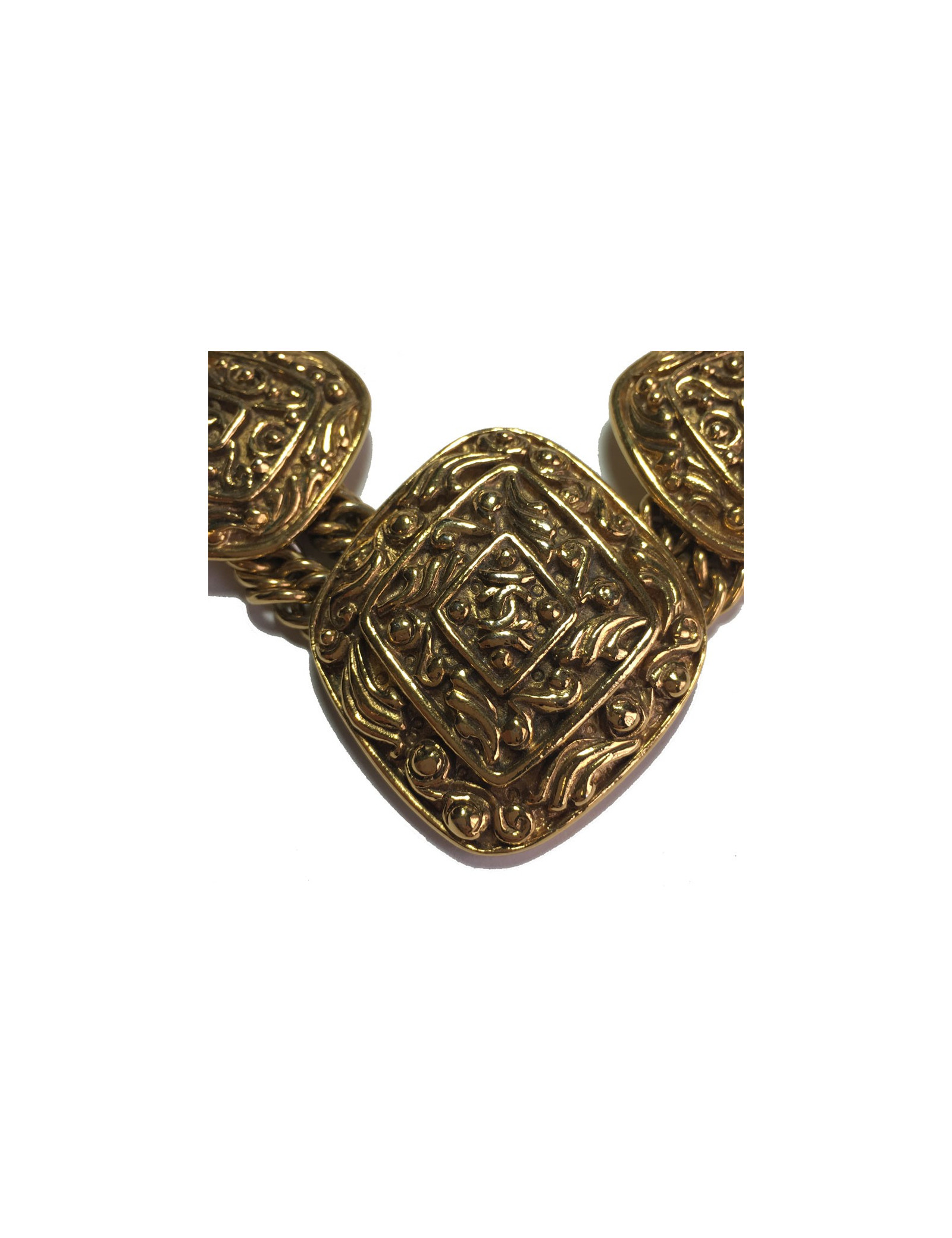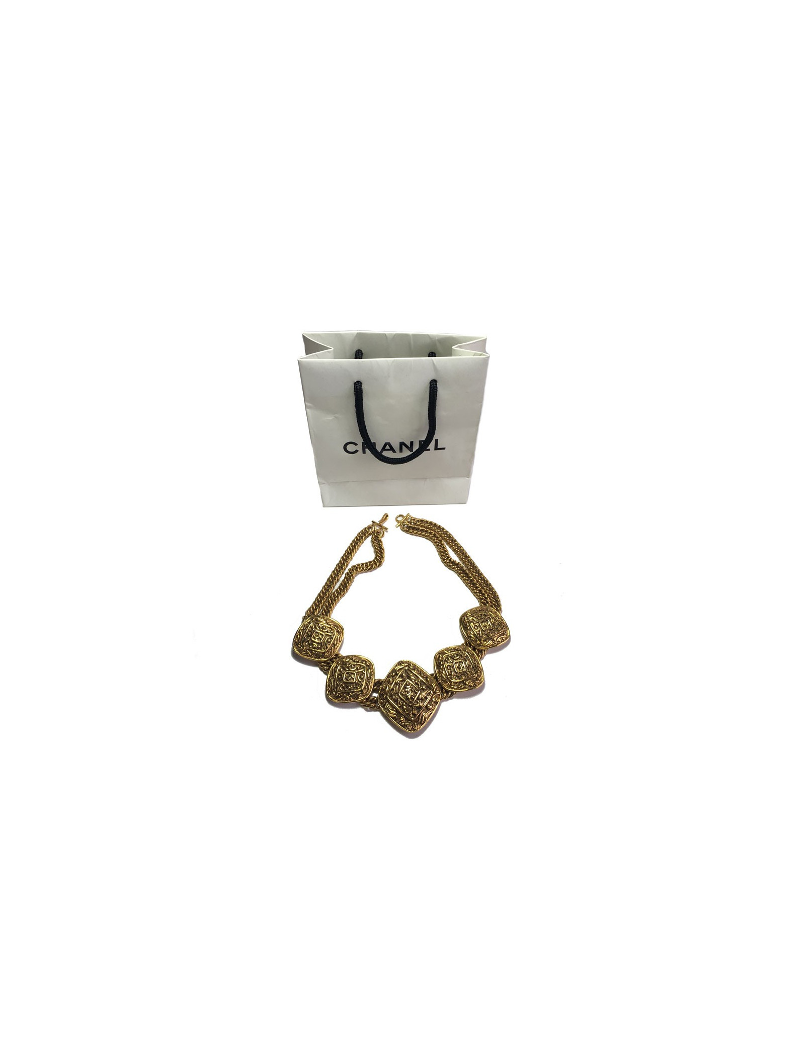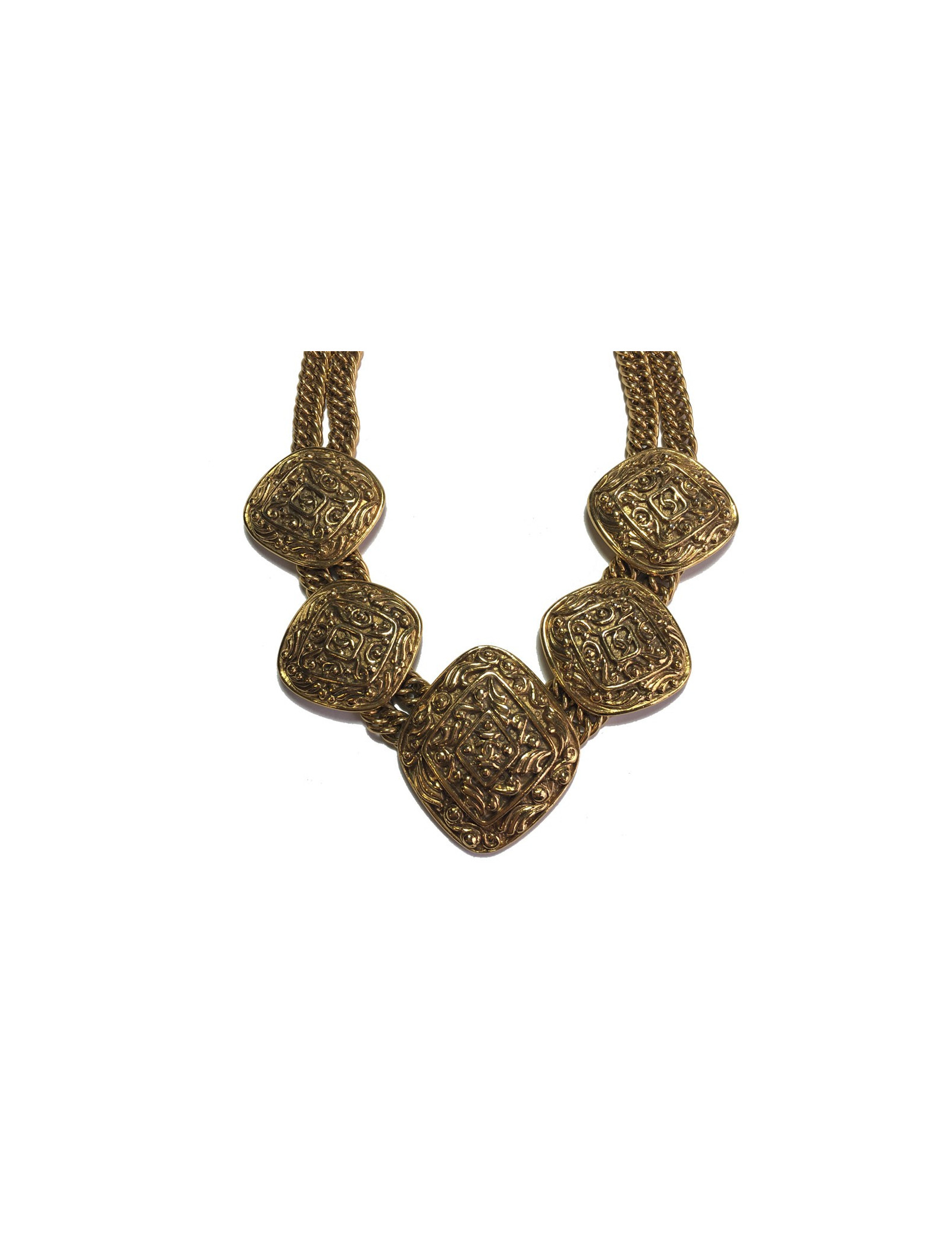Collier Chanel couture en métal doré. Double chaîne en maille et fermoir crochet. 5 médailles, forme losange, structurées avec un CC au centre.