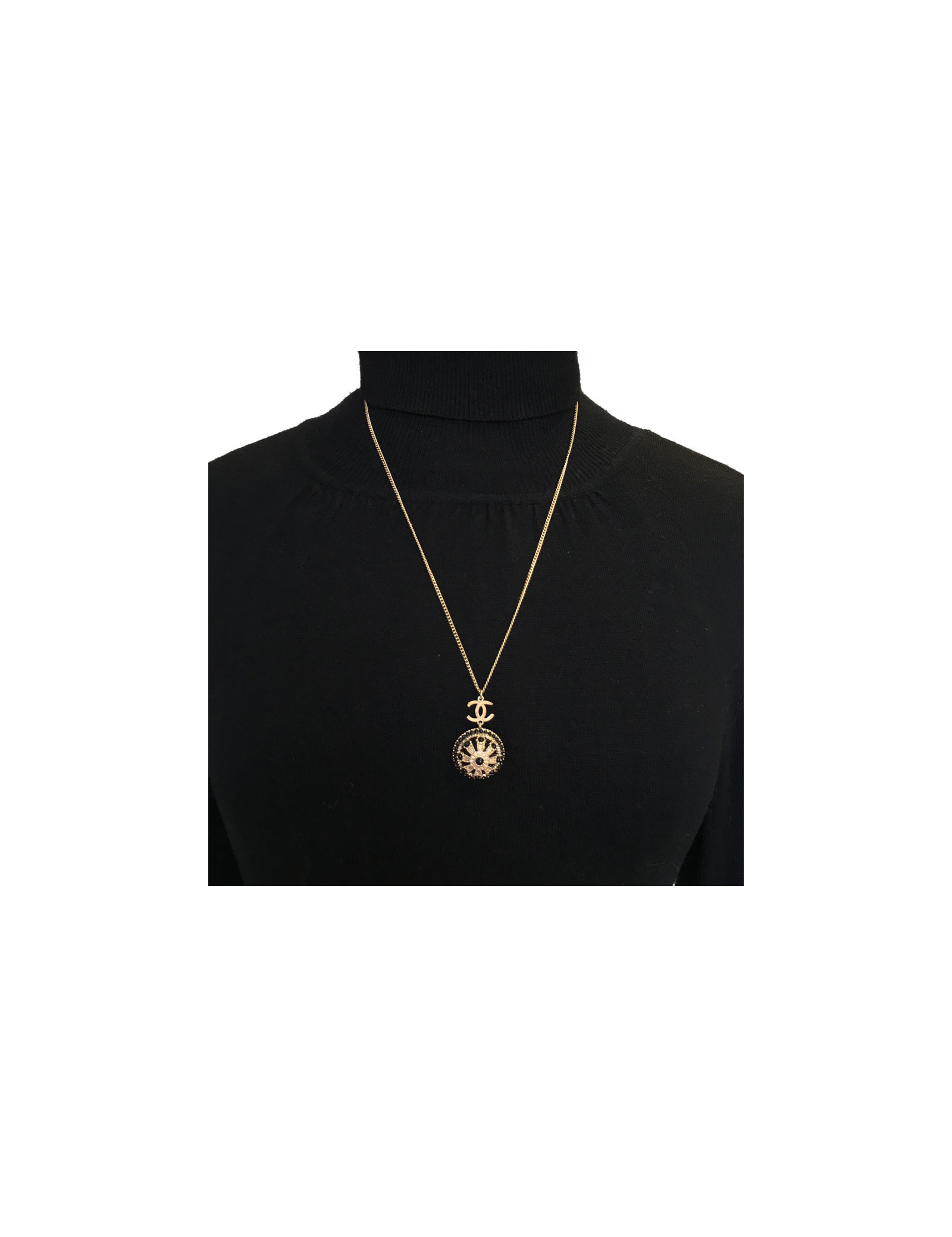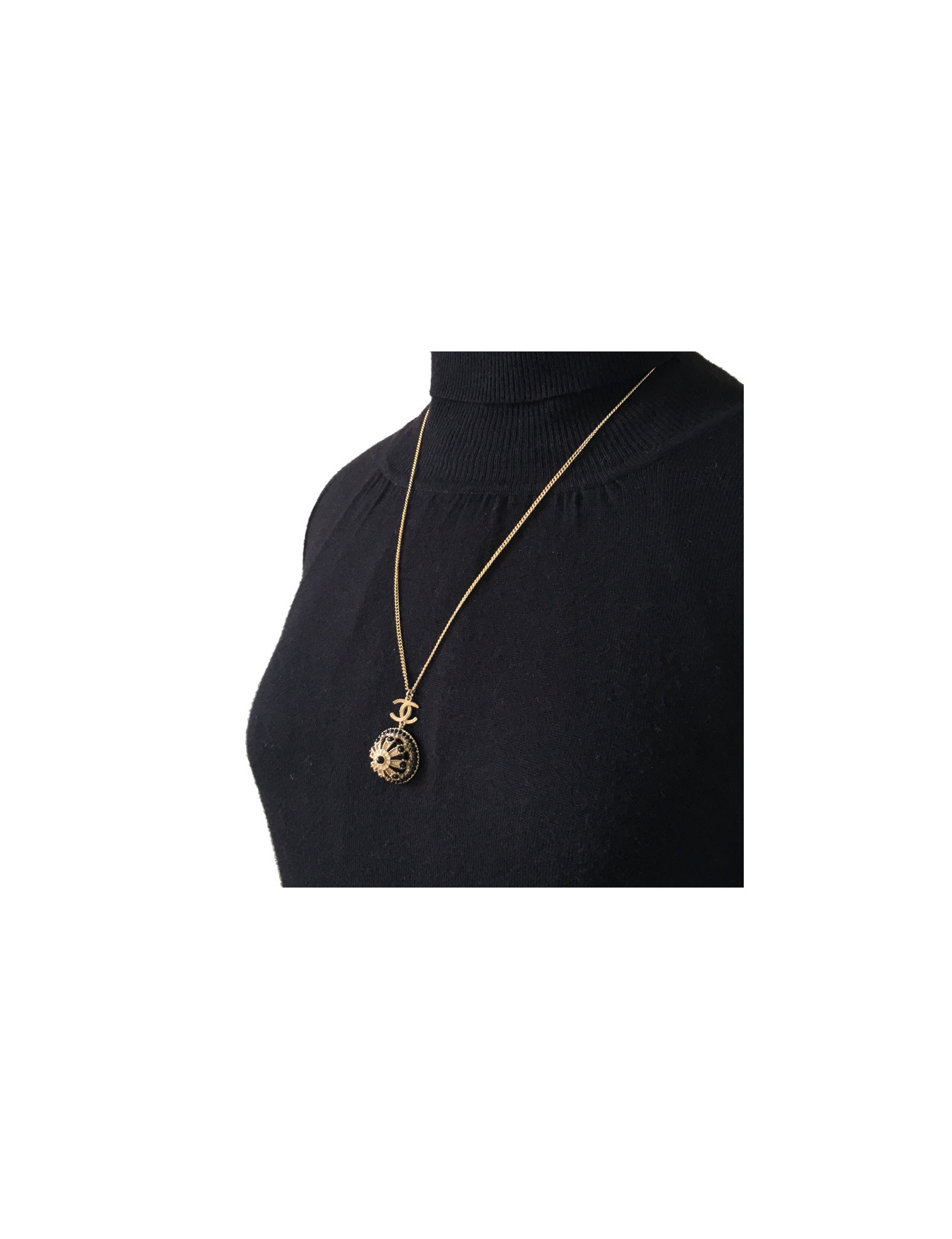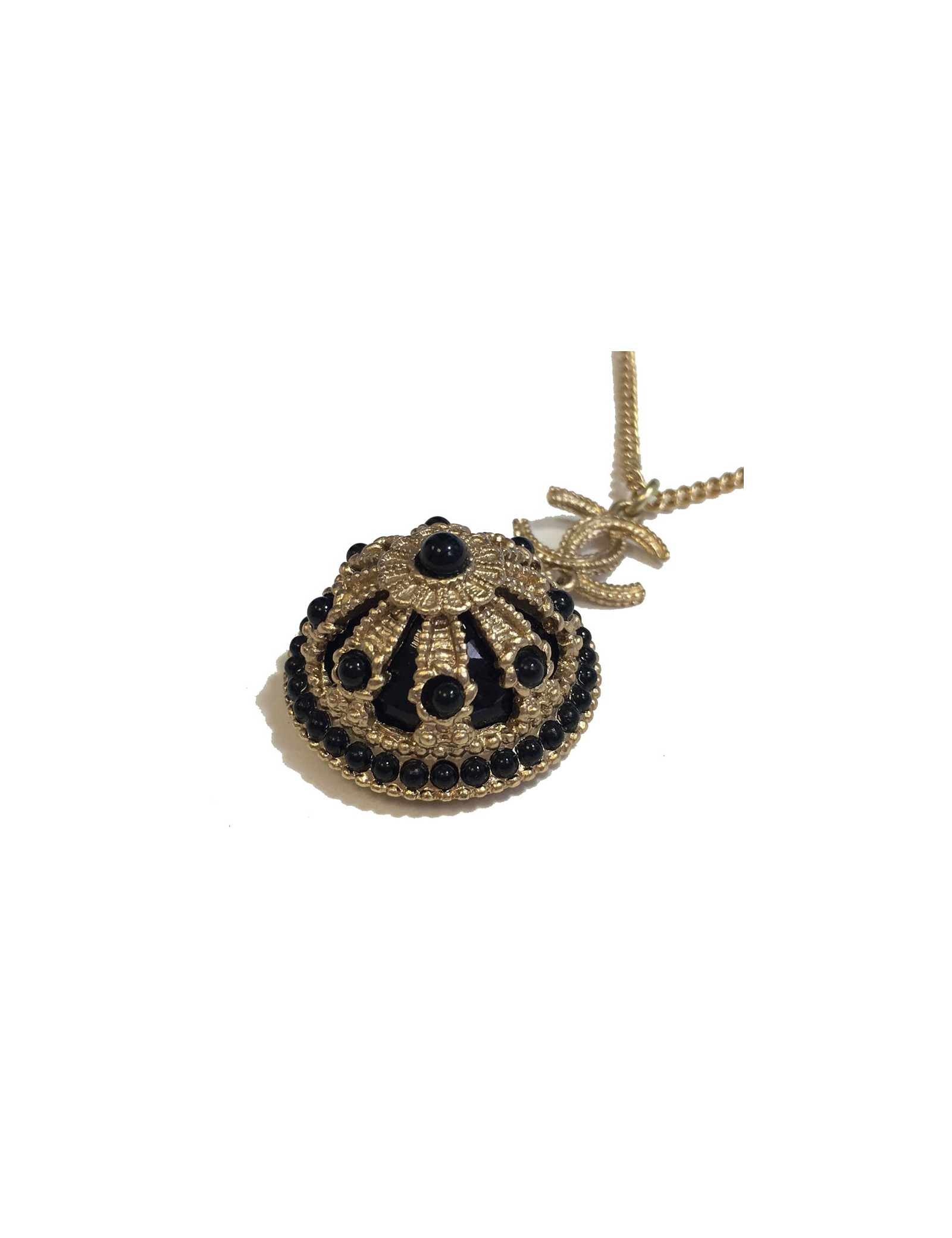 Très beau collier Chanel, chaîne en métal doré, CC et pendentif rond noir et métal doré serti de petites perles noires.