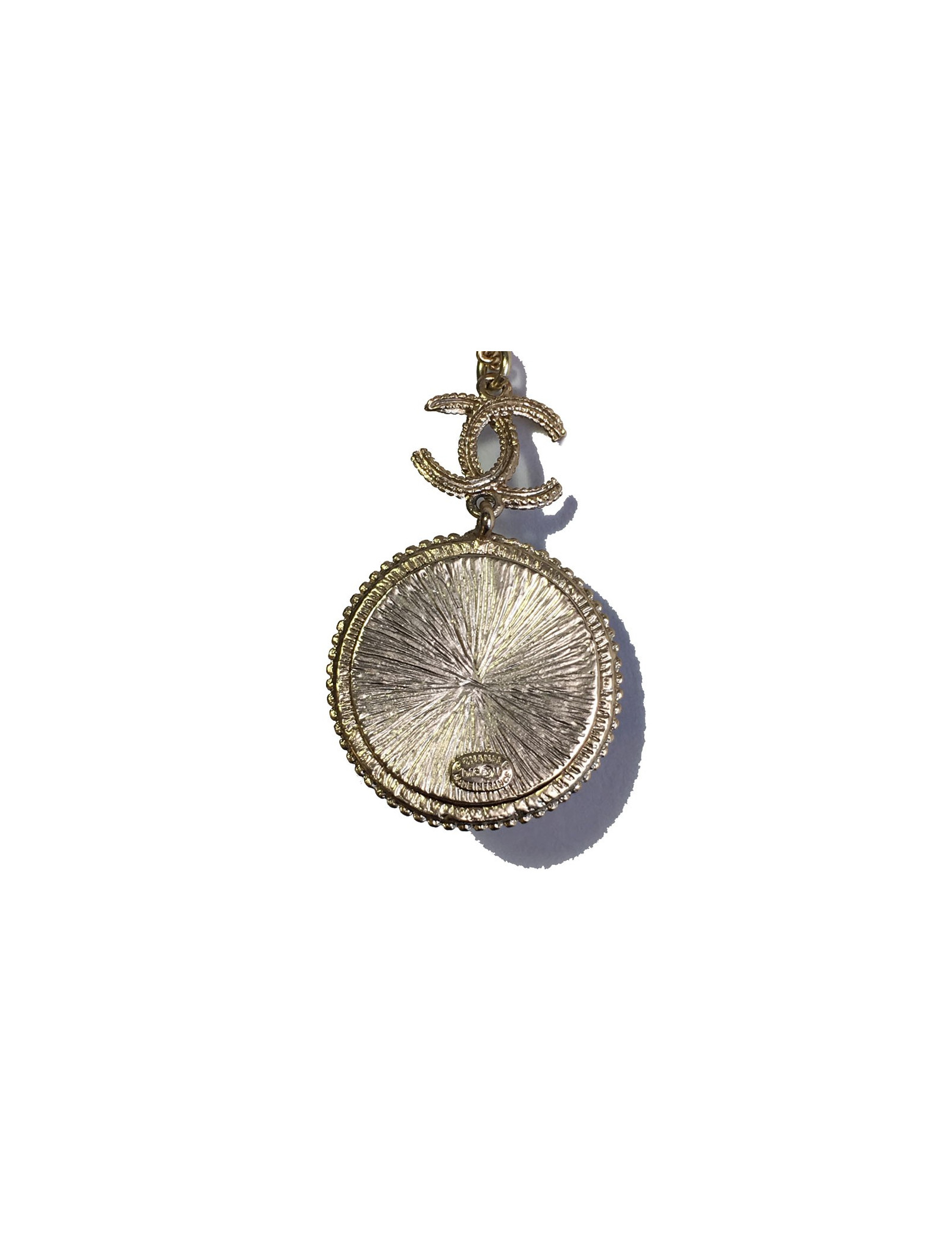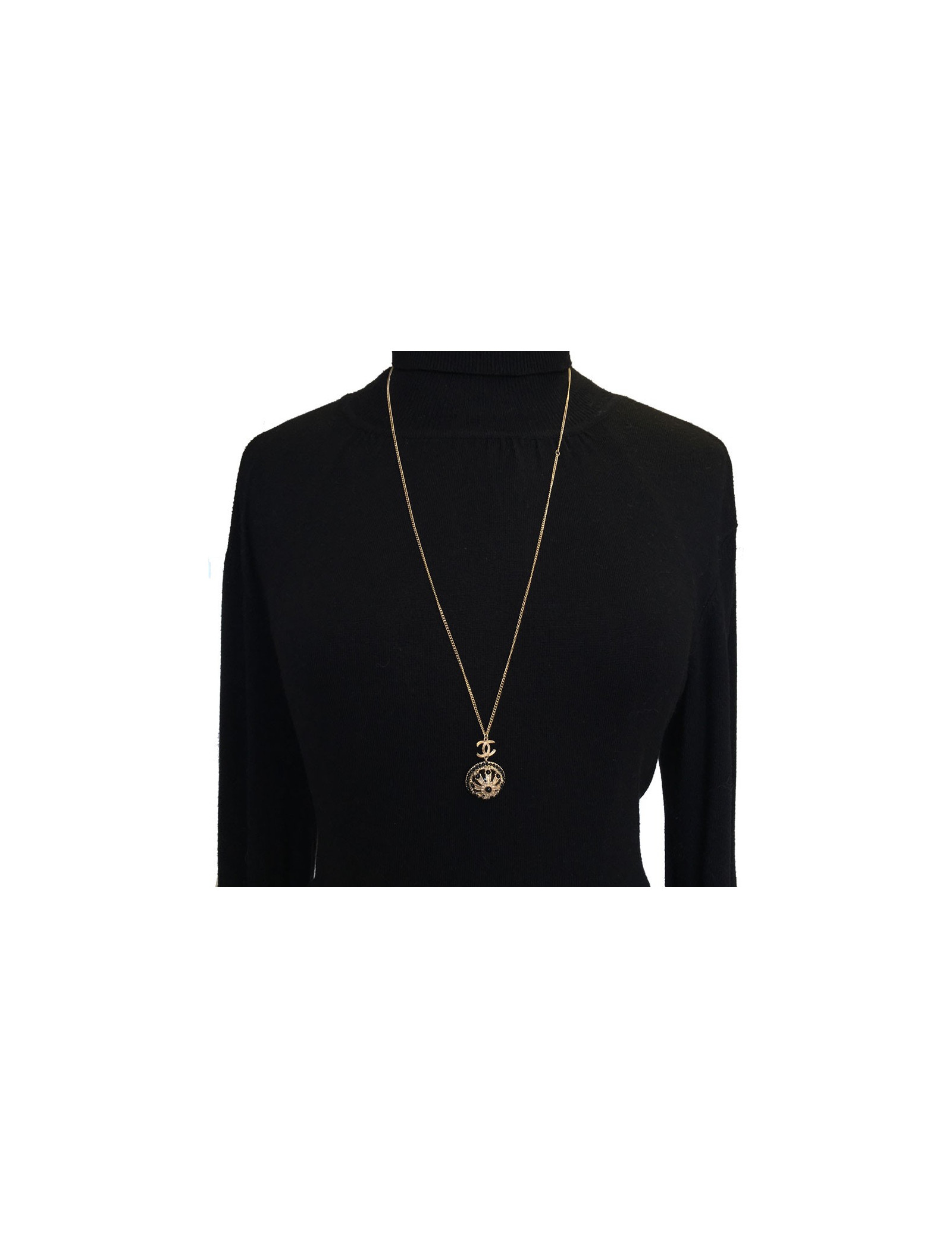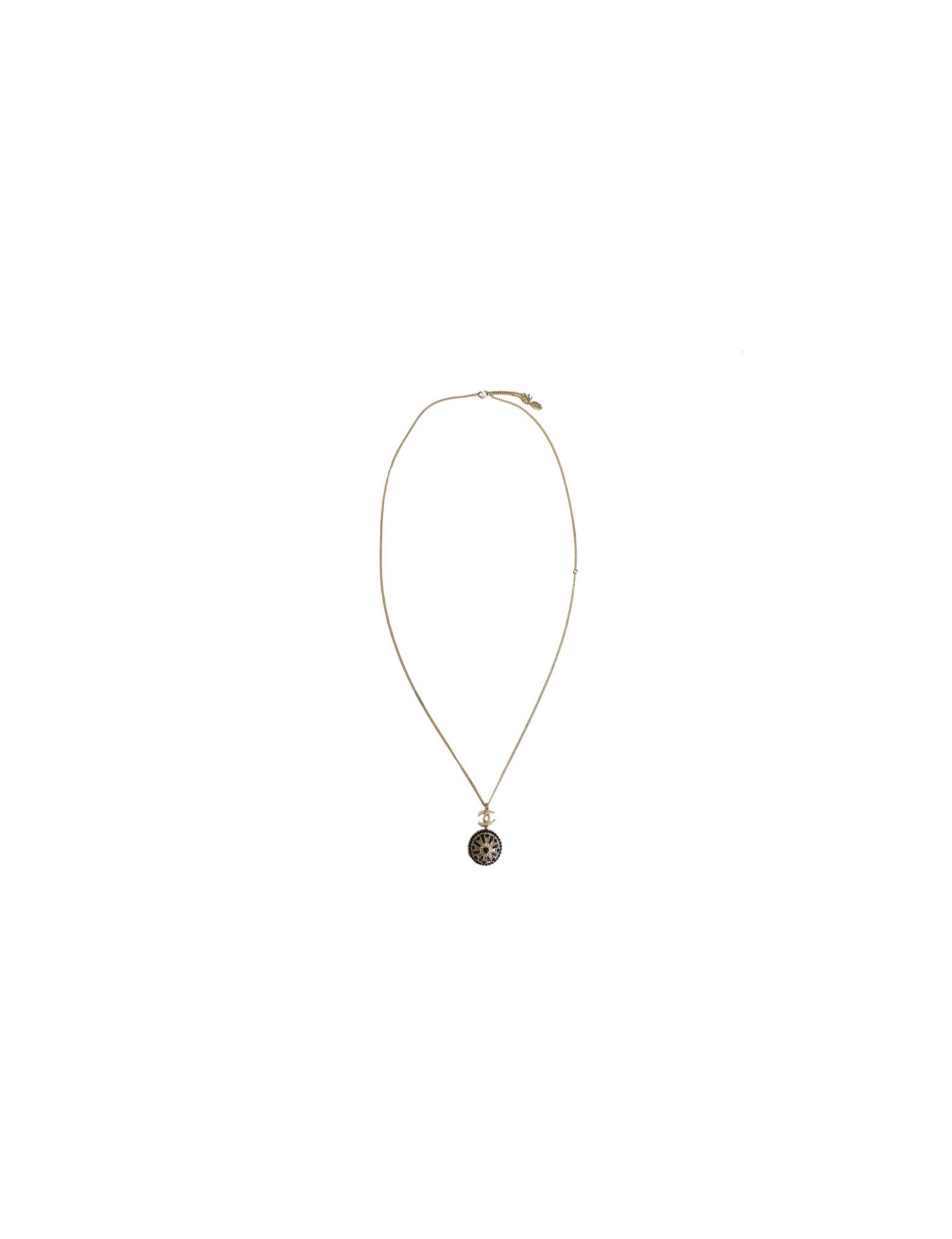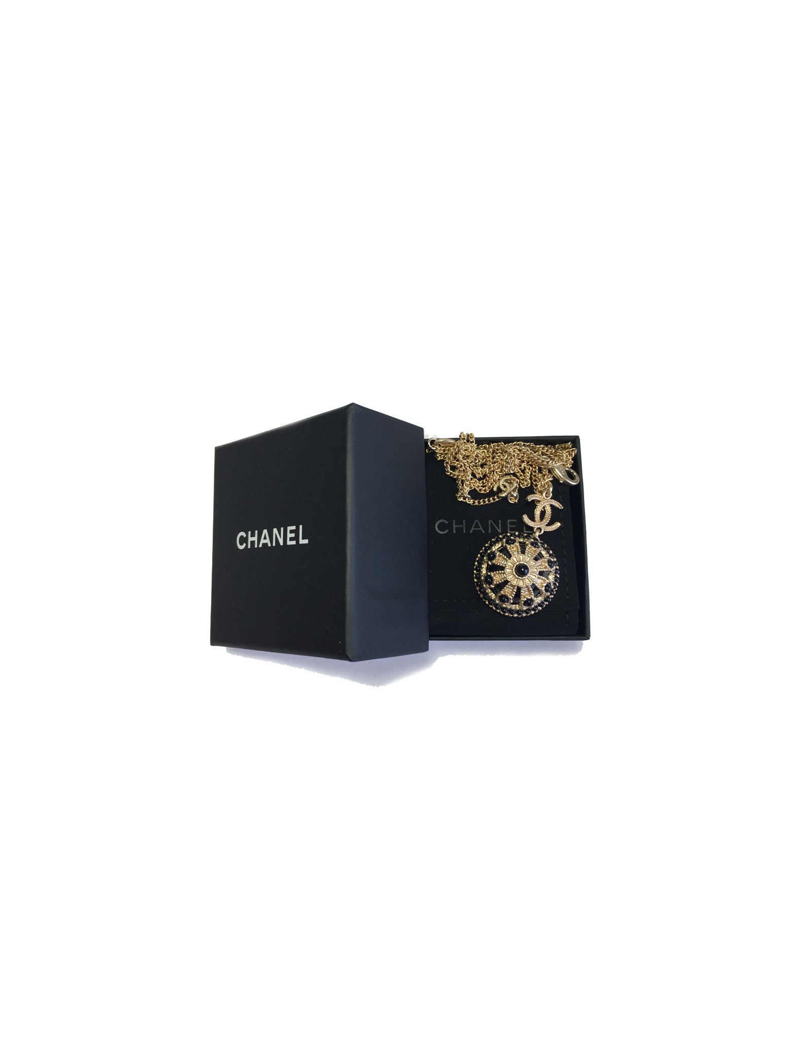 Très beau collier Chanel, chaîne en métal doré, CC et pendentif rond noir et métal doré serti de petites perles noires.