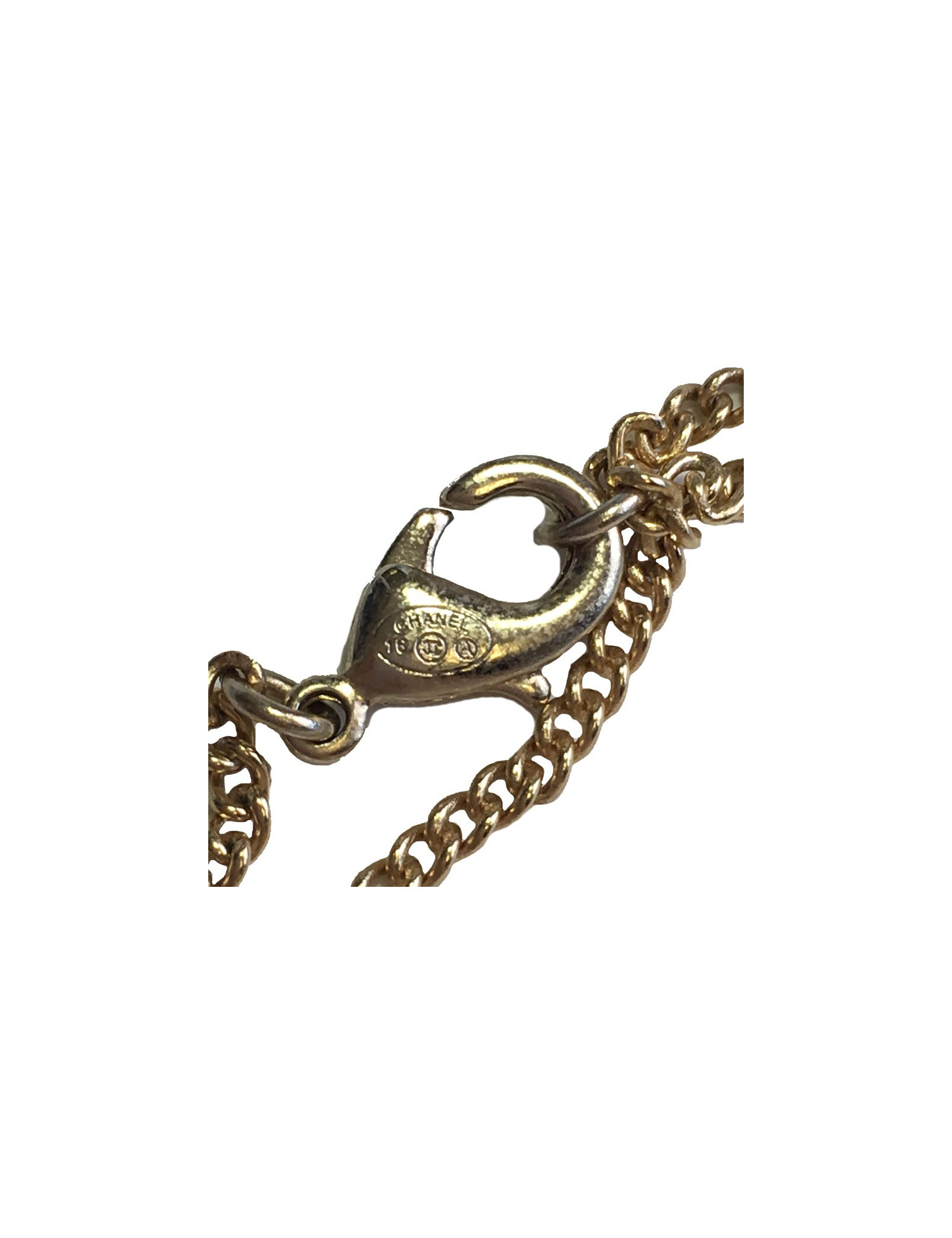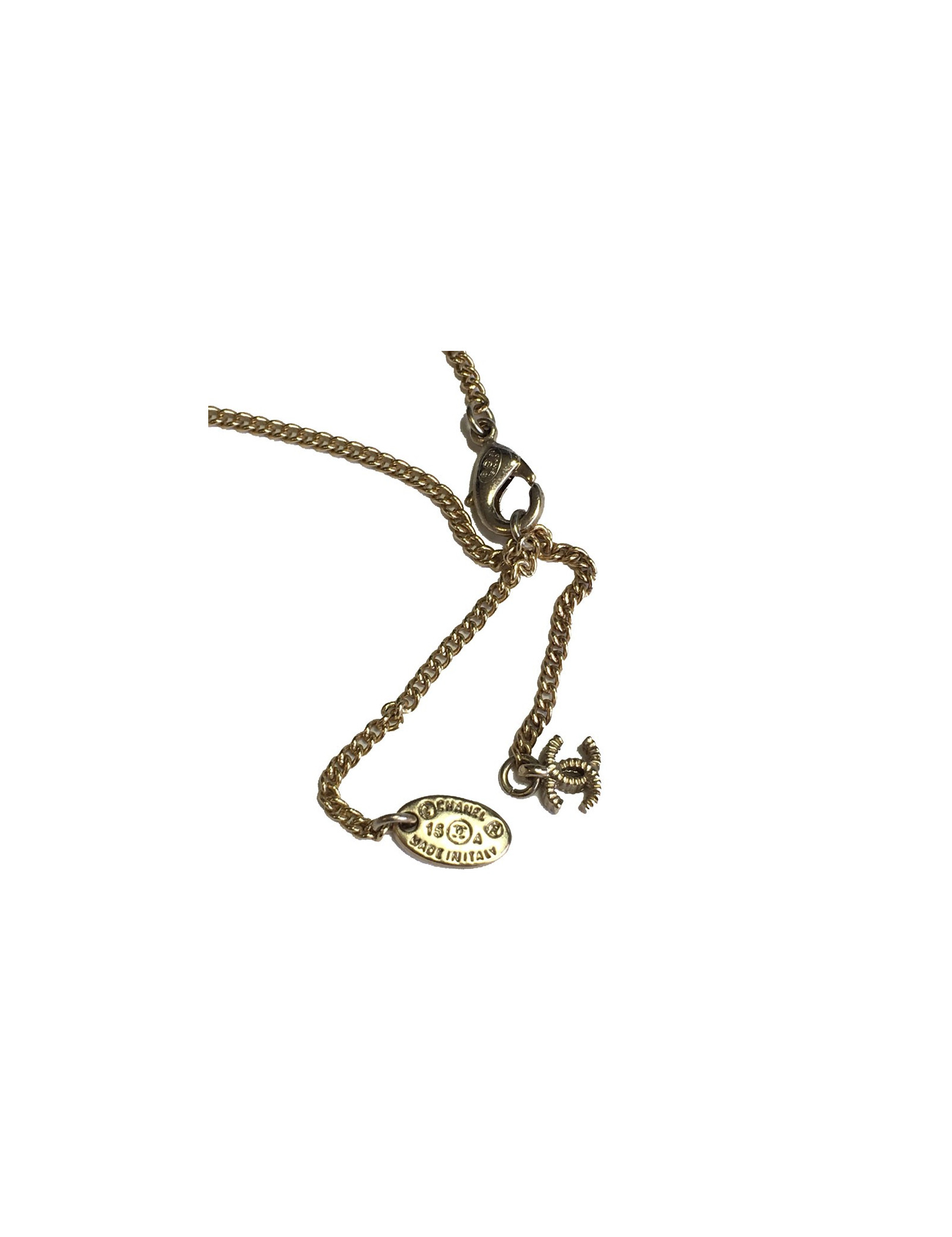 Collier CHANEL en métal doré, pendentif serti de petites perles noires