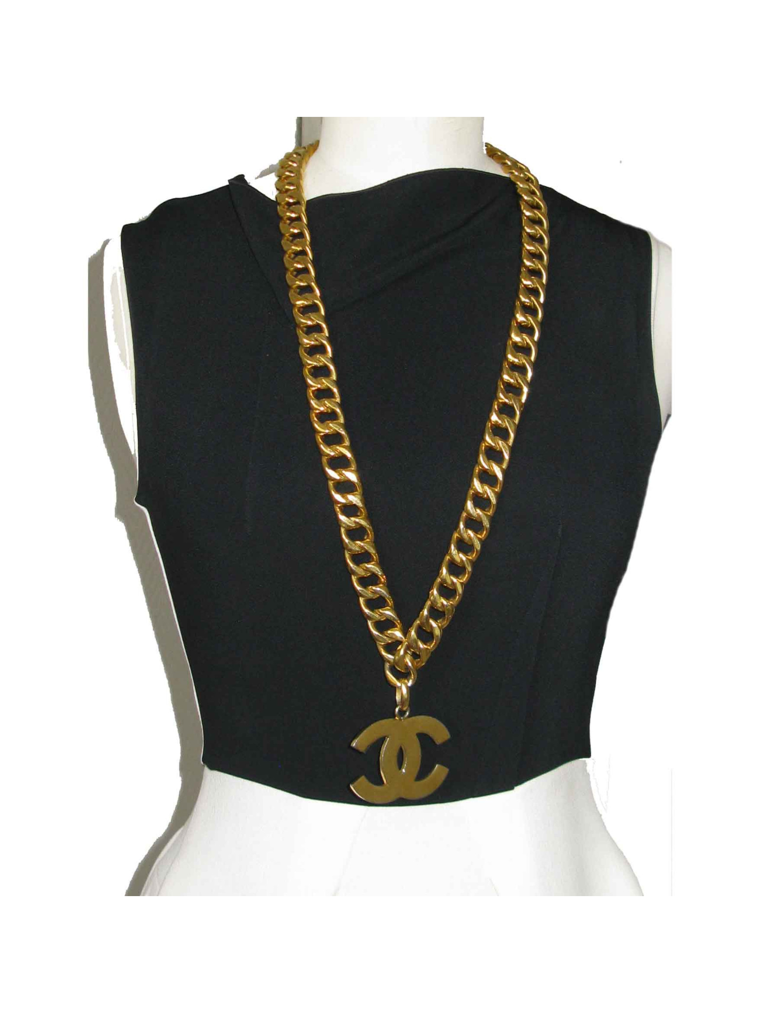 Ceinture sautoir Chanel chaîne maille en métal doré. Un grand CC est situé au milieu de la ceinture. Bijou vintage en très bon