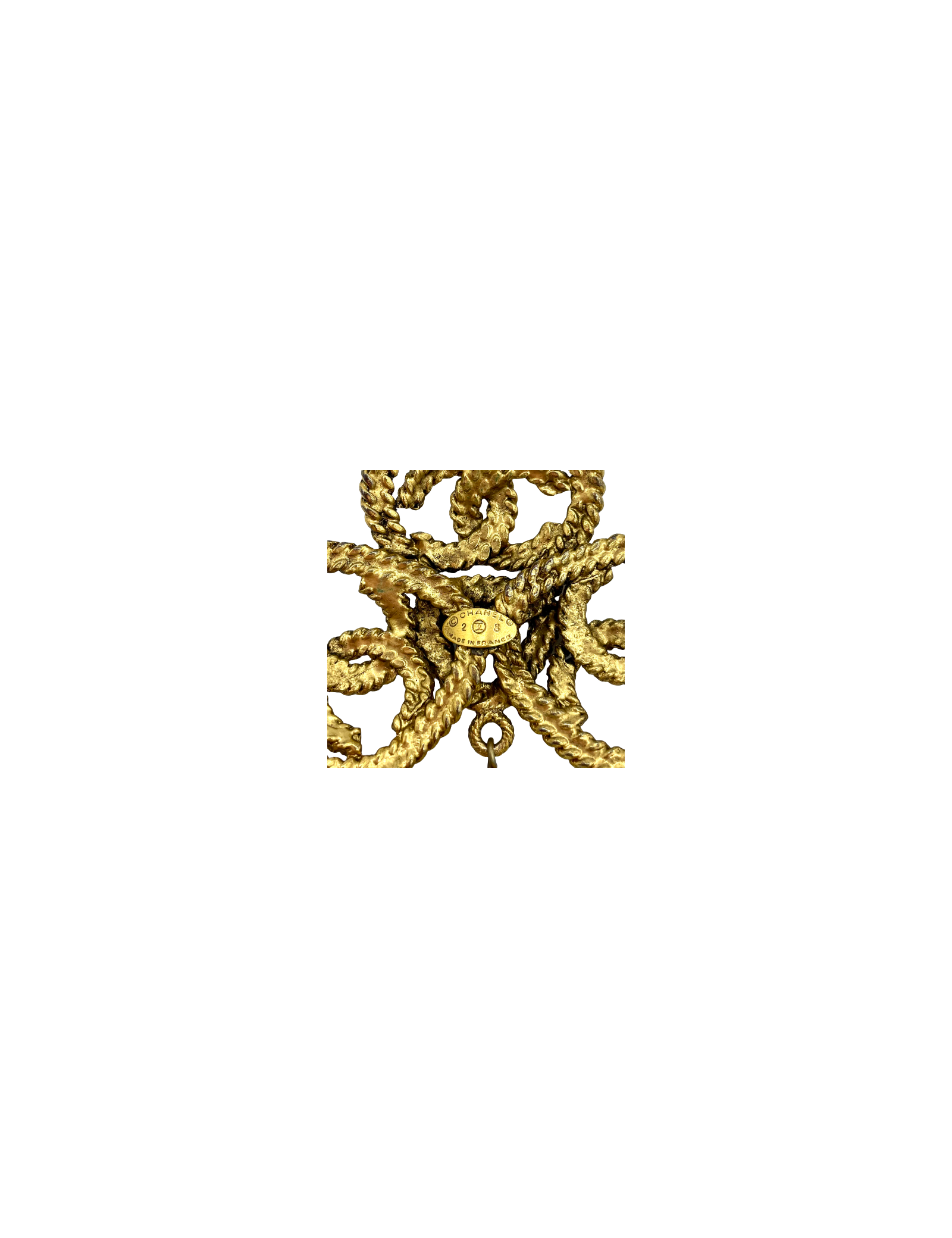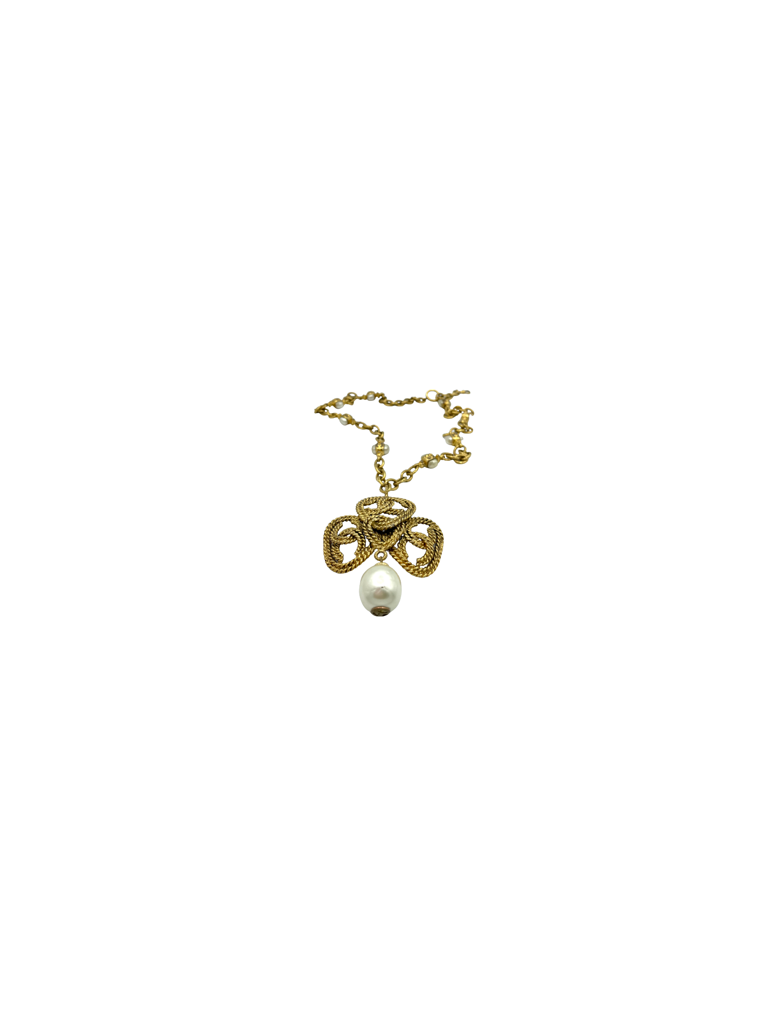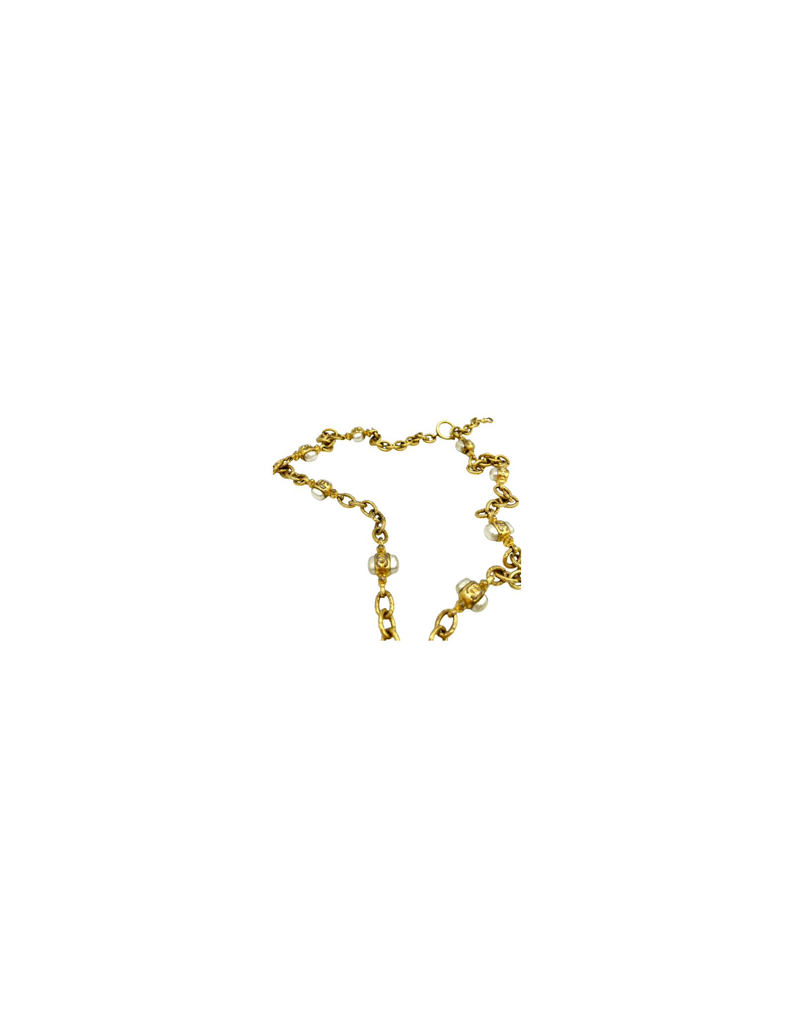 Magnificent Chanel necklace, made of gilt metal chain embellished with beads. The pendant is composed with 3 CC symbols made of chain and a drop shape pearl.