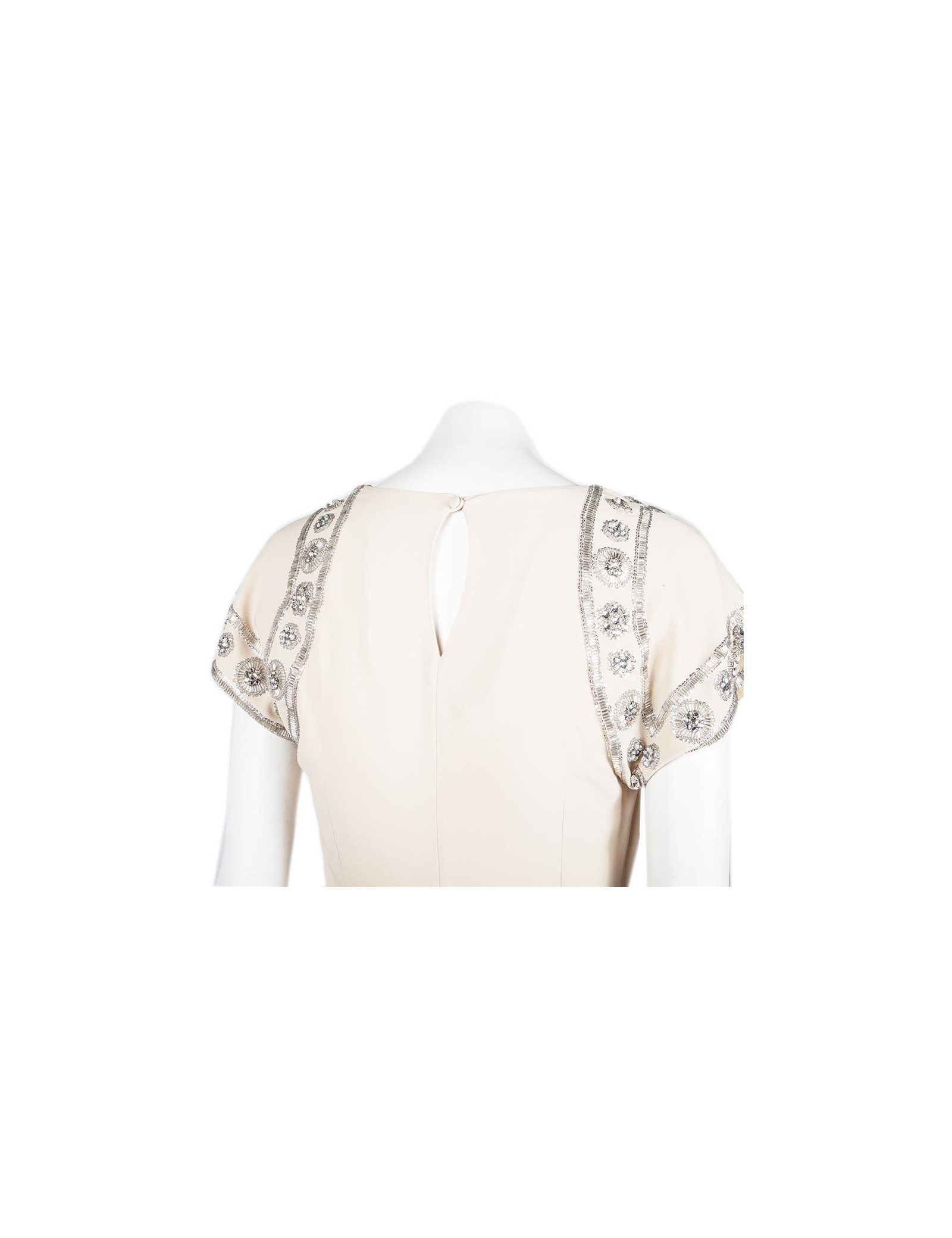 Christian Dior cocktail dress in beige silk crepe cut at an angle, embroidered with silver tubes and Swarovski crystals on the shoulders. Size 36FR