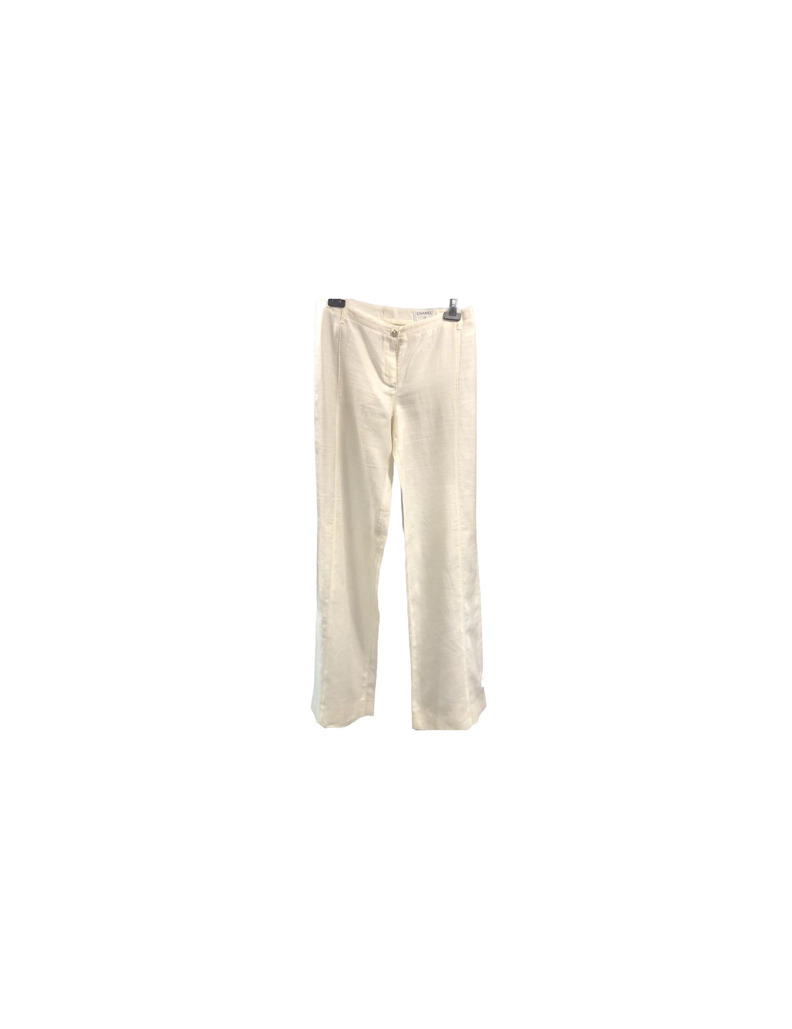 Last items in stock PANTS-SHORTS Black CHANEL T 42 pants veil of silk CHANEL 15980 450.00 € Chanel pants size 42, cotton black and covered with a veil of silk of the same color. There are two pockets on the front and the back of the pants. The Chanel symbol is represented on the left pocket by a sublime stone Ruby surrounded by golden metal, closed by closed zip and snap button. It is in very good condition. Size: Width size: 36 cm, crotch: 26... Add to cart