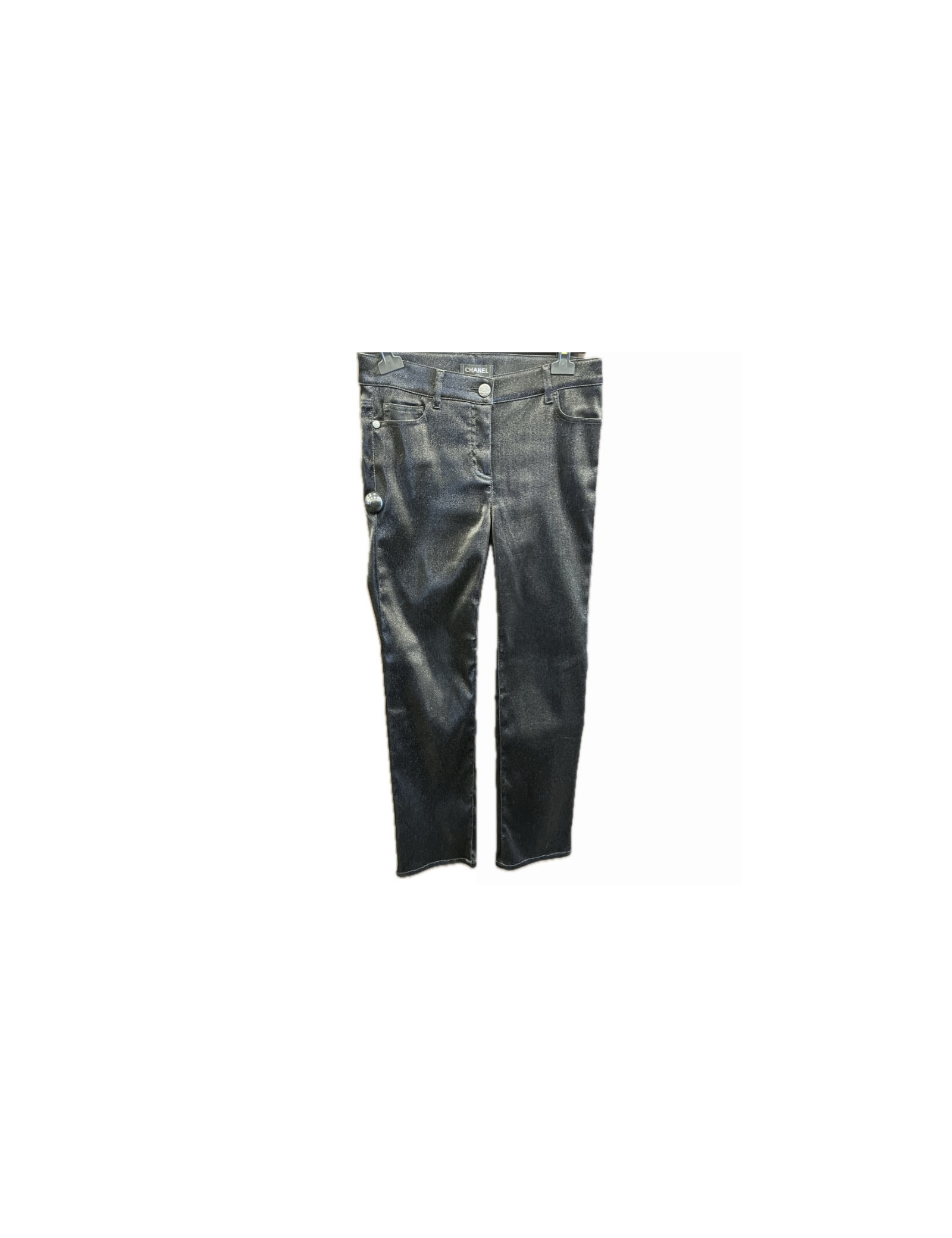 Last items in stock PANTS-SHORTS Black CHANEL T 42 pants veil of silk CHANEL 15980 450.00 € Chanel pants size 42, cotton black and covered with a veil of silk of the same color. There are two pockets on the front and the back of the pants. The Chanel symbol is represented on the left pocket by a sublime stone Ruby surrounded by golden metal, closed by closed zip and snap button. It is in very good condition. Size: Width size: 36 cm, crotch: 26... Add to cart