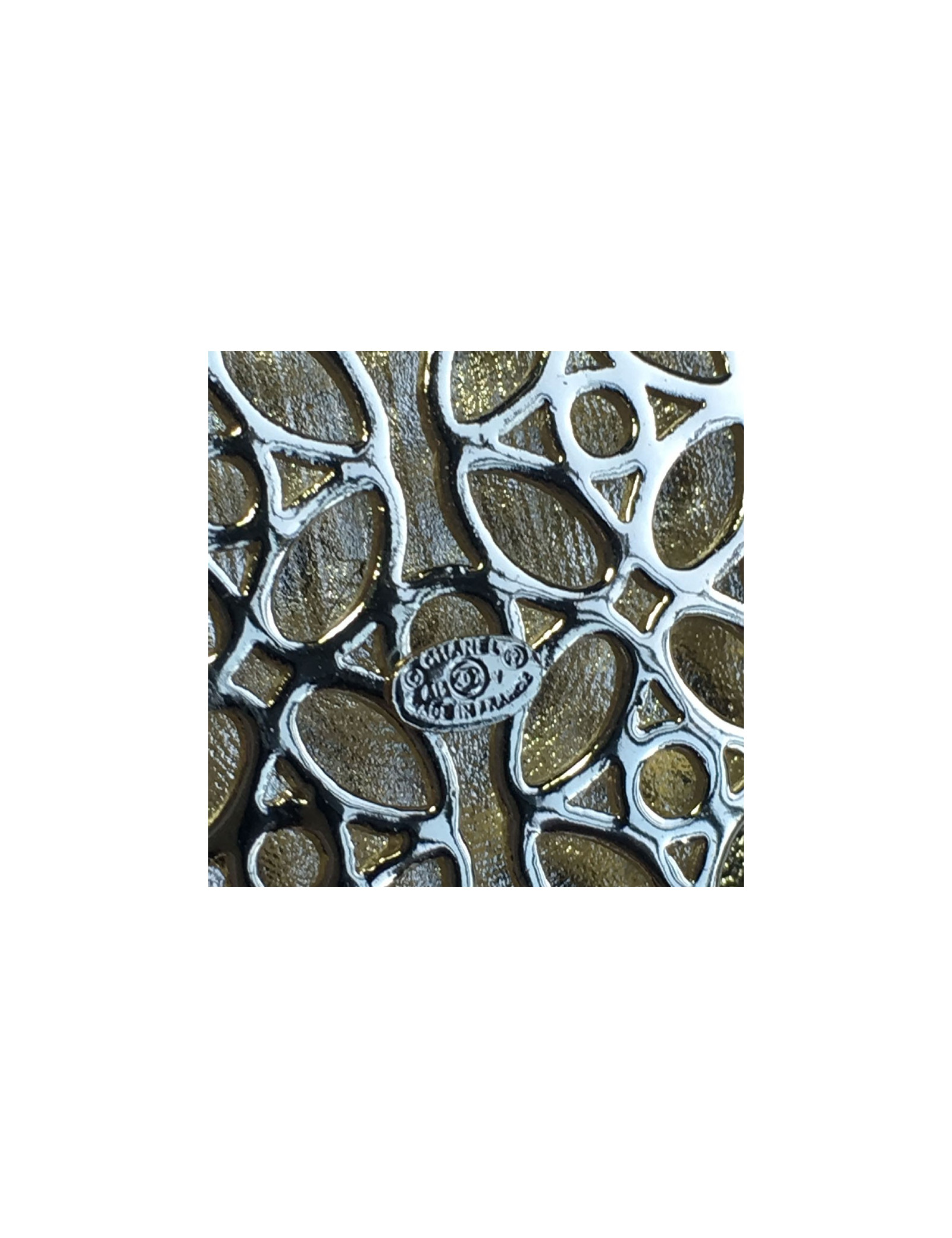 Chanel escutcheon brooch in pale gold metal, set with small pearl beads and colored resin: beige, black, blue and dark green.