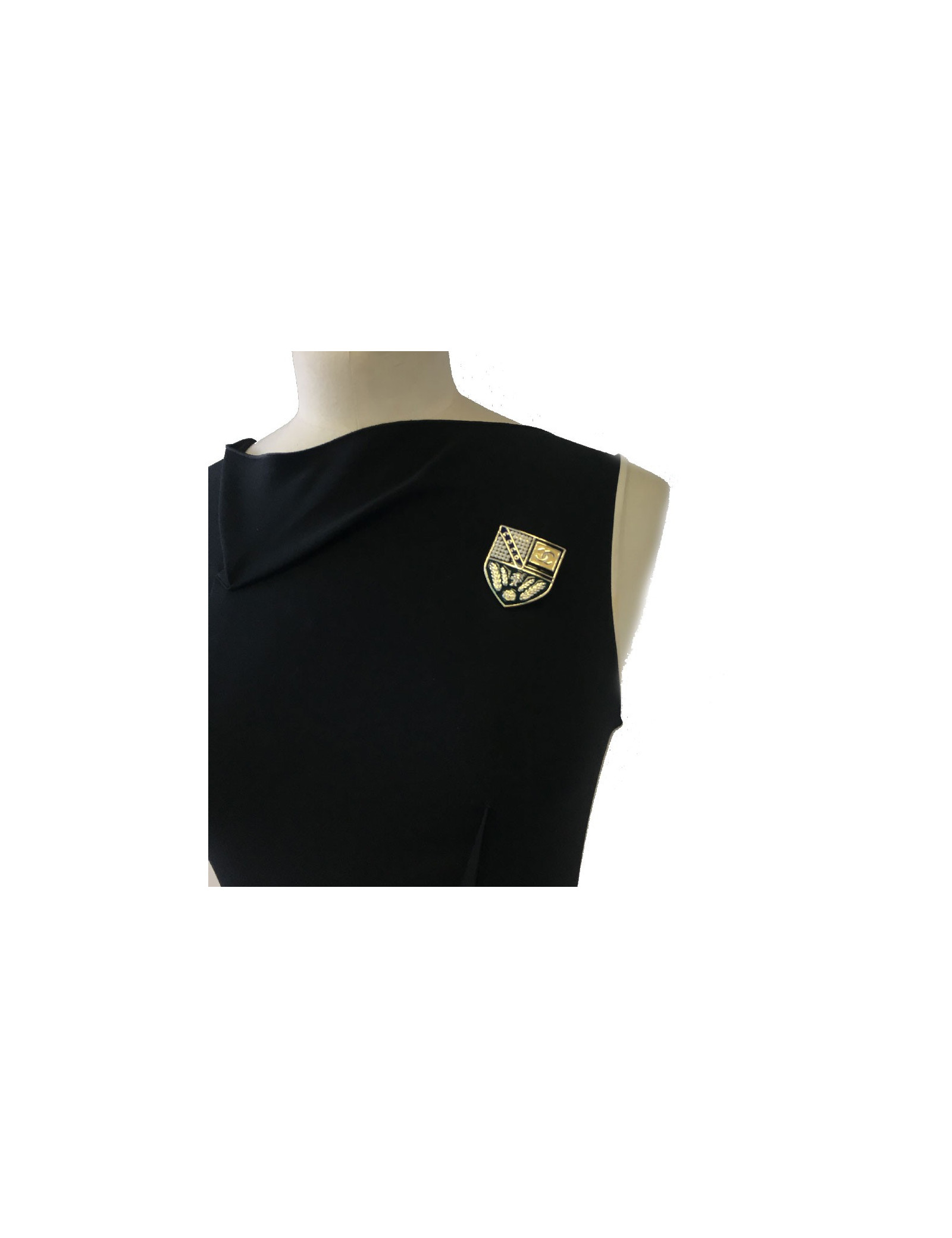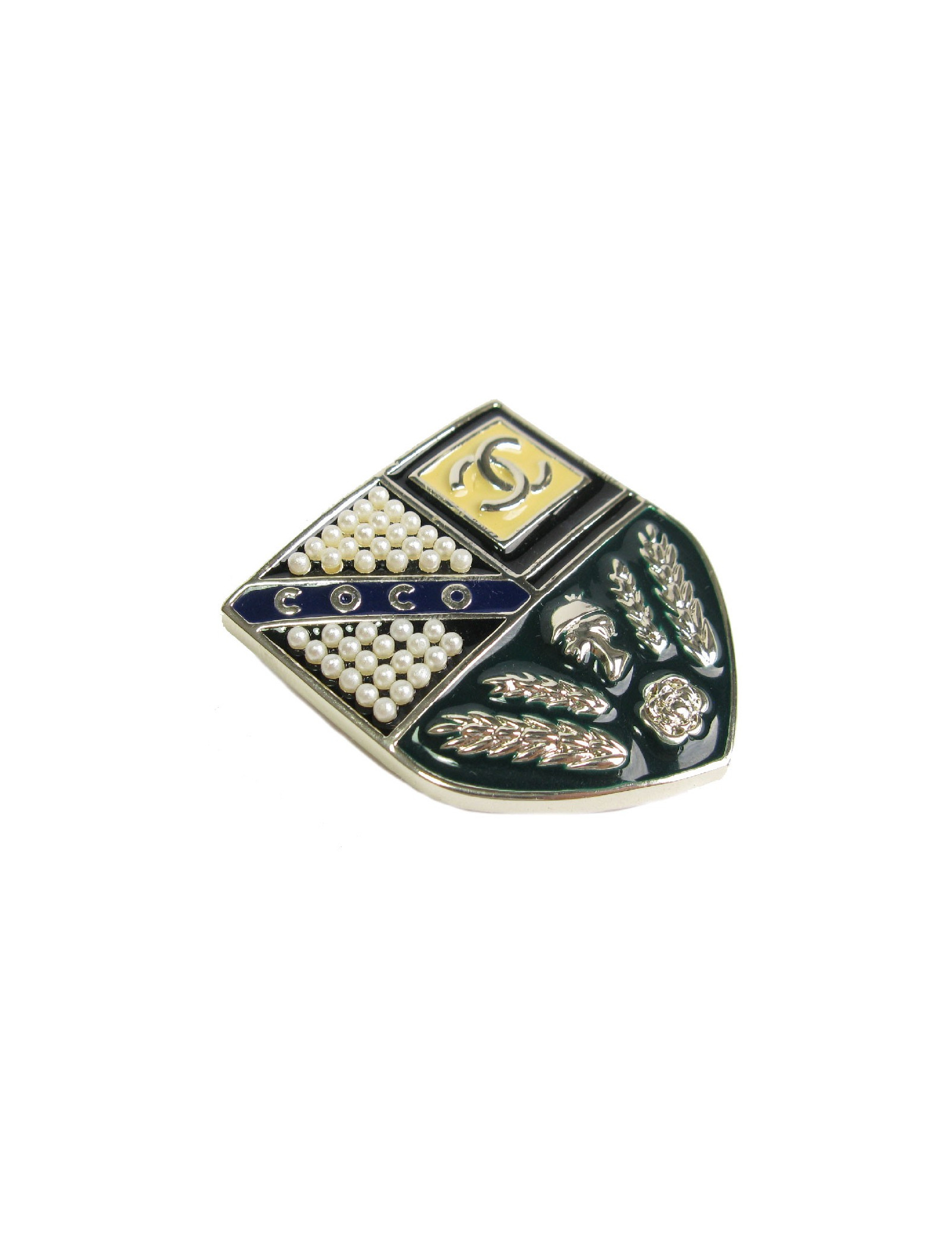 CHANEL escutcheon brooch in pale gilded metal, pearls and colored resin