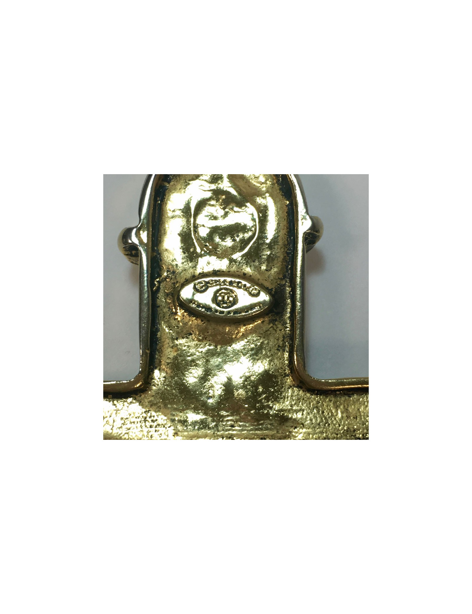 Sold PINS-BROOCHES YVES SAINT LAURENT YSL Vintage gilded brooch SAINT LAURENT 24384 230.00 € YVES SAINT LAURENT YSL Vintage gilded brooch Condition: very goodMade in FranceMaterials: metal, stonesColors: gold, purple, garnetMeasurements: 5.5x 4cmDetails: YSL Yves Saint Laurent brooch in gilded metal, set with garnet and violet fantasy stones. Delivered in a Valois Vintage Paris dustbag View