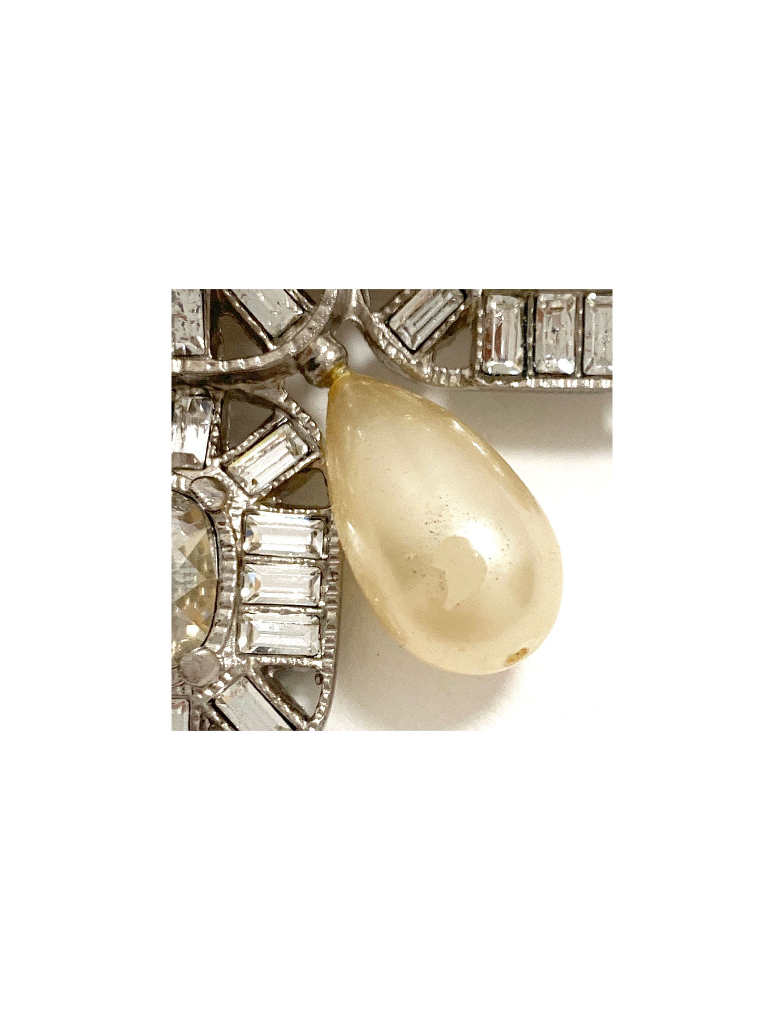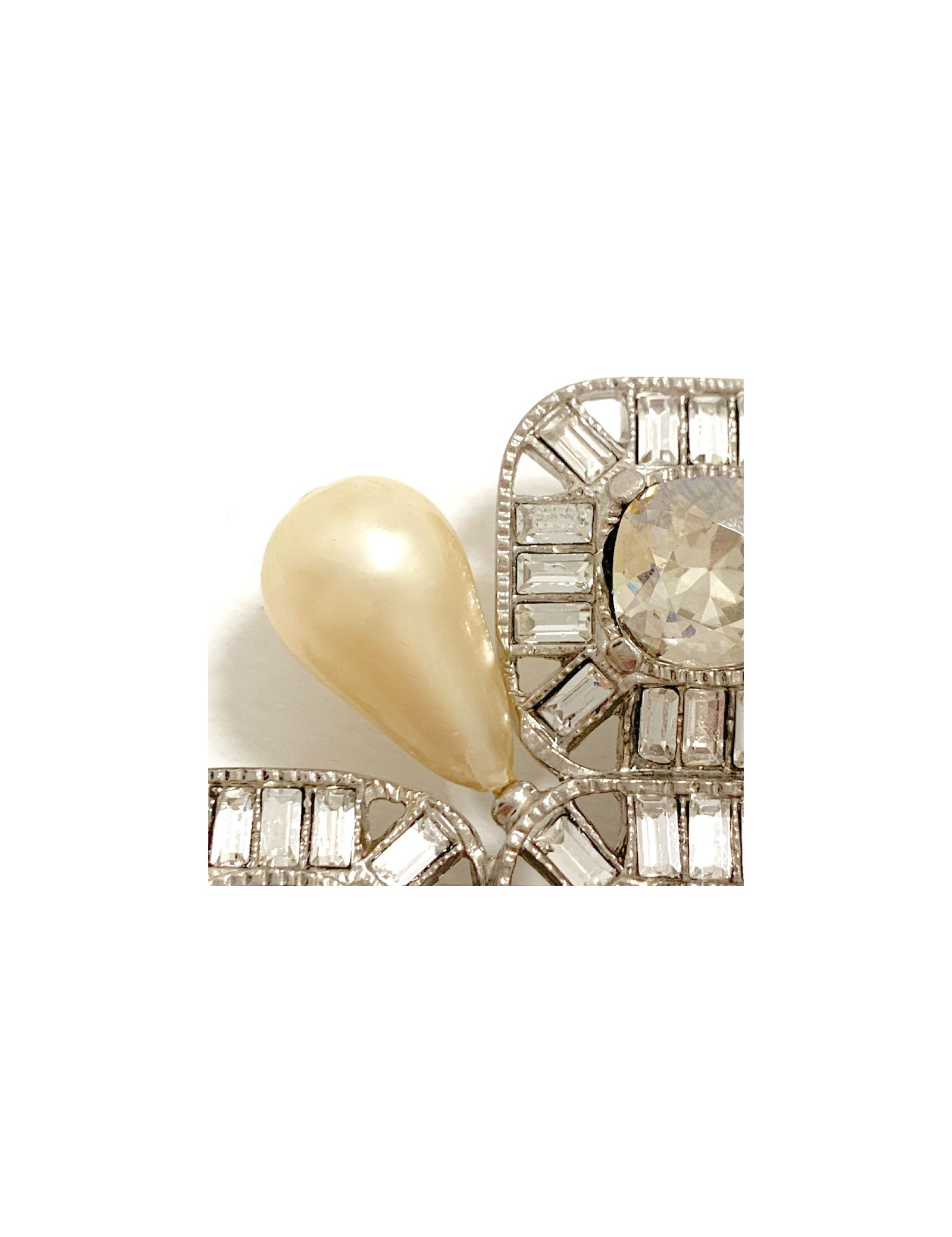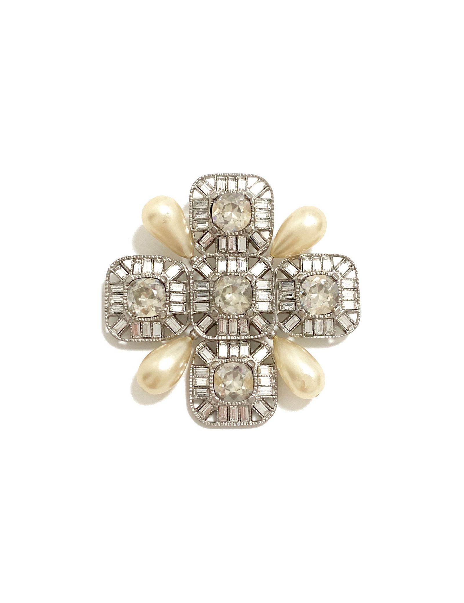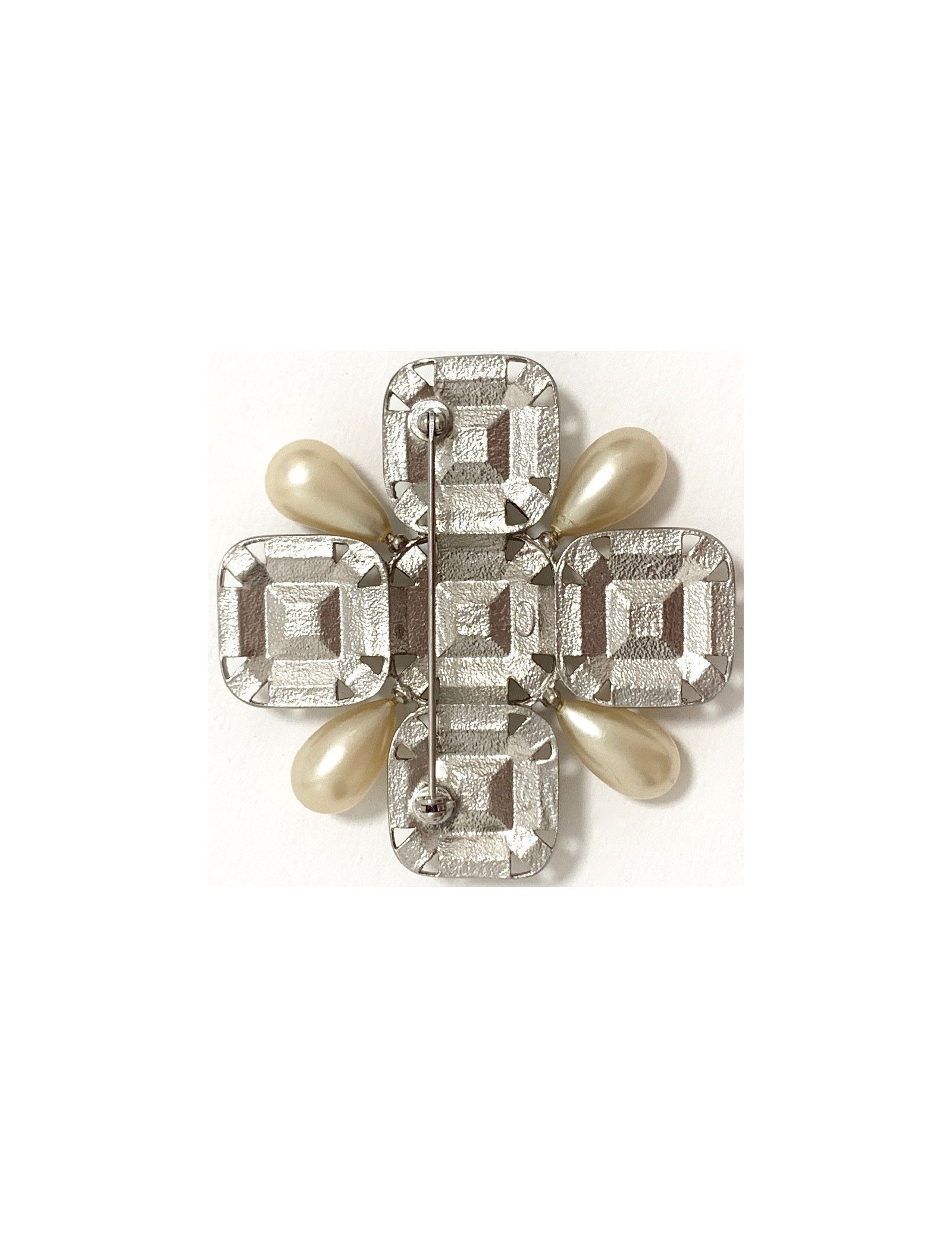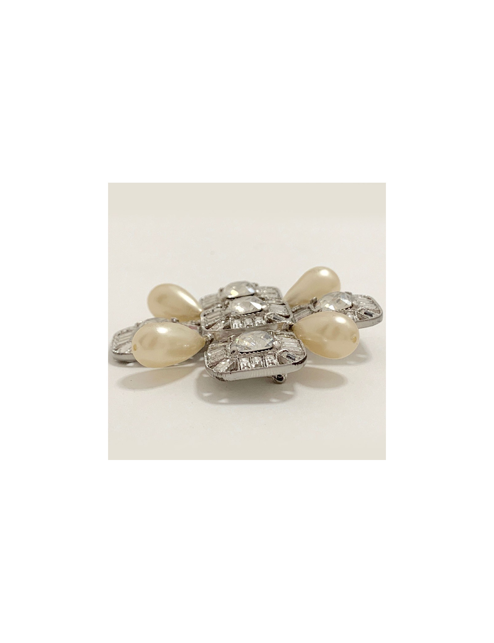 Cross-shaped brooch set with Swarovski baguette and square crystals. 4 drop-shaped pearls at each end.