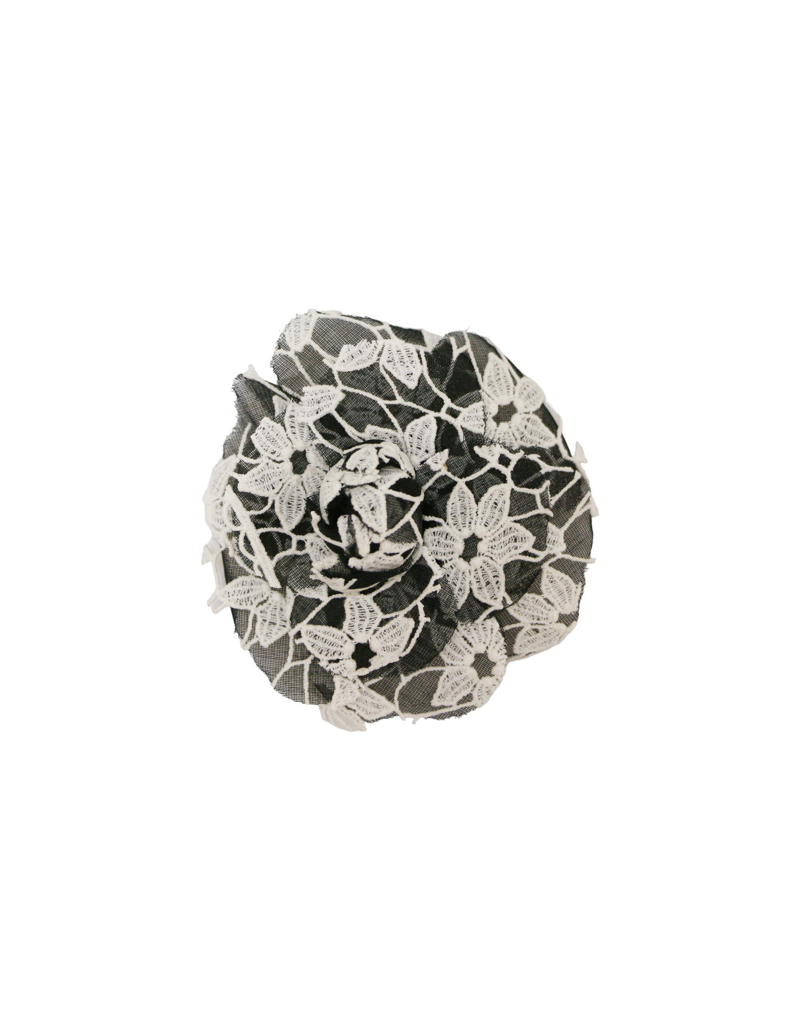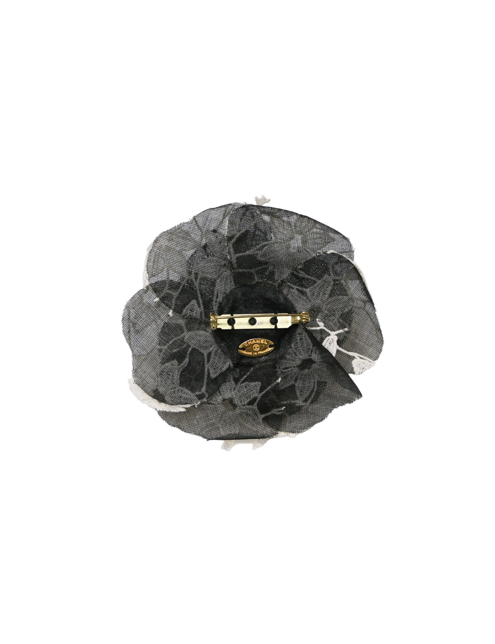 Details : Vintage camellia brooch in black tulle and white cotton lace featuring a camellia, Gabrielle Chanel's favorite flower.